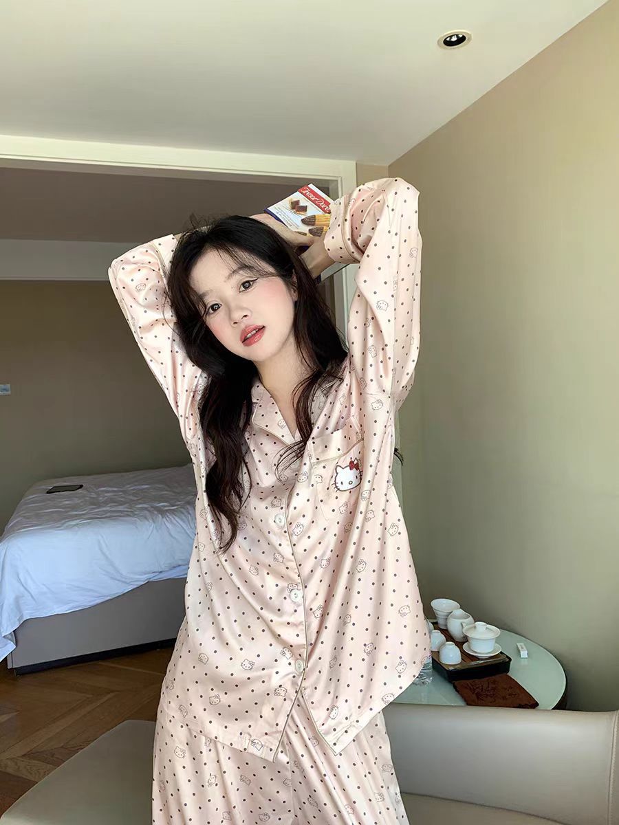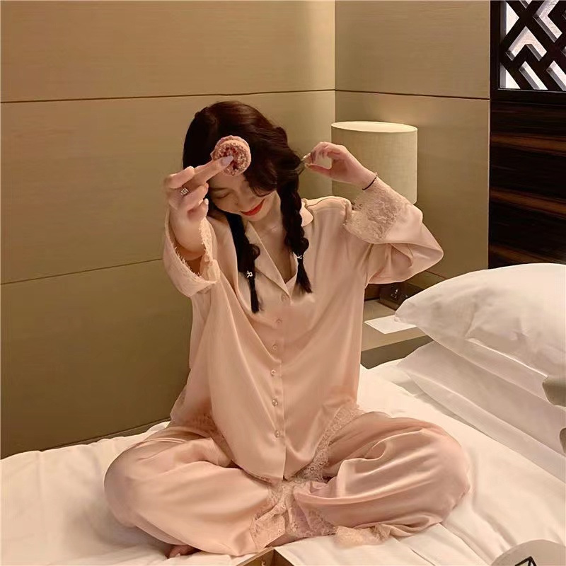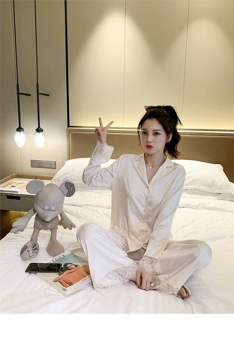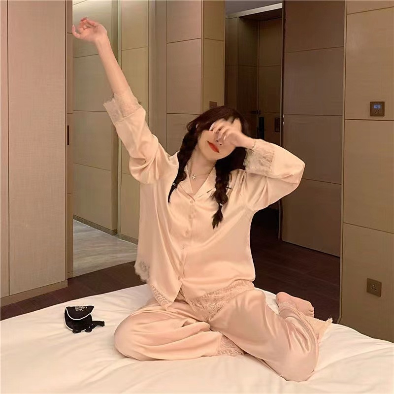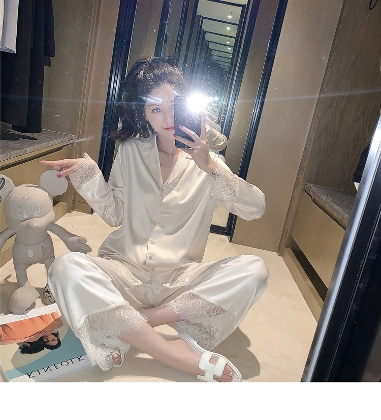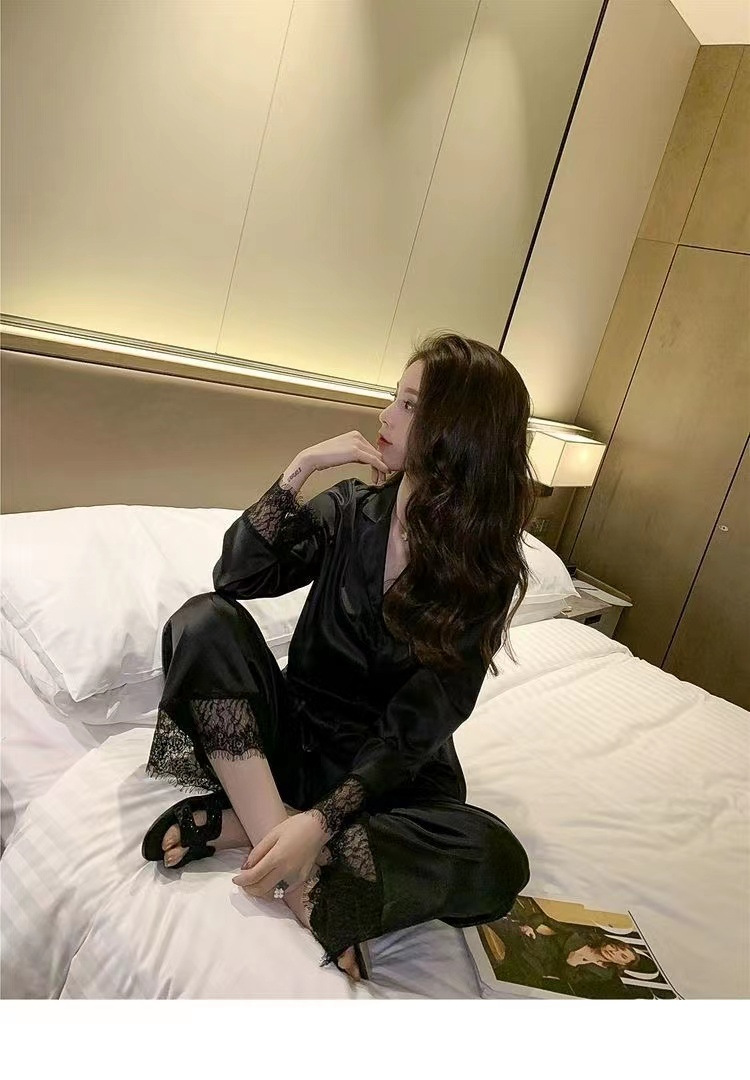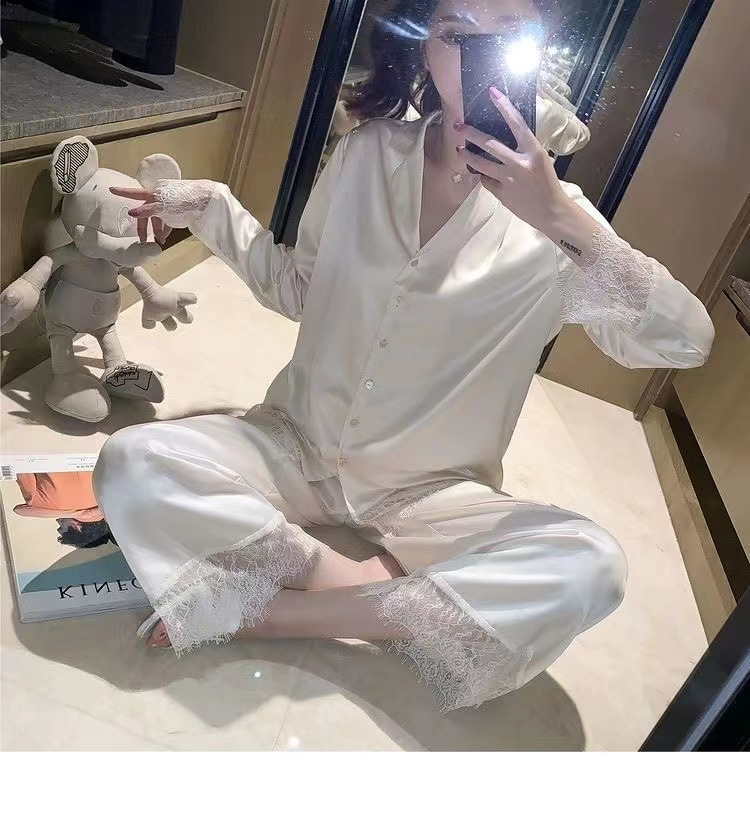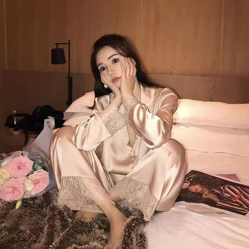 2025 새로운 스타일 잠옷 여성의 봄과 가을 긴 소매 바지 레이스 카디건 달콤한 공주 스타일 아이스 실크 얇은 투피스 세트