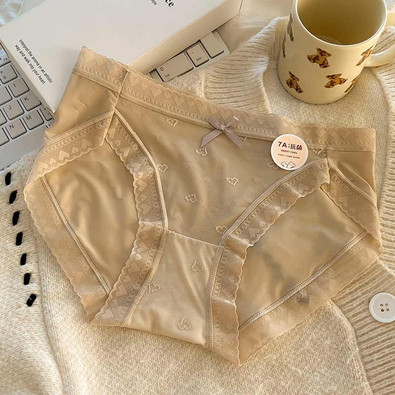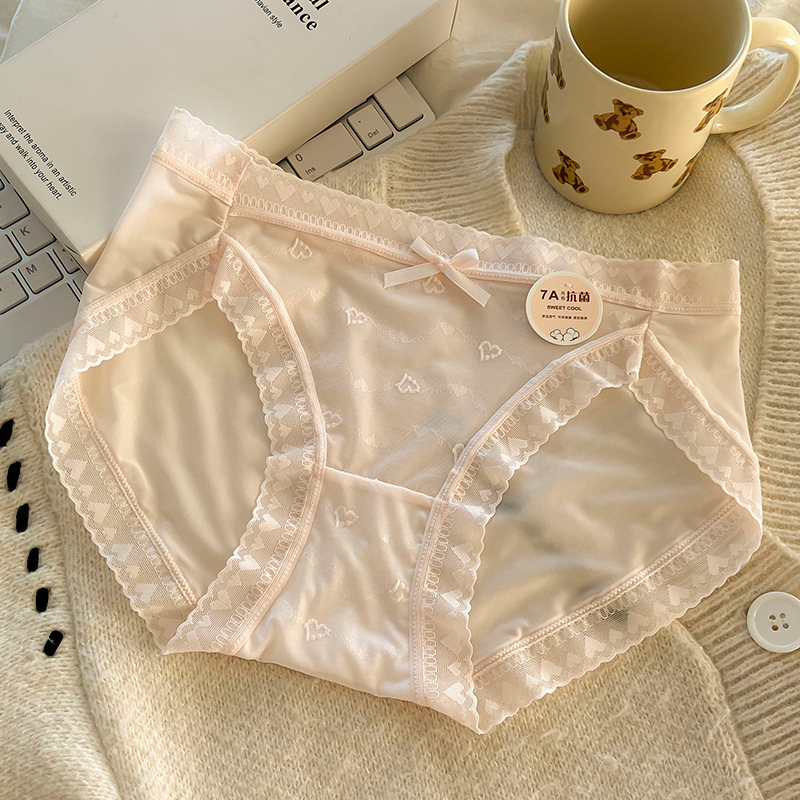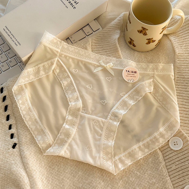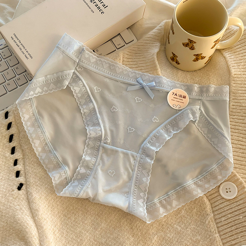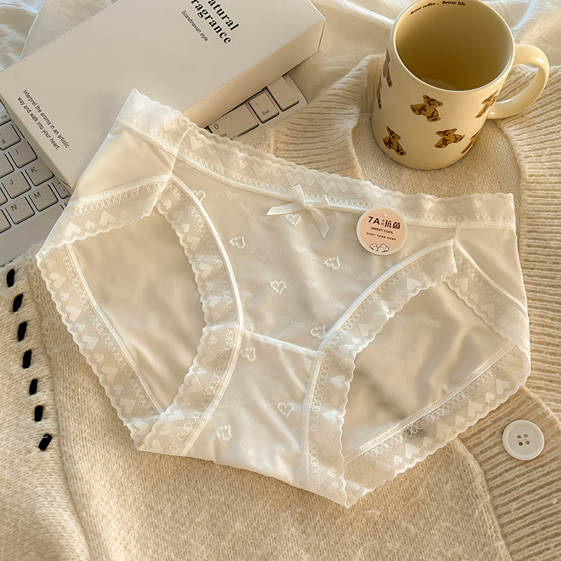 새로운 Traceless 7A 항균 순수 코튼 Crotch 달콤한 하이 스플릿 메쉬 거즈 소녀의 미드 허리 피부 친화적 인 브리프 여성 속옷스토어 가기