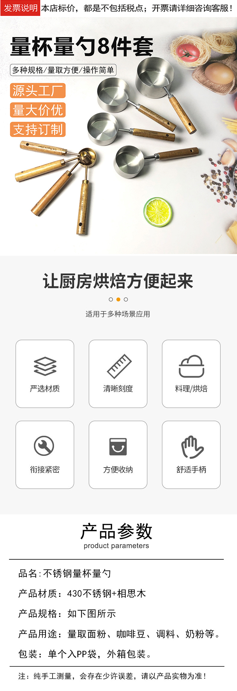 스테인레스 스틸 측정 컵 측정 스푼 8 피스 세트 아카시아 나무 손잡이 측정 컵 측정 스푼 베이킹 도구 4 피스 세트 도매