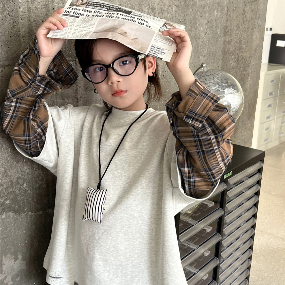 2026년 봄 아동용 페이크 투피스 이너웨어 레트로 컬리지 스타일 패턴 소매 핸드페인팅 남아용 긴팔 티셔츠스토어 가기