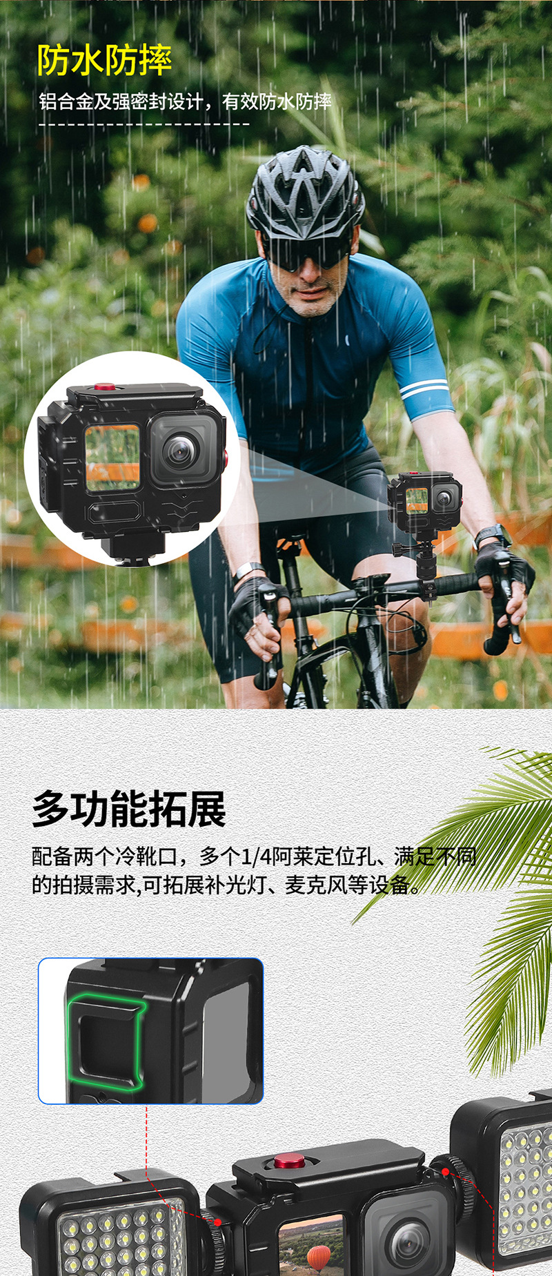 B.铝合金外壳与高透高强度钢化玻璃,坚固耐用,无论是陆地还是深海,都能有效保护相机;