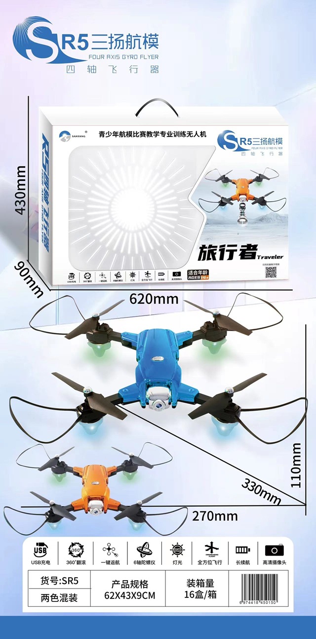 • SR5 광학 흐름 포지셔닝 + 전자적으로 조정 가능한 듀얼 카메라 드론(파란색과 주황색 혼합)