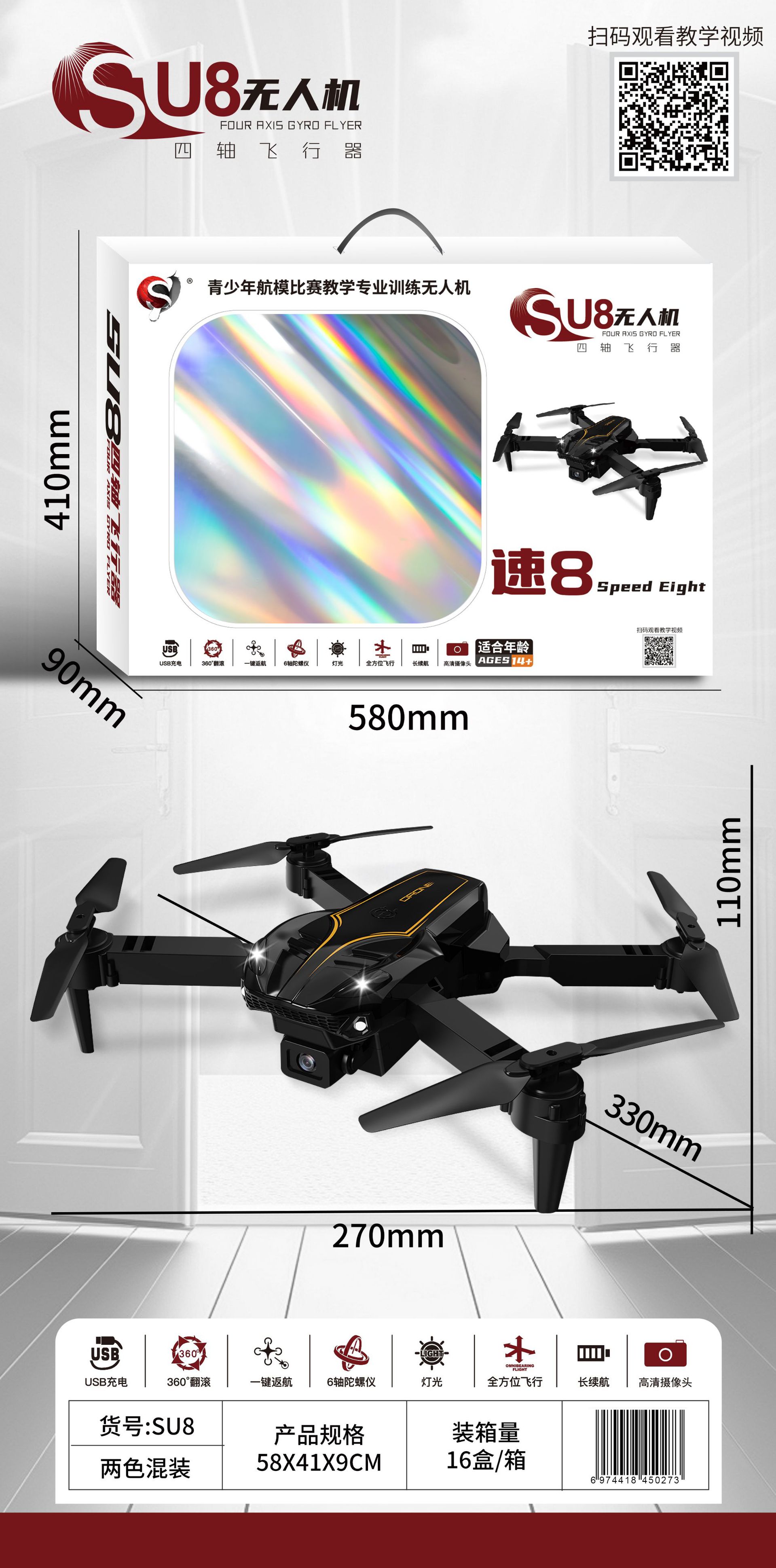 • Su8 단일 카메라 드론(검정색과 회색 혼합)
