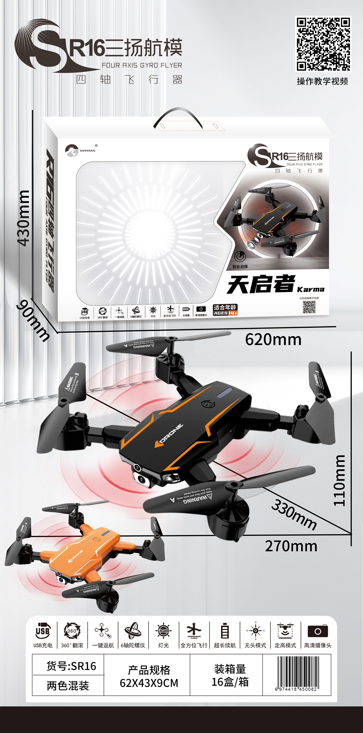 • SR16 장애물 회피 단일 카메라 드론(주황색 및 검정색 혼합)