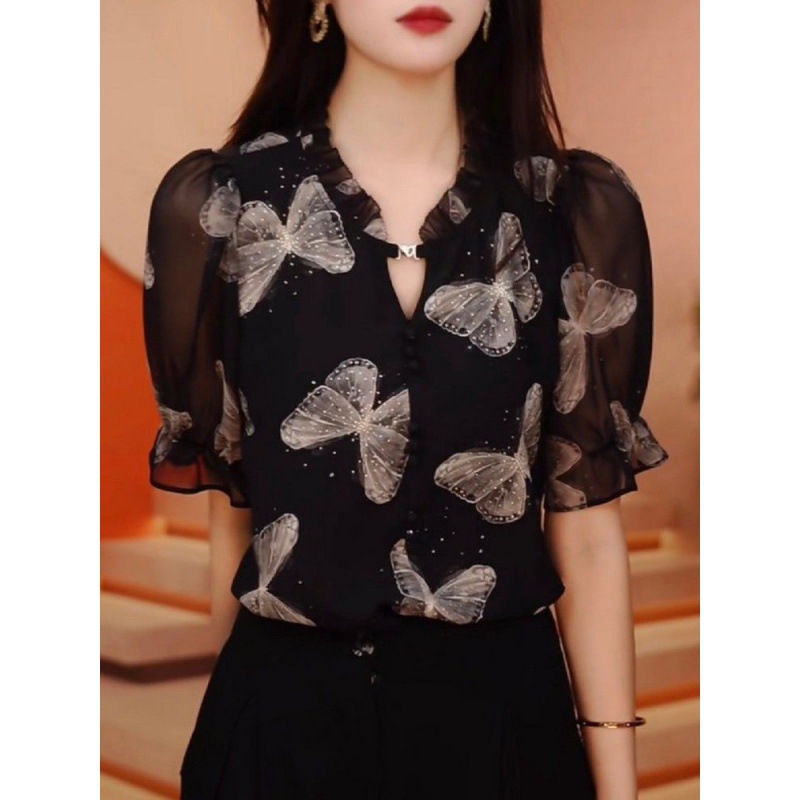 Auriculata 인쇄 쉬폰 작은 셔츠 여성의 2024 여름 새로운 하이 엔드 라이트 럭셔리 웨스턴 스타일 나이 감소 세련된 아름다운 탑