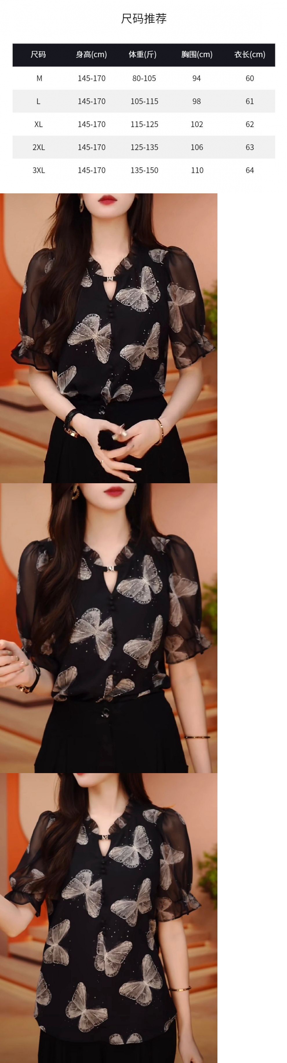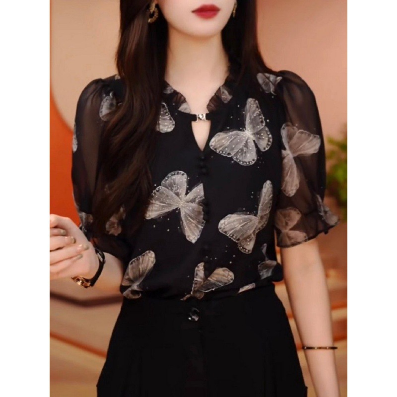 Auriculata 인쇄 쉬폰 작은 셔츠 여성의 2024 여름 새로운 하이 엔드 라이트 럭셔리 웨스턴 스타일 나이 감소 세련된 아름다운 탑스토어 가기