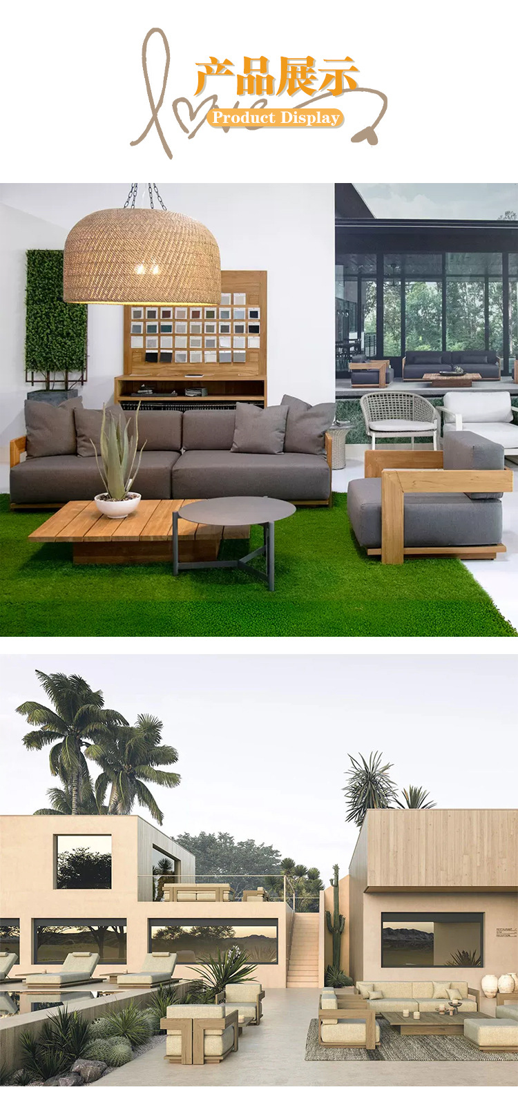 야외 소파 조합 알루미늄 합금 방수 선 스크린 티크 커피 테이블 북유럽 레저 호텔 가든 빌라 안뜰