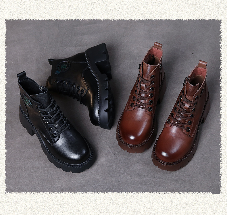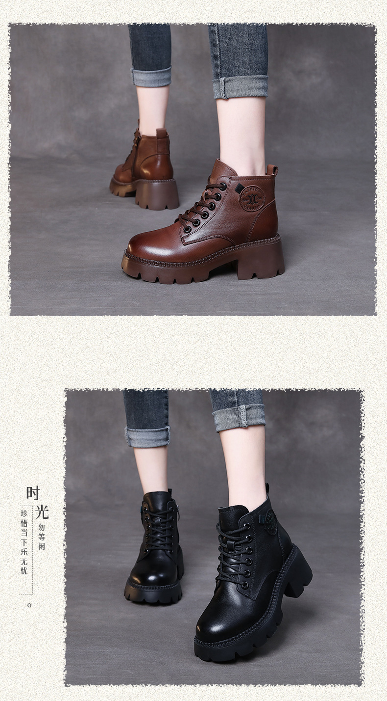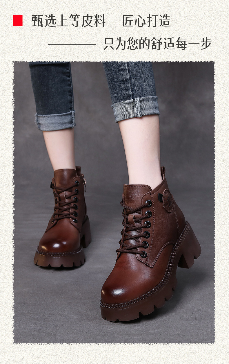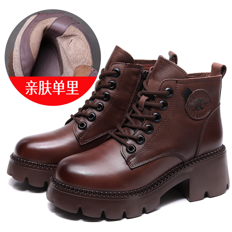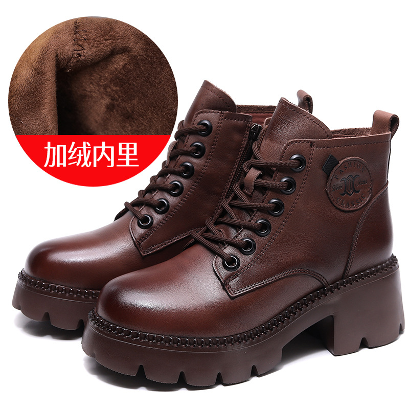 탑 레이어 소 가죽 레이스 업 여성용 가을 및 겨울 새로운 빈티지 정품 가죽 코튼 부츠 여성의 두꺼운 힐 머핀 싱글 부츠 마틴 부츠스토어 가기