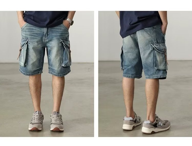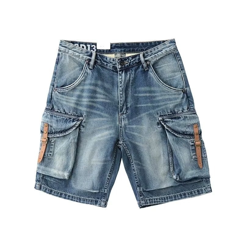 아메리칸 스타일 헤비 멀티 포켓 툴링 데님 반바지 남성용 루즈 스트레이트 캐주얼 레트로 오토바이 유행 5 점 바지