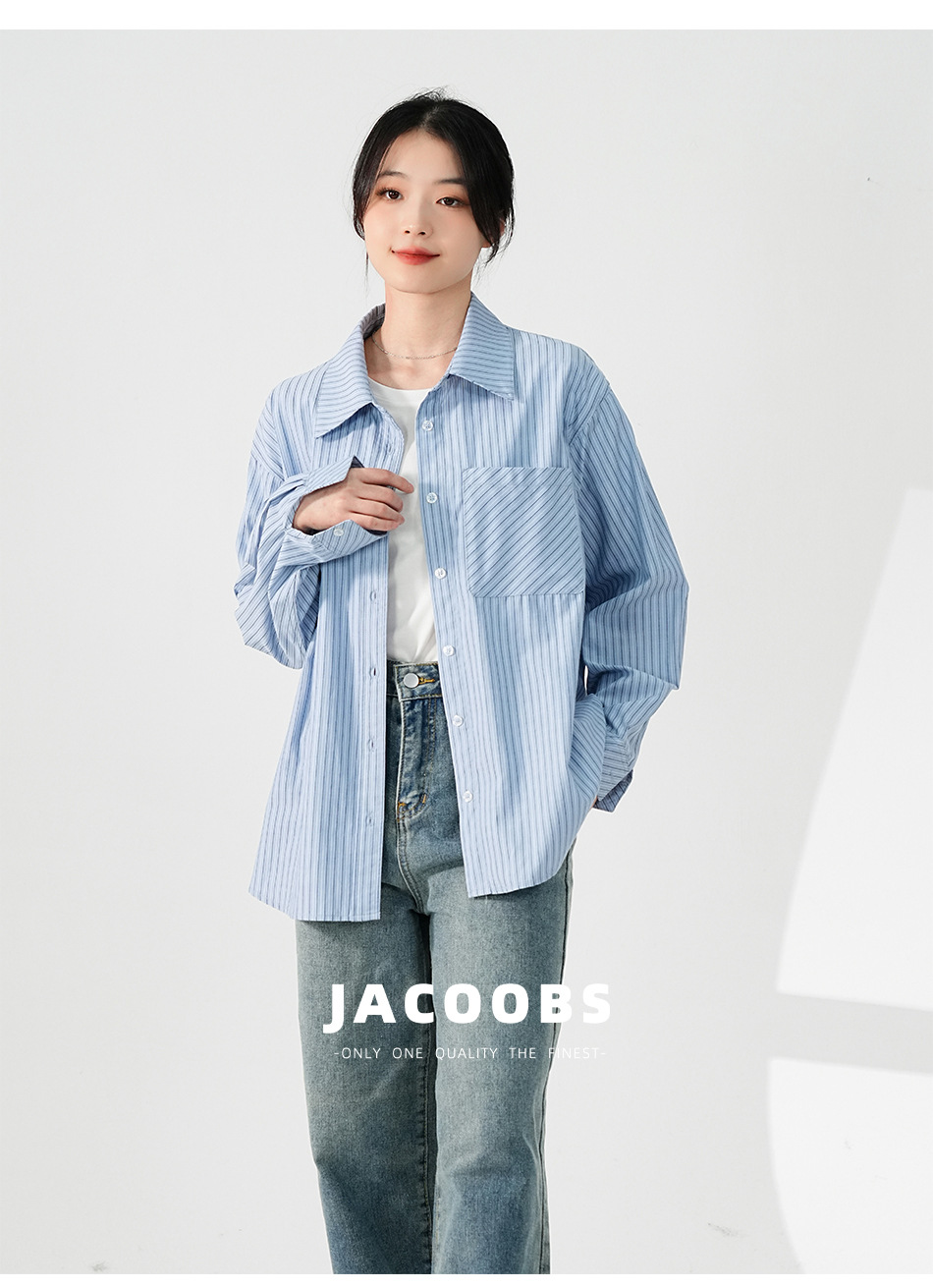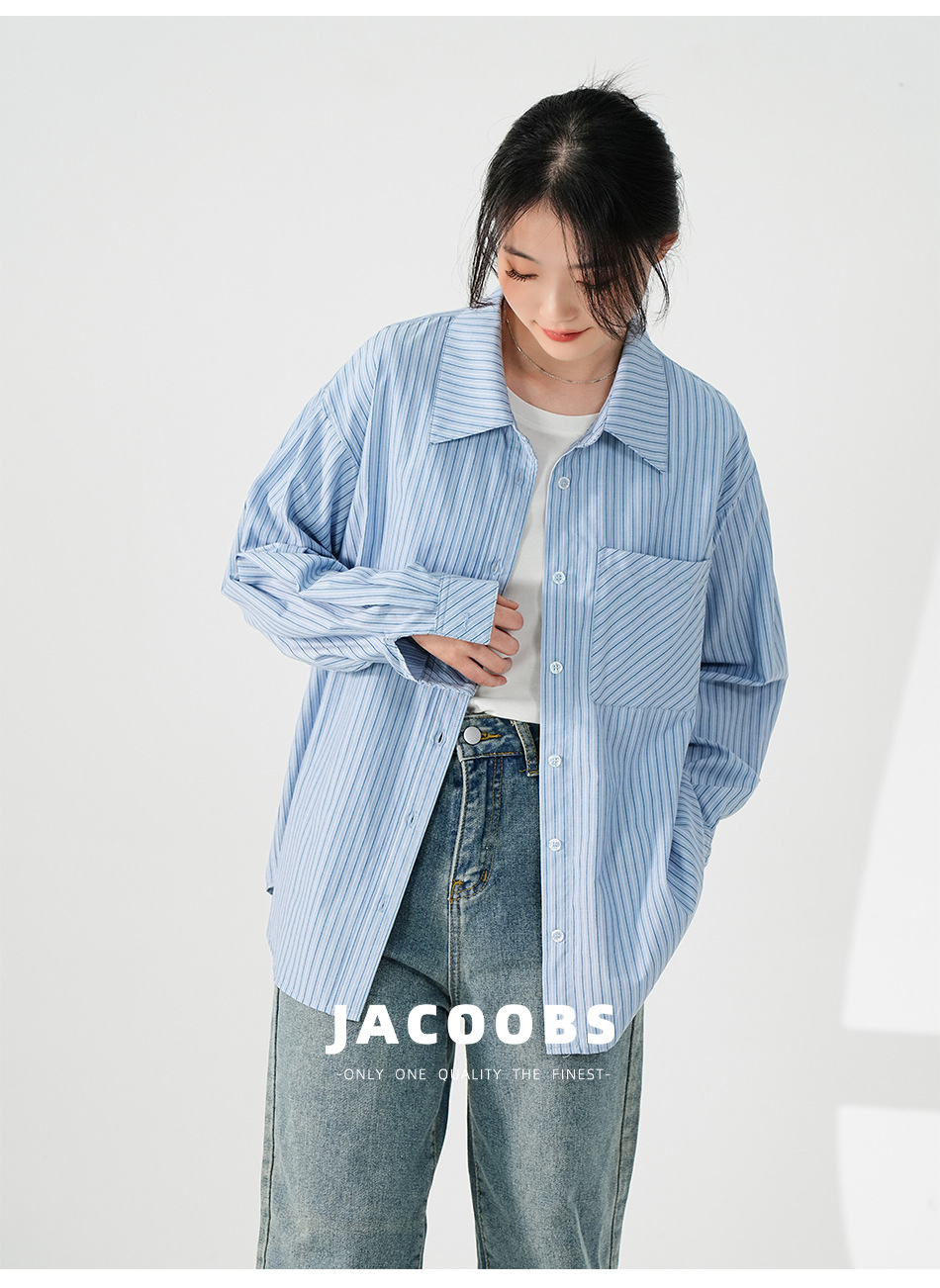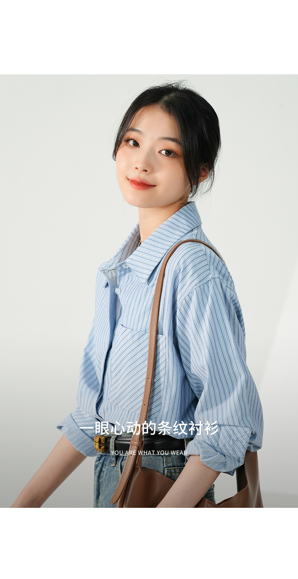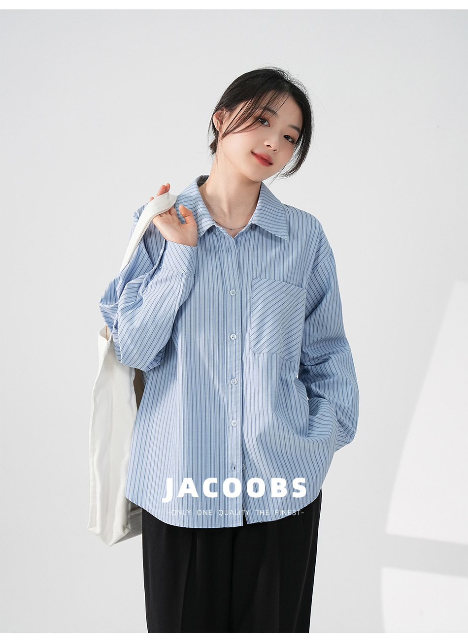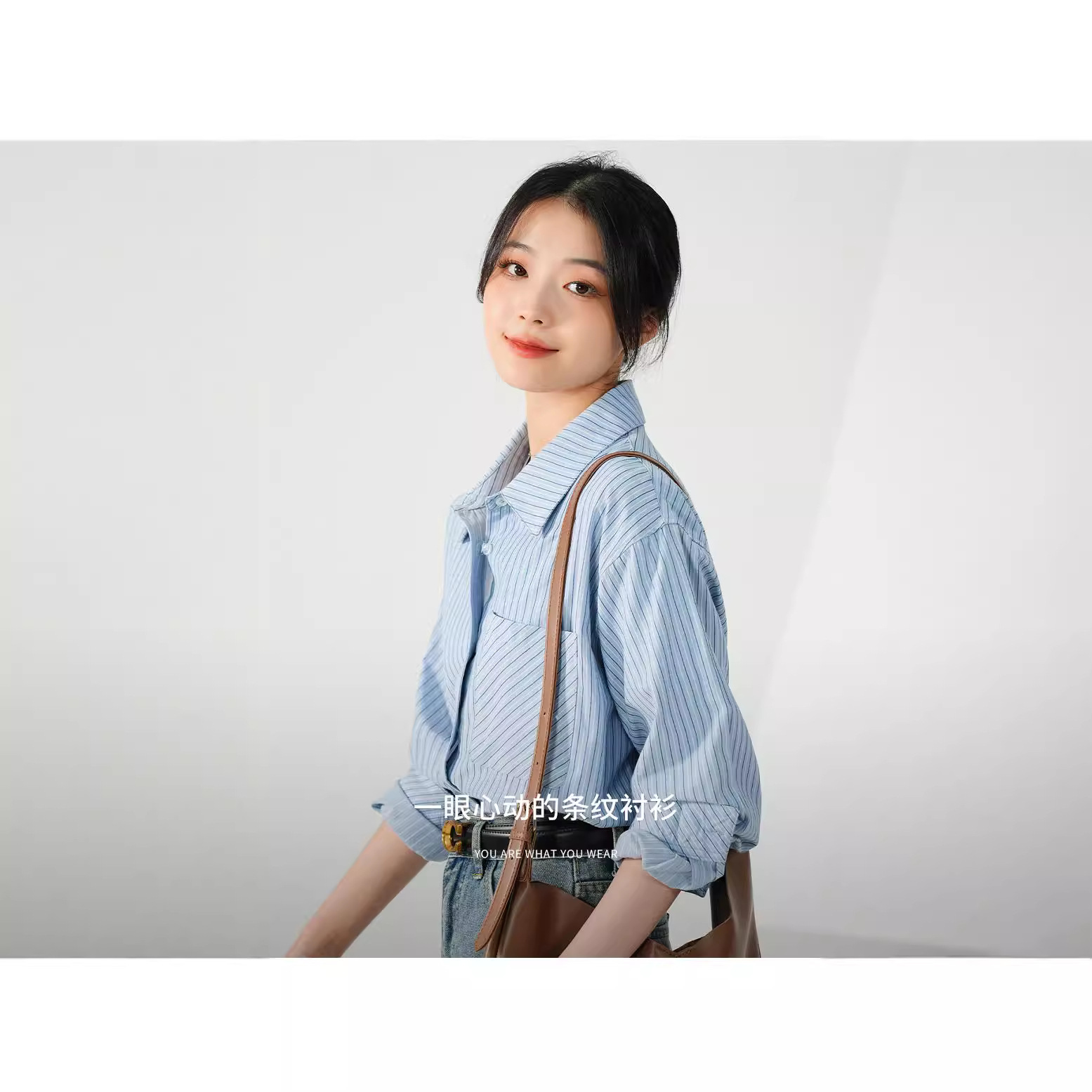 블루 스트라이프 셔츠 여성의 봄과 가을 디자인 센스 틈새 OL 전문 통근자 스택 셔츠 디자인 감각스토어 가기