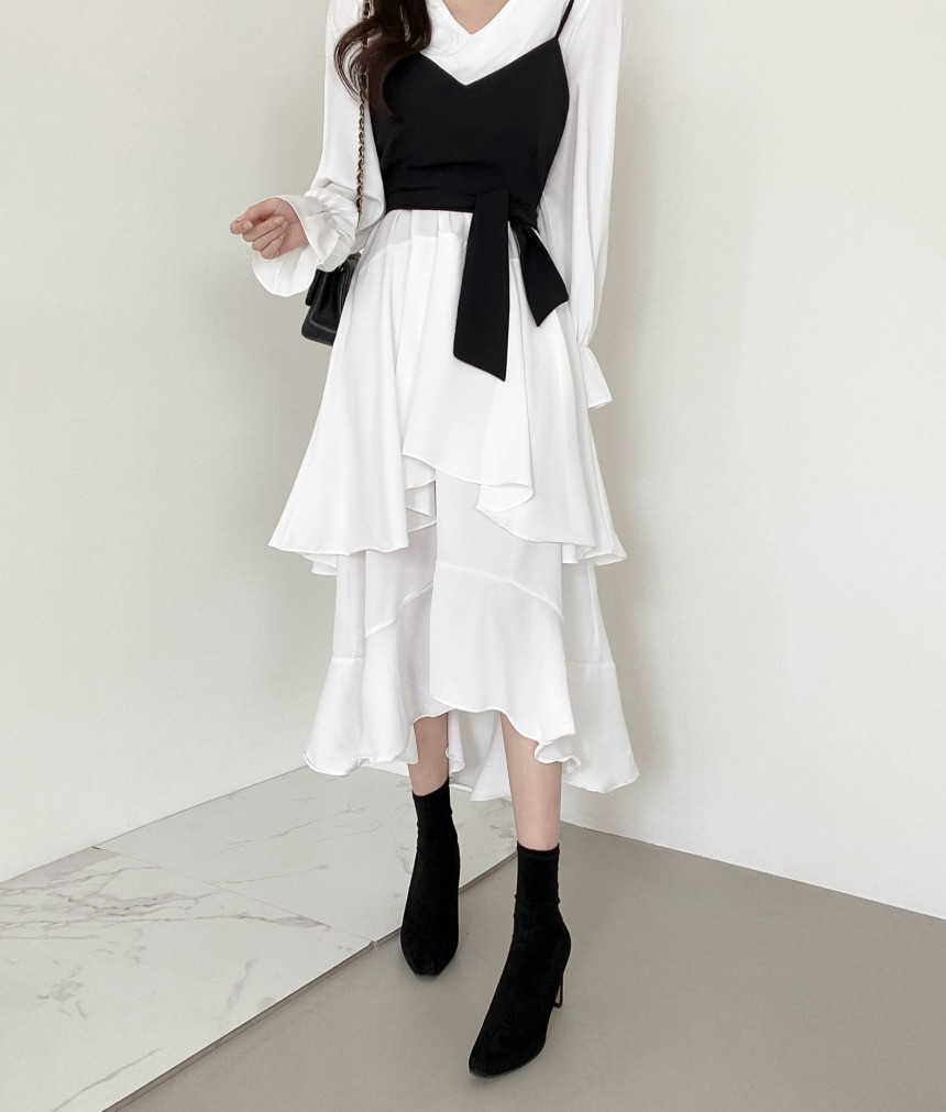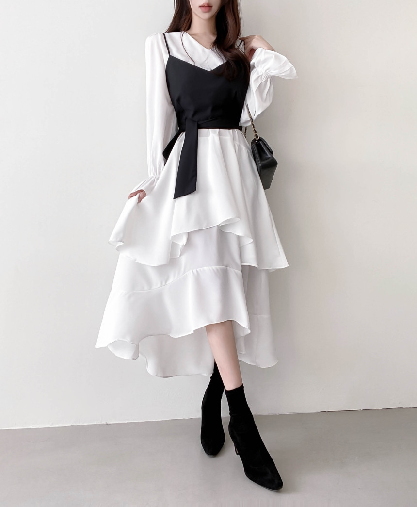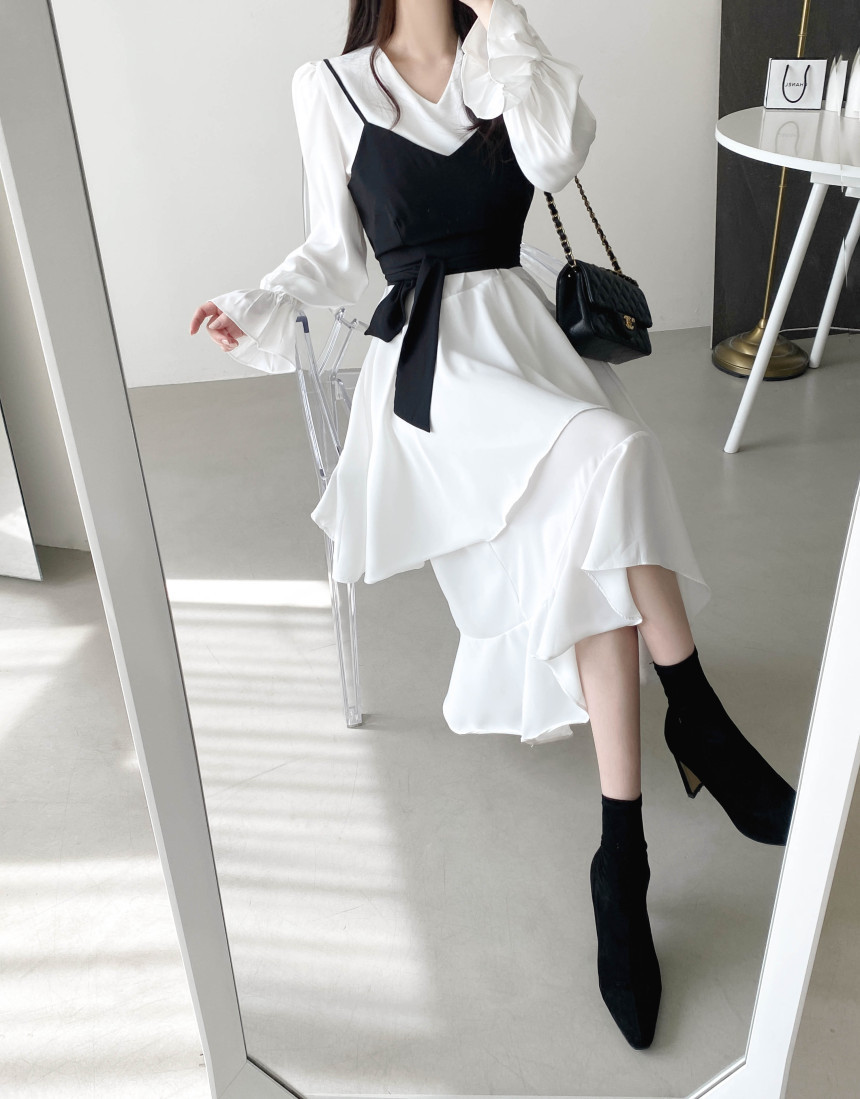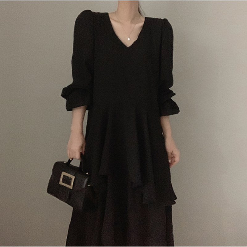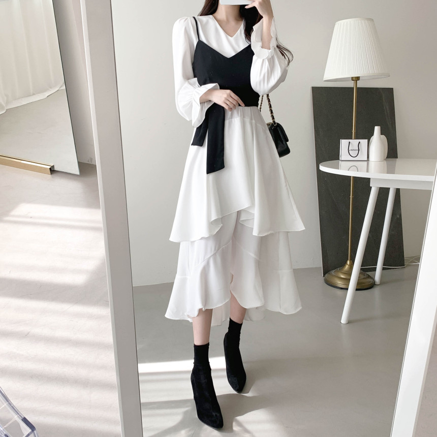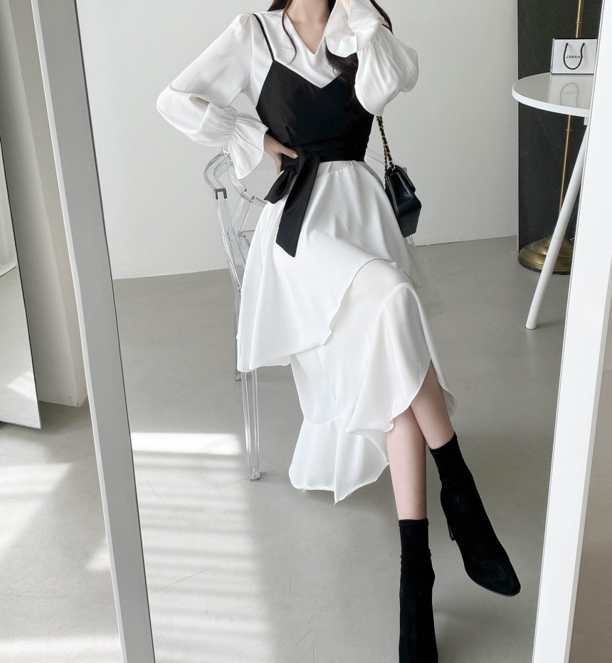 한국 세련된 우아한 슬림 핏 타이트 밴드 Camisole V 넥 불규칙한 뿔 슬리브 원피스 여성을위한 긴 원피스스토어 가기