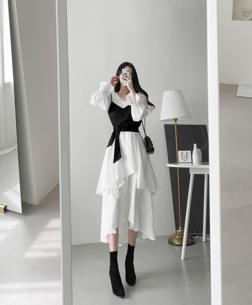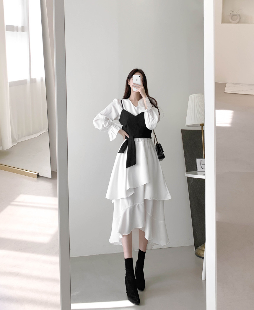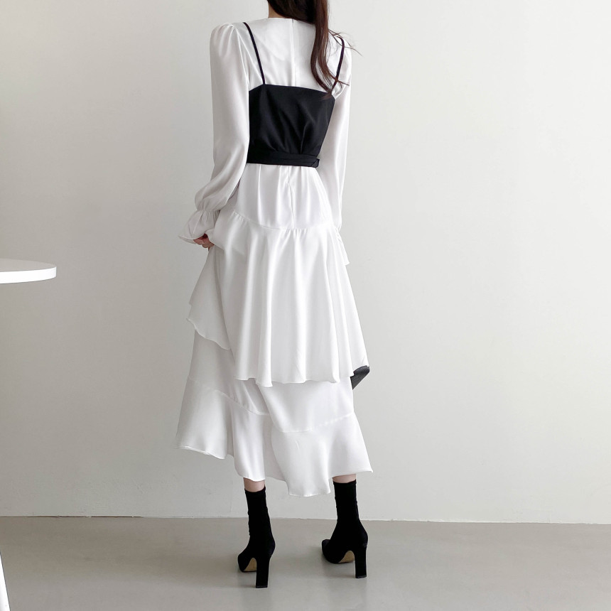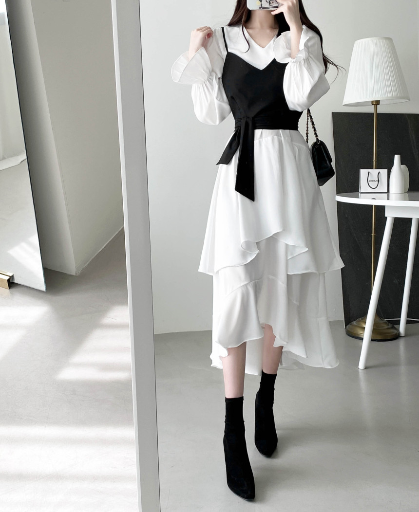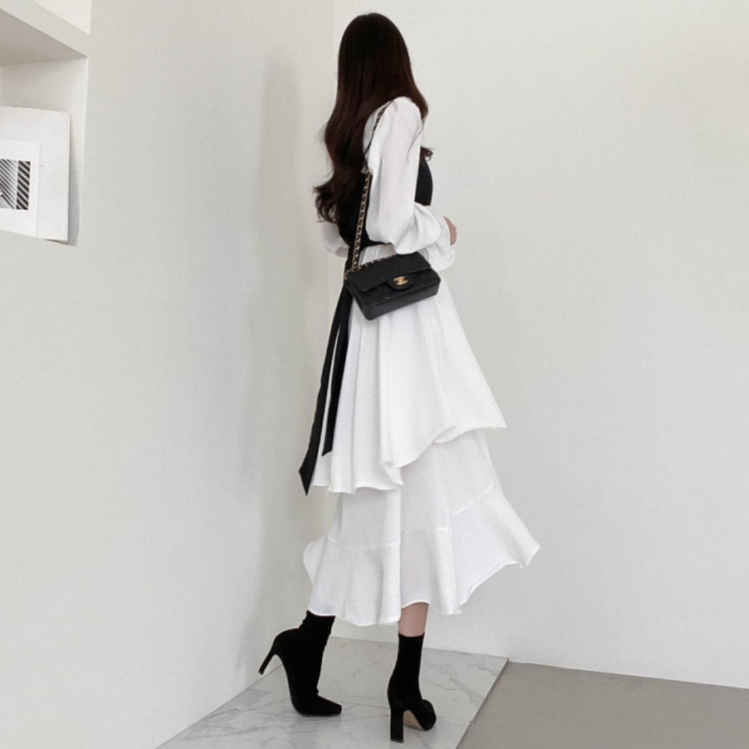 한국 세련된 우아한 슬림 핏 타이트 밴드 Camisole V 넥 불규칙한 뿔 슬리브 원피스 여성을위한 긴 원피스스토어 가기