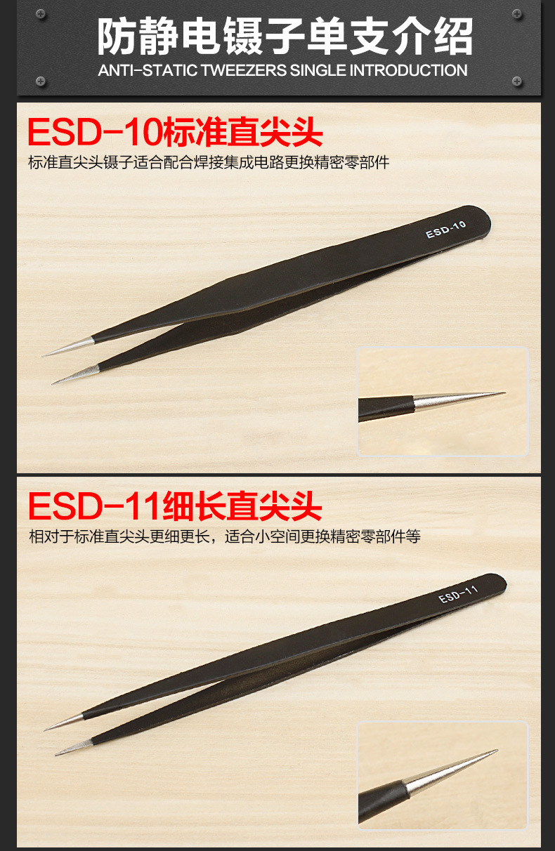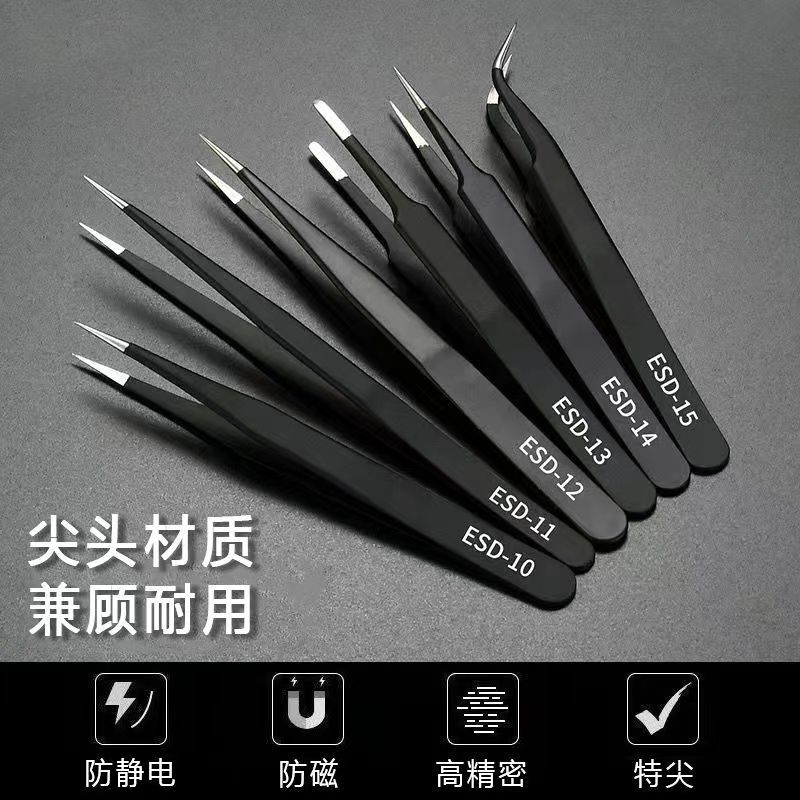ESD-12:此镊子强力夹电路板时镊子不会弯曲,部件也不会掉落。