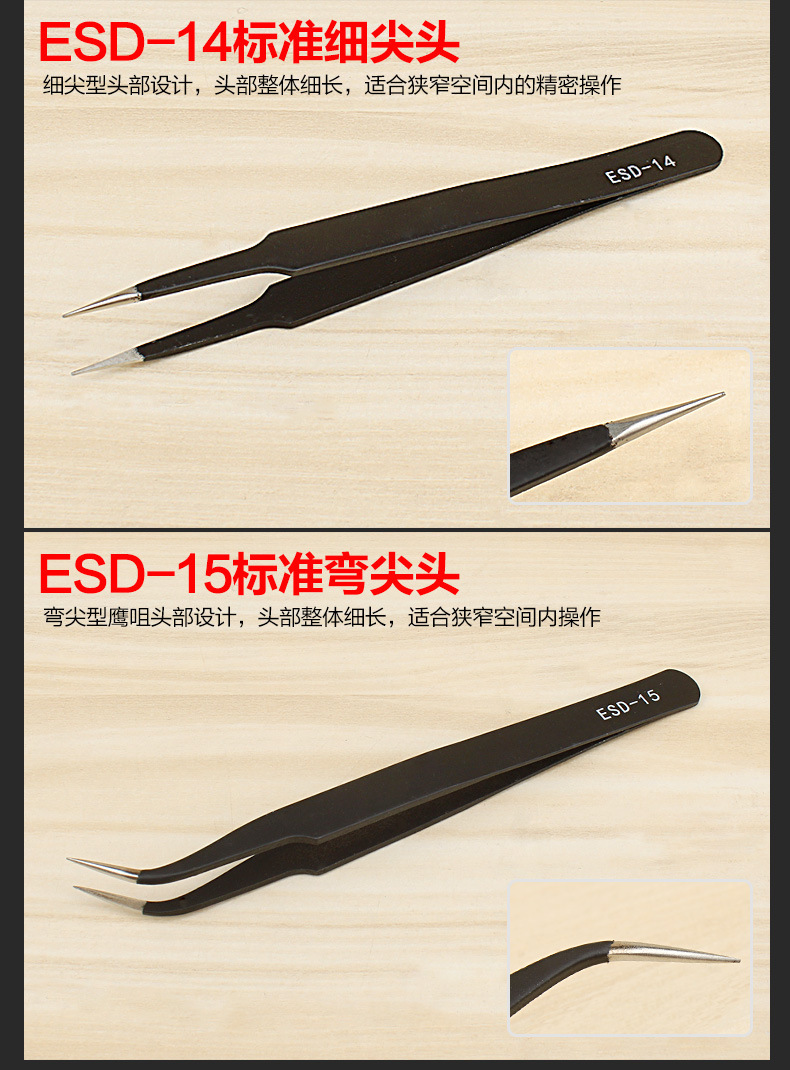 ESD-14:此镊子咀边锋利,适用于高密度集成电路片的足见中操作