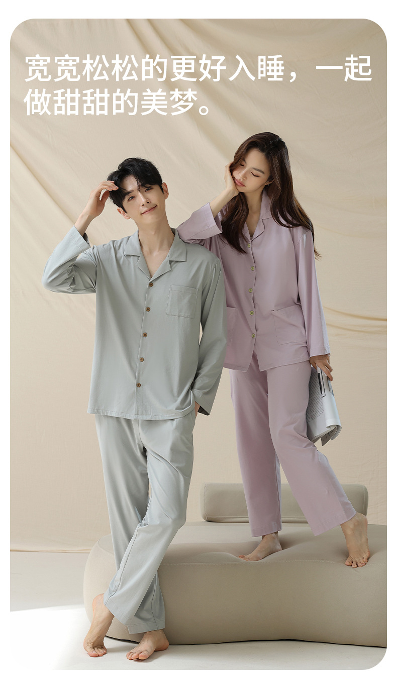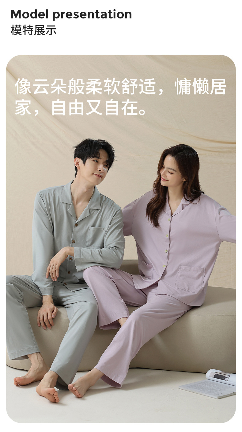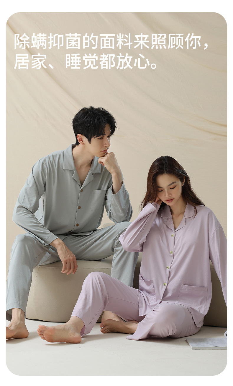 [항균면] 가슴 패드가 있는 잠옷, A형 진드기 방지 및 항균 잠옷, 여성용 가을 순면 커플 잠옷, 홈웨어