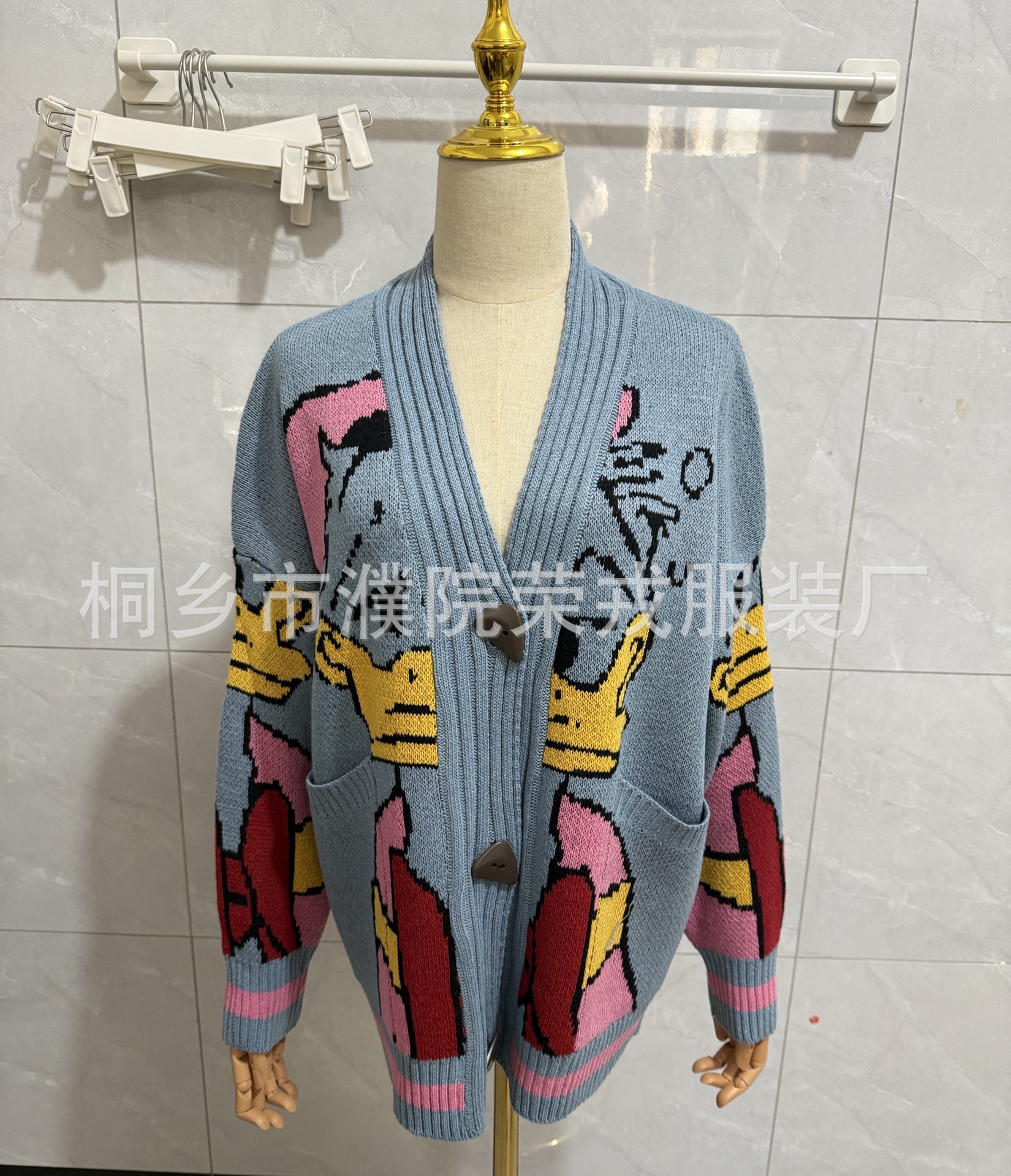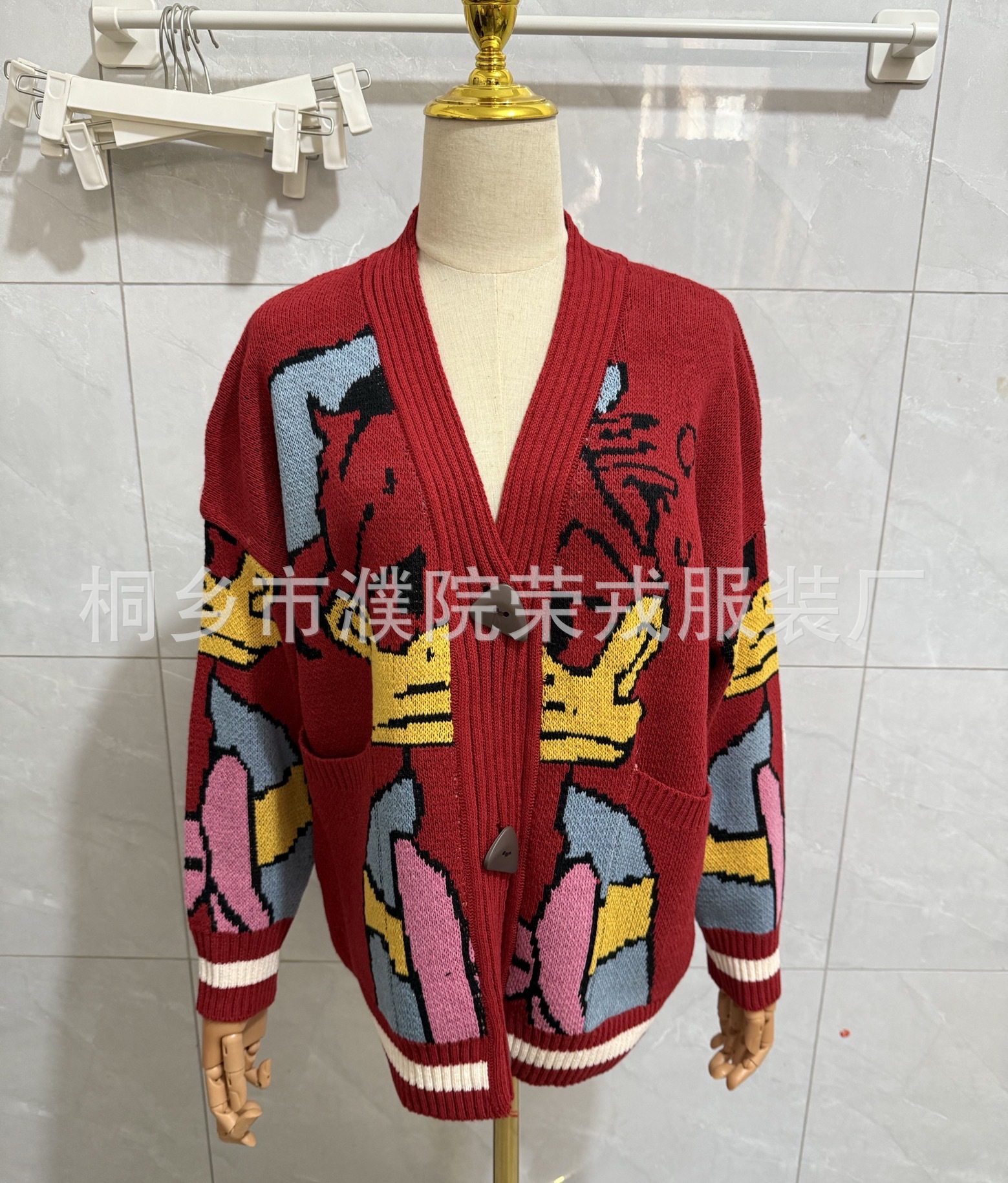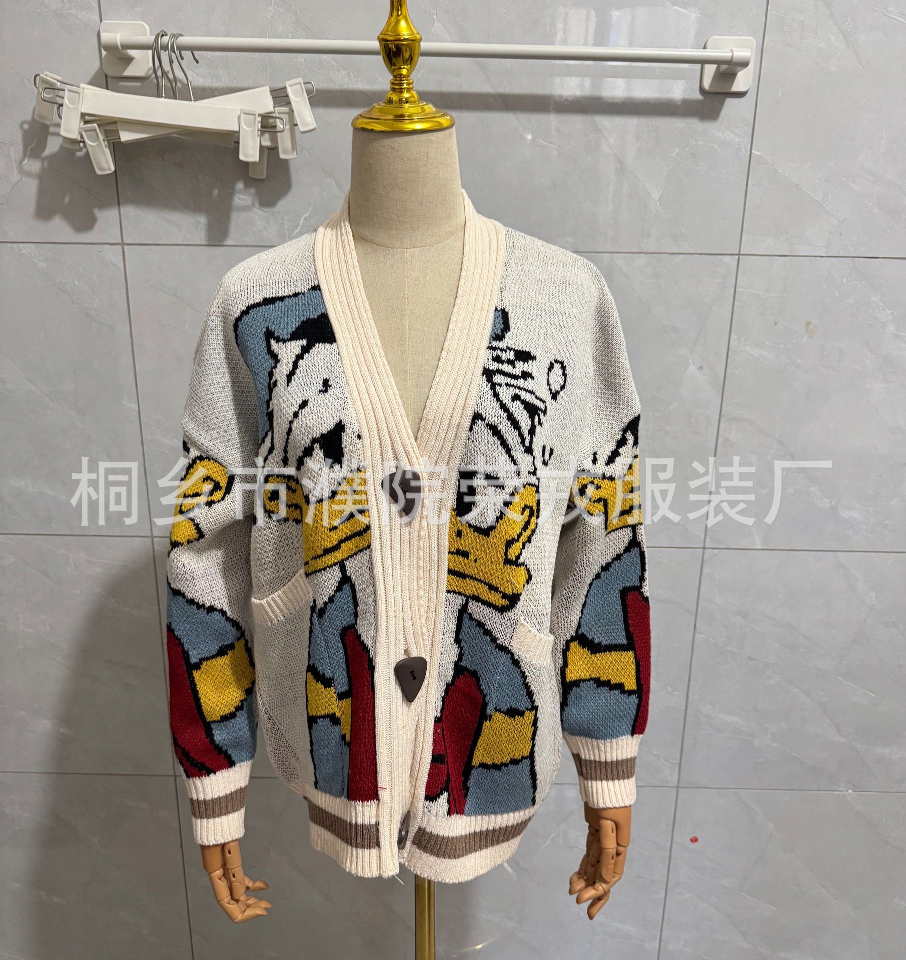 여성을위한 일본 만화 자카드 스웨터 재킷 가을, 겨울 여성 게으른 스타일 느슨한 겉옷 다목적 니트 카디건