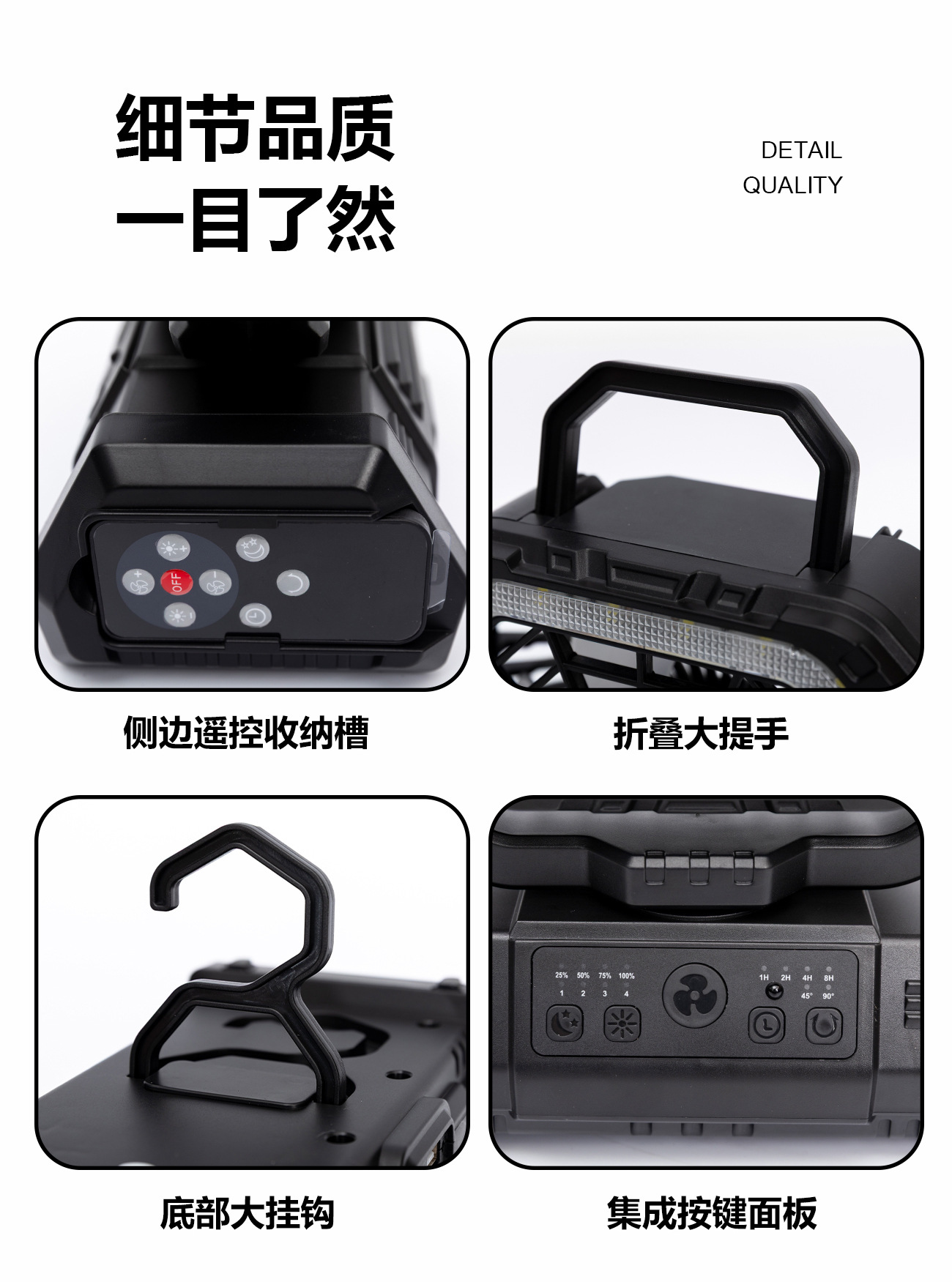 산악객 야외용 휴대용 4단계 원격 제어 충전식 캠핑 테이블 팬, 다기능 조명 기능 포함