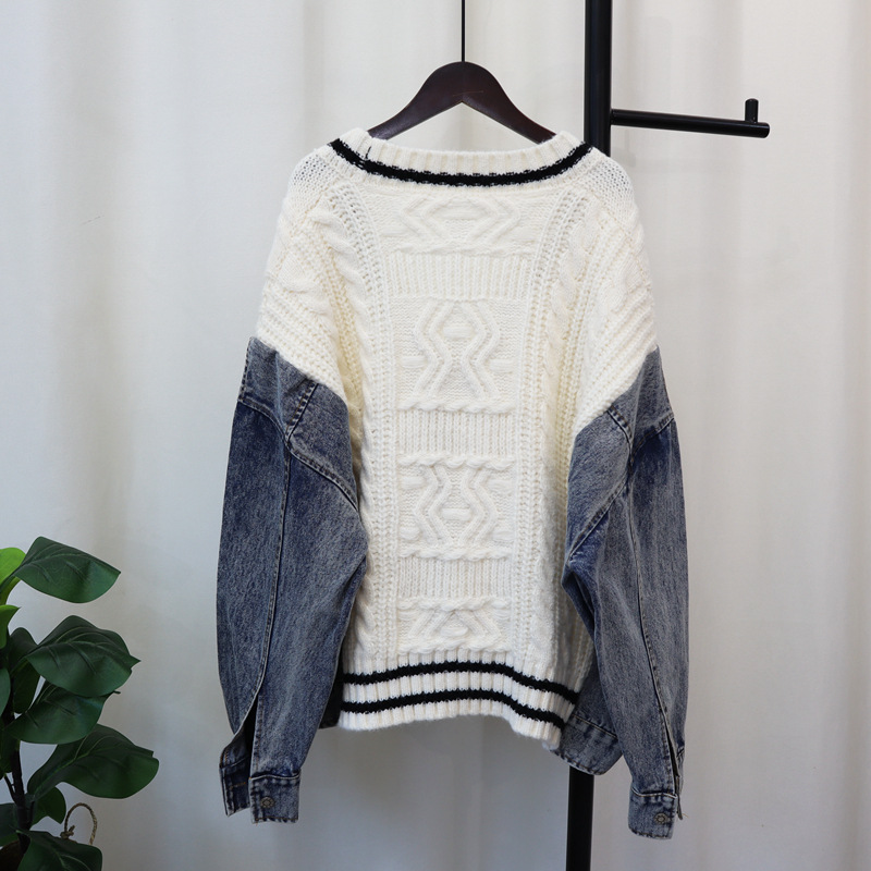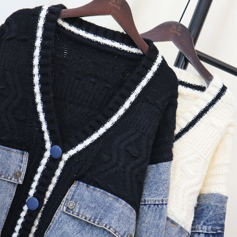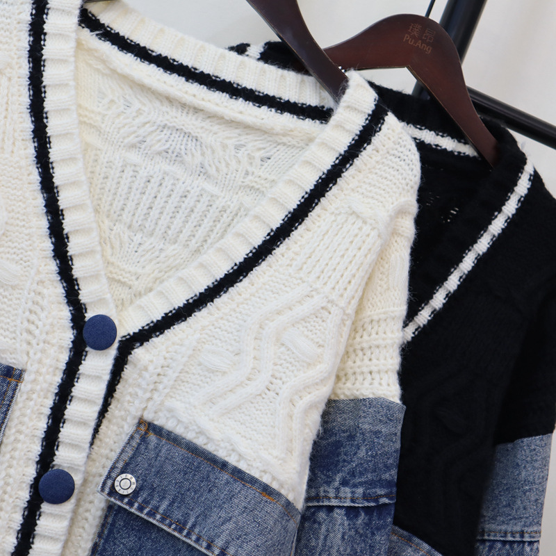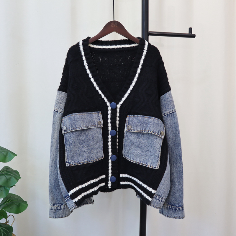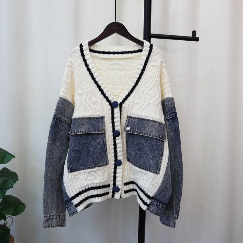 유럽 스타일 데님 스플라이스 니트 가디건 2025 가을 겨울 신상 루즈 캐주얼 다용도 레이지 스웨터 재킷 여성용스토어 가기