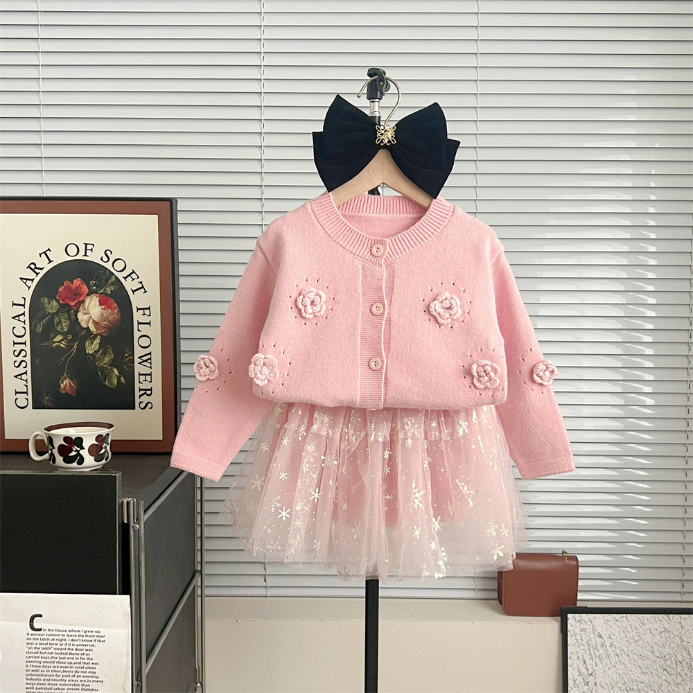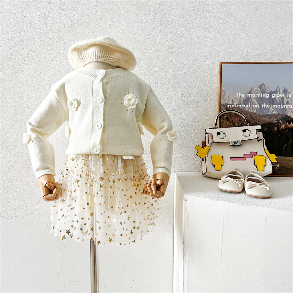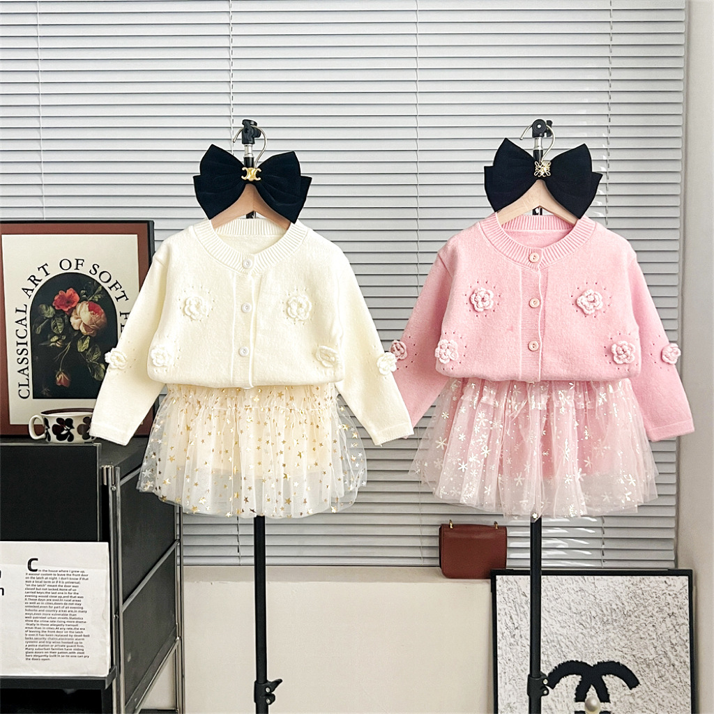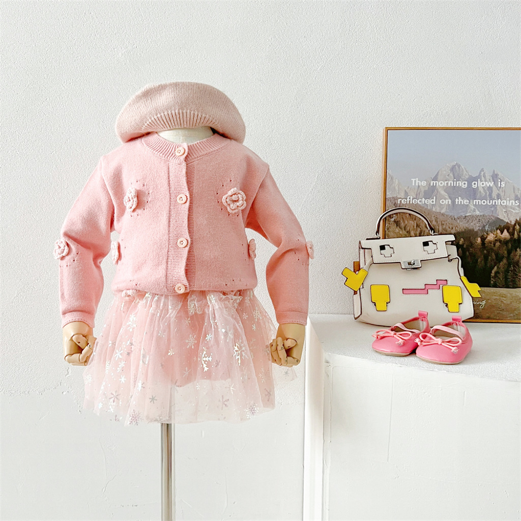 2024 가을과 겨울 새로운 소녀 수제 꽃 니트 카디건 가을과 겨울 새로운 아기 단색 양모 탑 거즈 스커트스토어 가기