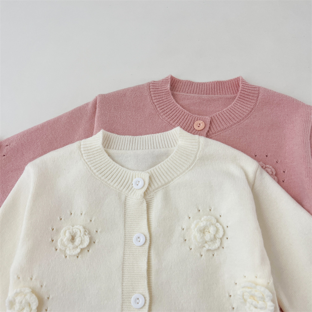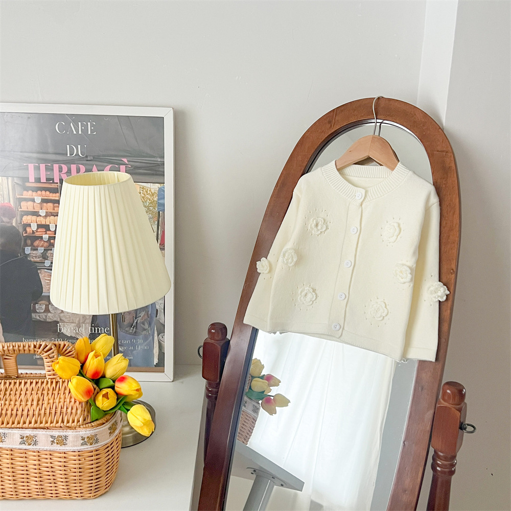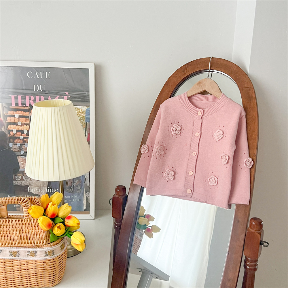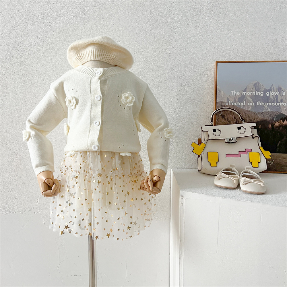 2024 가을과 겨울 새로운 소녀 수제 꽃 니트 카디건 가을과 겨울 새로운 아기 단색 양모 탑 거즈 스커트스토어 가기