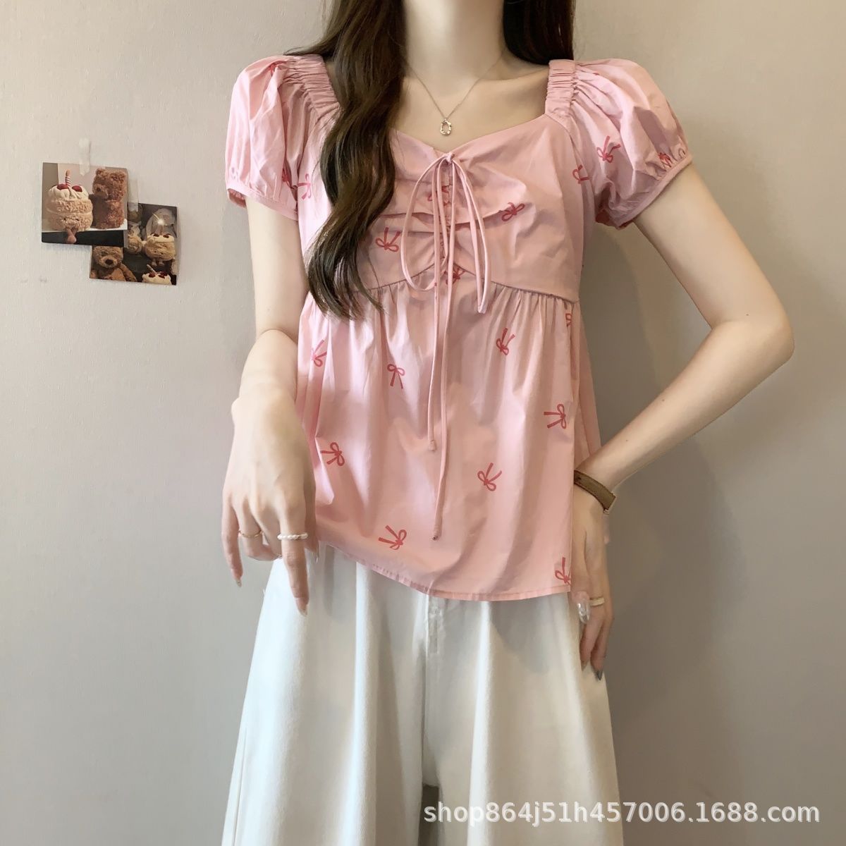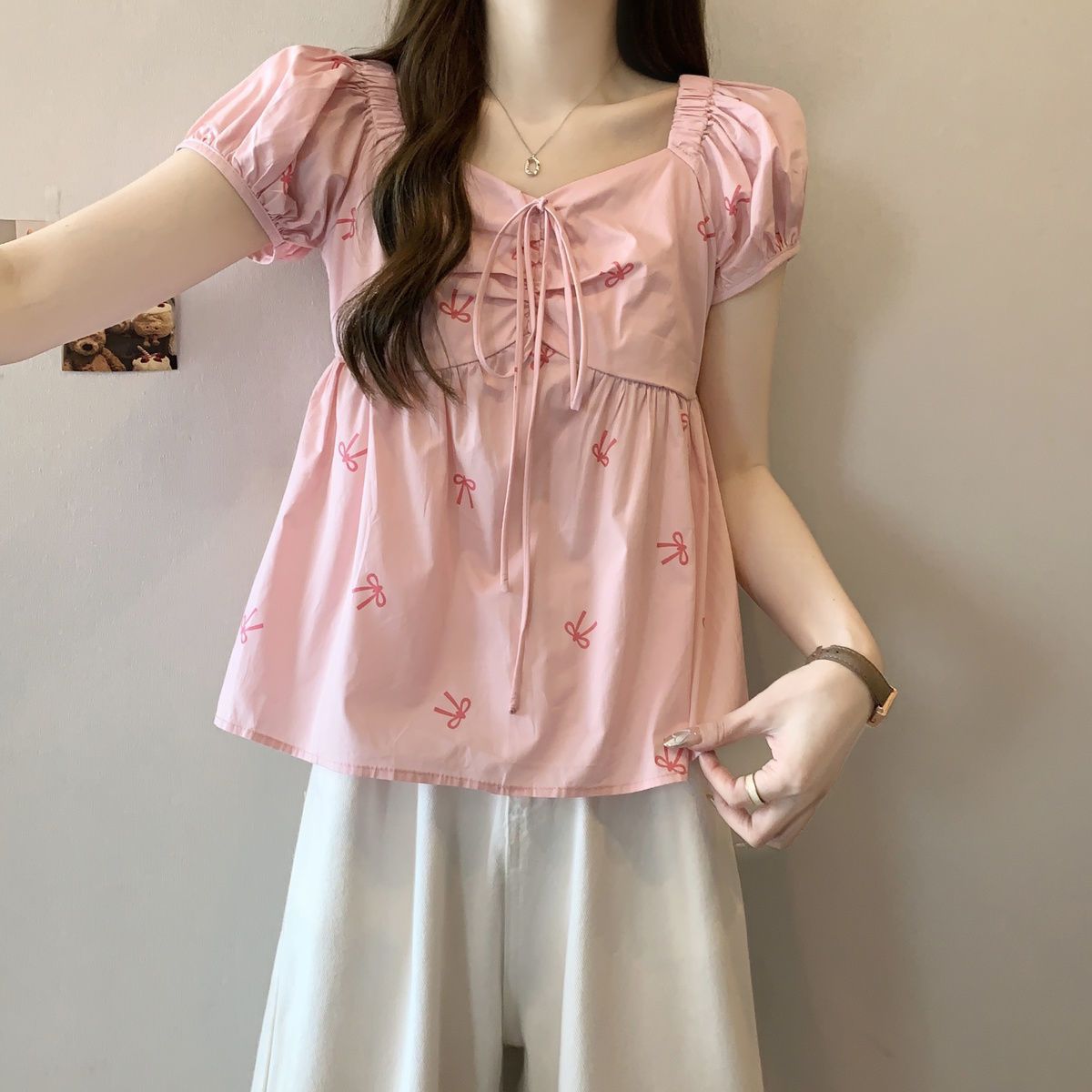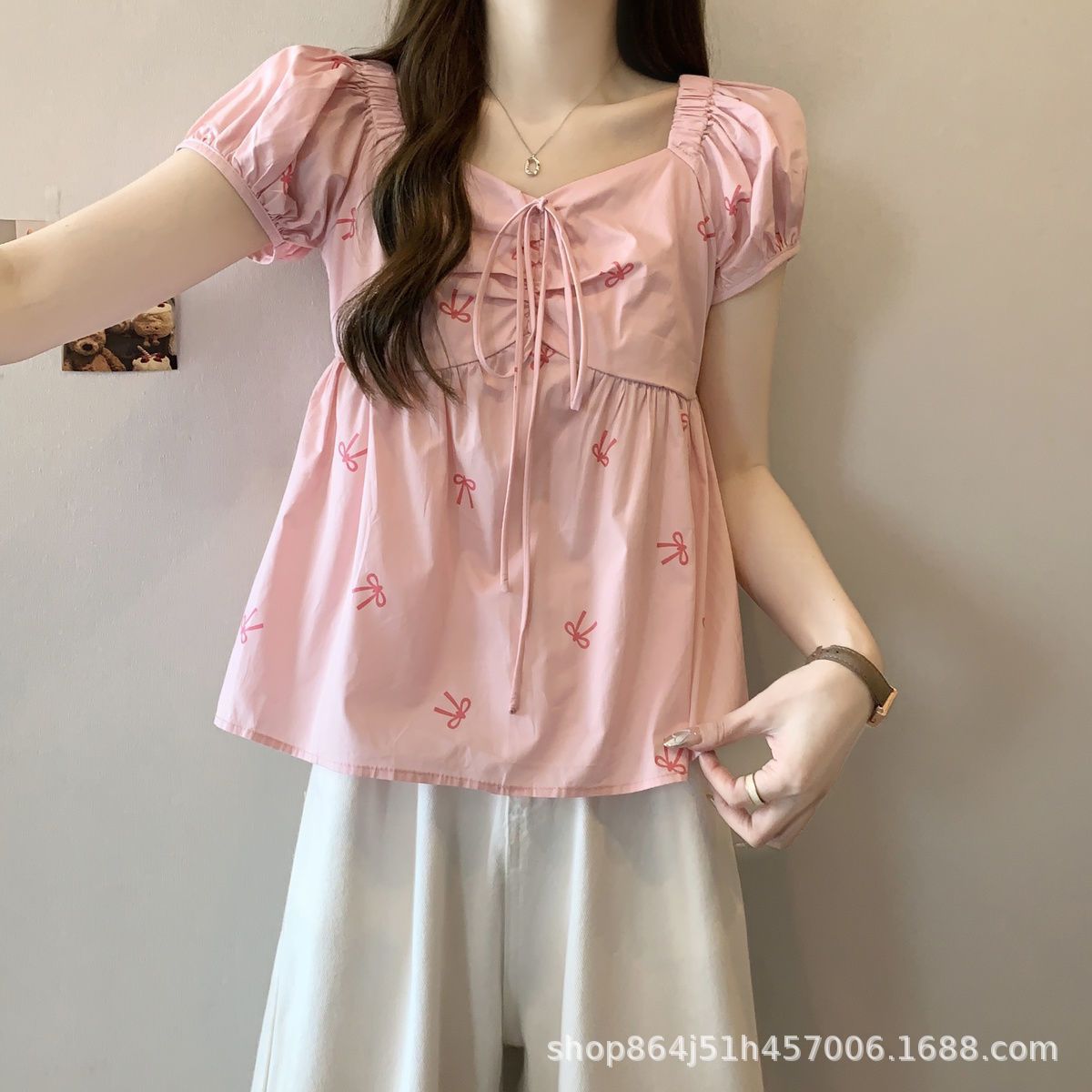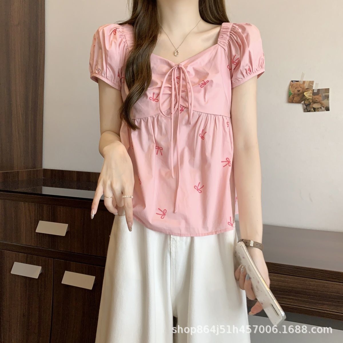 새로운 스파이스 소녀 활 인쇄 셔츠 여성의 여름 디자인 레이스 업 슬리밍 짧은 거품 여성의 여름 탑