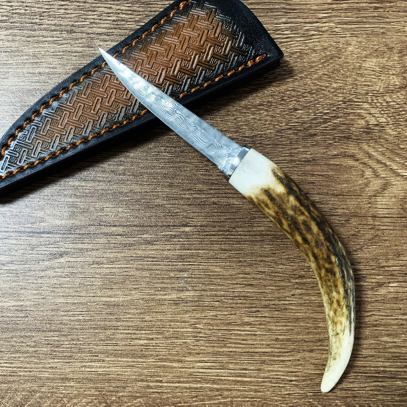 새로운 다마스커스 칼 앤틀러 손잡이 조각 칼 야외 패턴 강철 차 바늘 차 콘 차 세트 액세서리 과일 칼