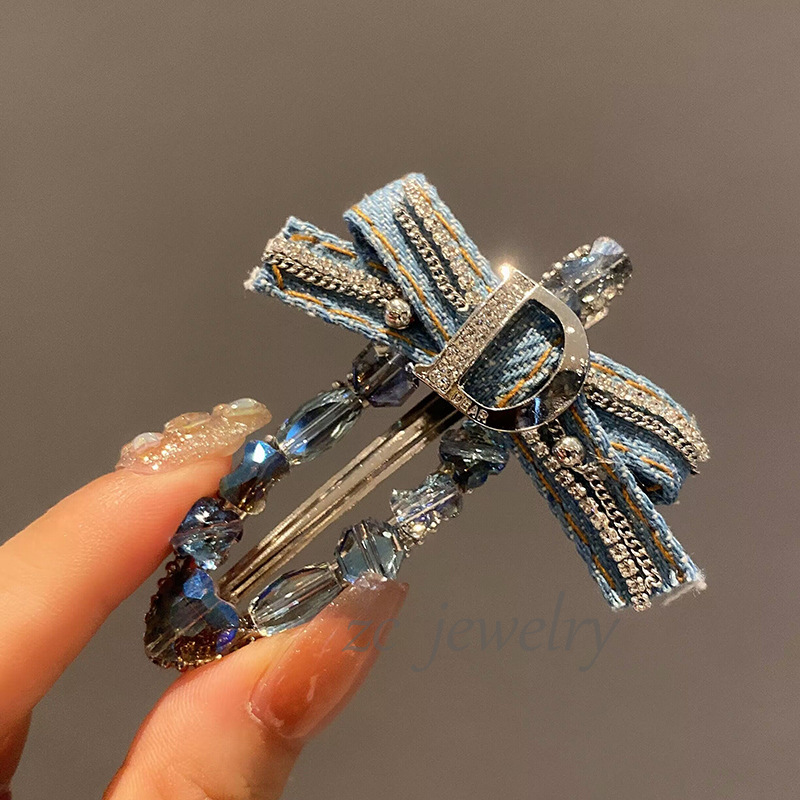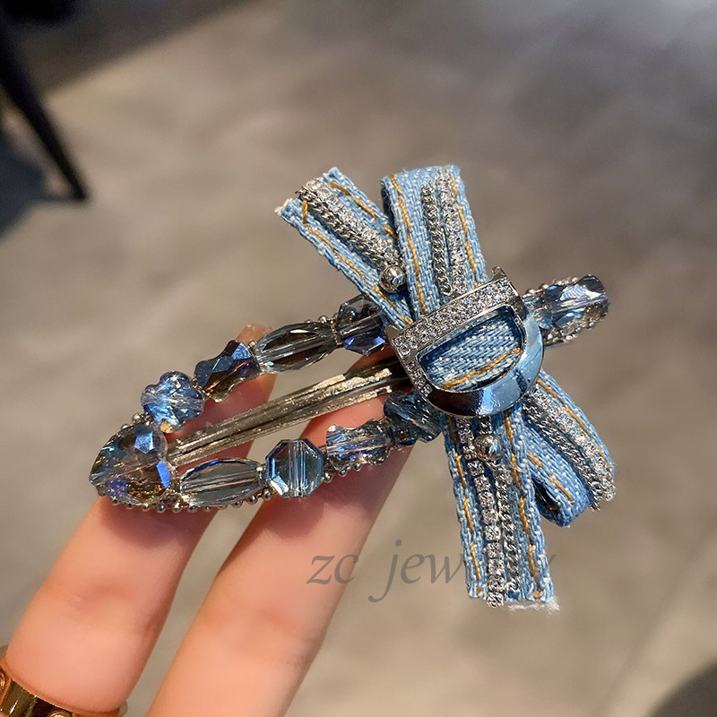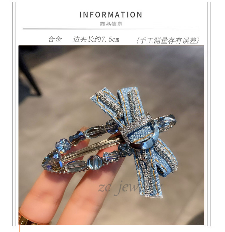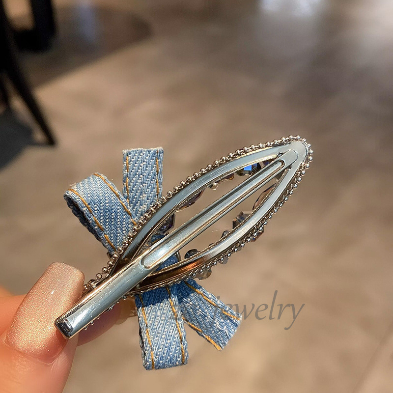 한국식 레트로 데님 크리스탈 보우 사이드 클립 중공업 풀 다이아몬드 뱅 클립 깨진 헤어핀 덕빌 클립 헤드웨어