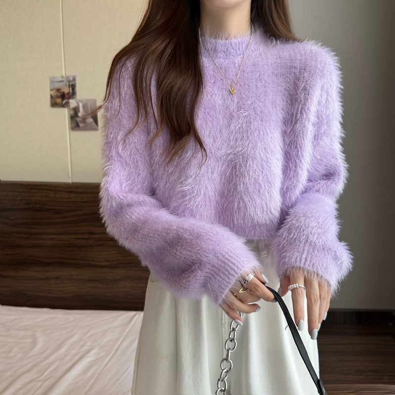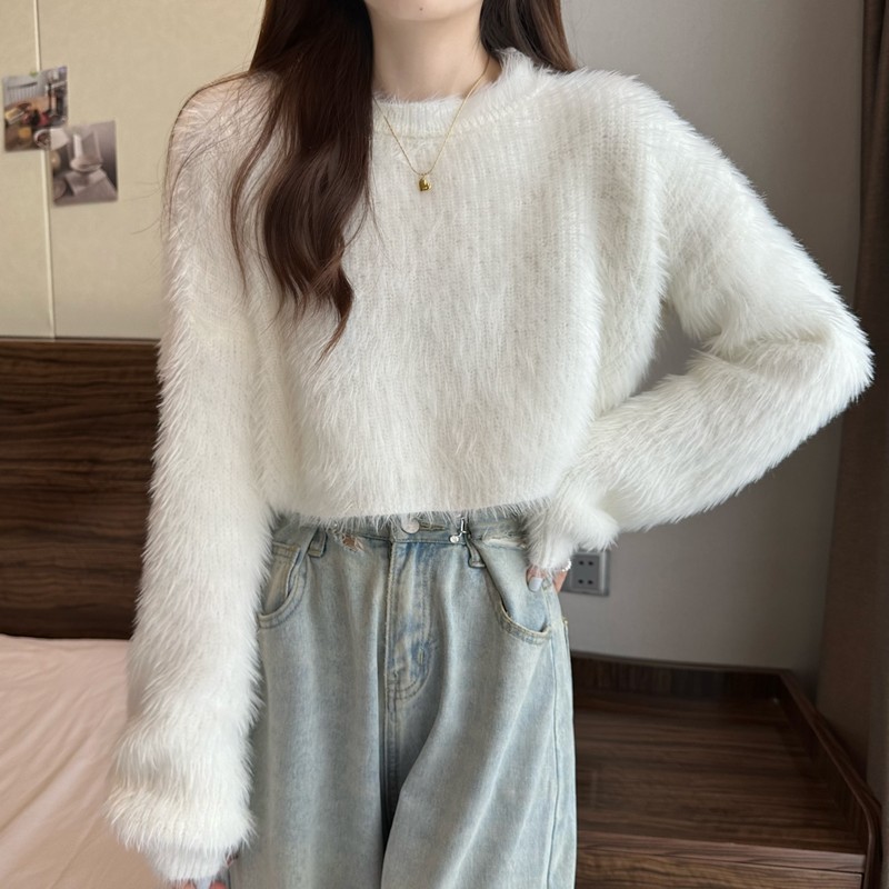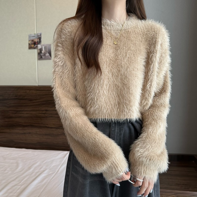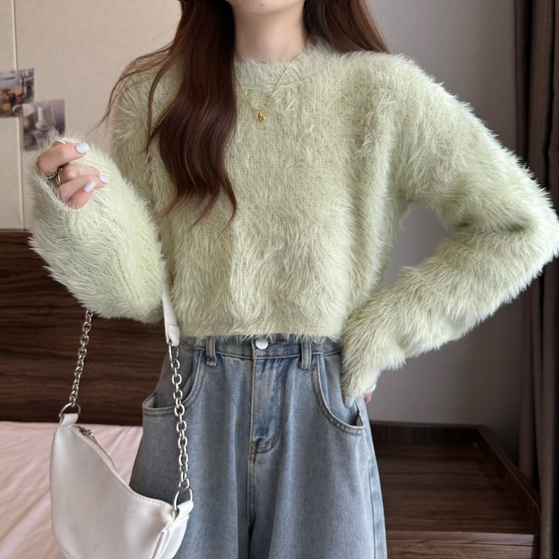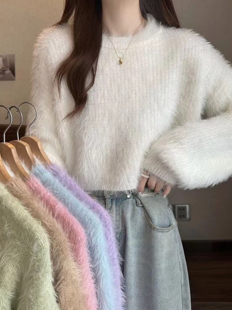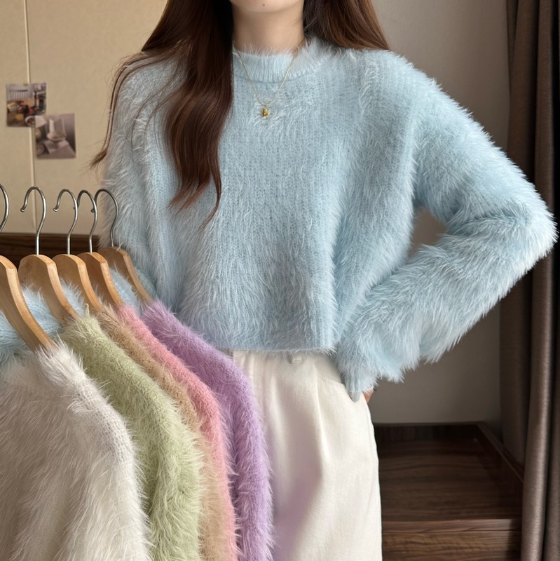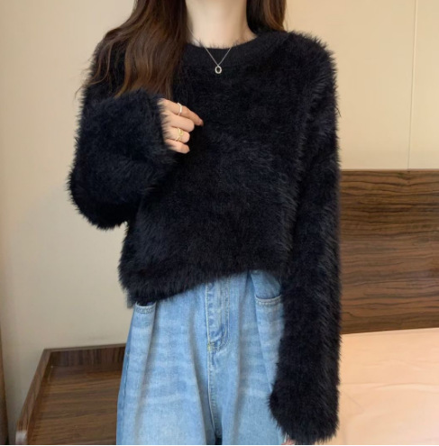 한국 스타일 가을과 겨울 2024 새로운 달콤한 스타일 풀오버 크루 넥 스웨터 여성의 느슨한 모방 밍크 벨벳 니트 탑 여성 트렌디스토어 가기