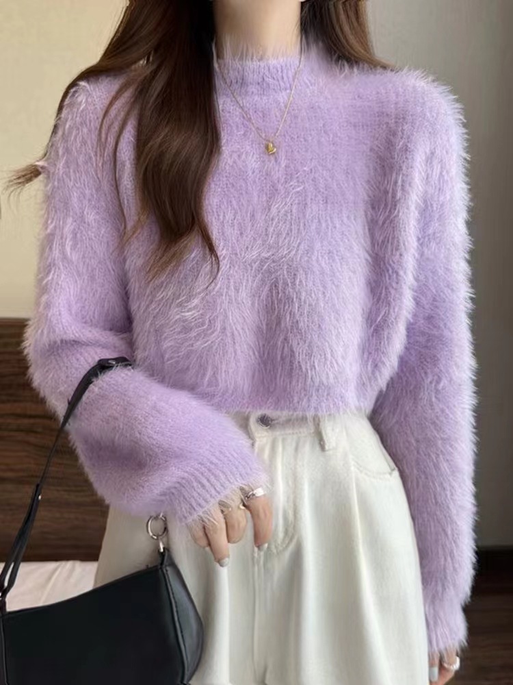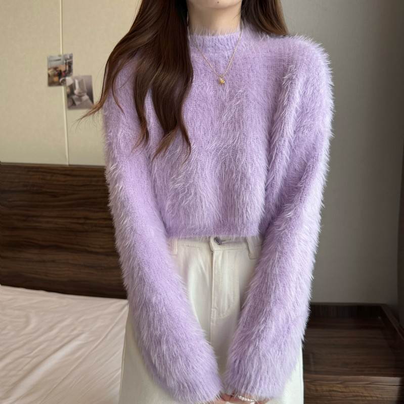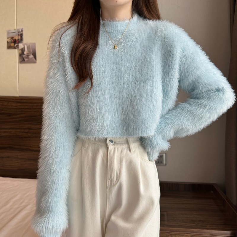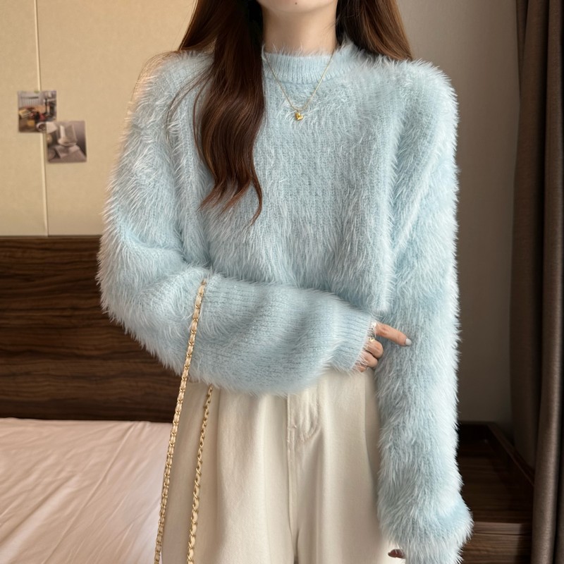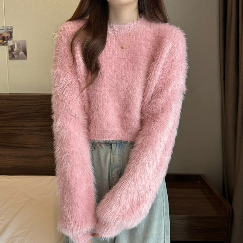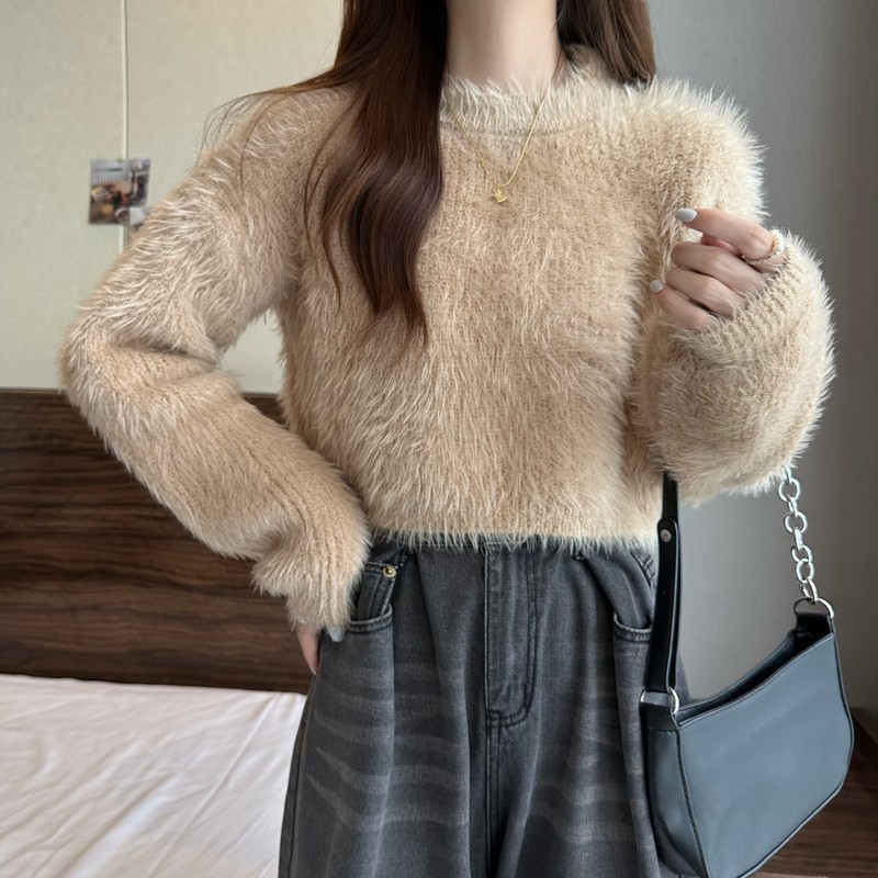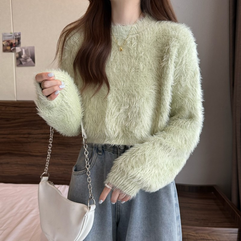 한국 스타일 가을과 겨울 2024 새로운 달콤한 스타일 풀오버 크루 넥 스웨터 여성의 느슨한 모방 밍크 벨벳 니트 탑 여성 트렌디스토어 가기