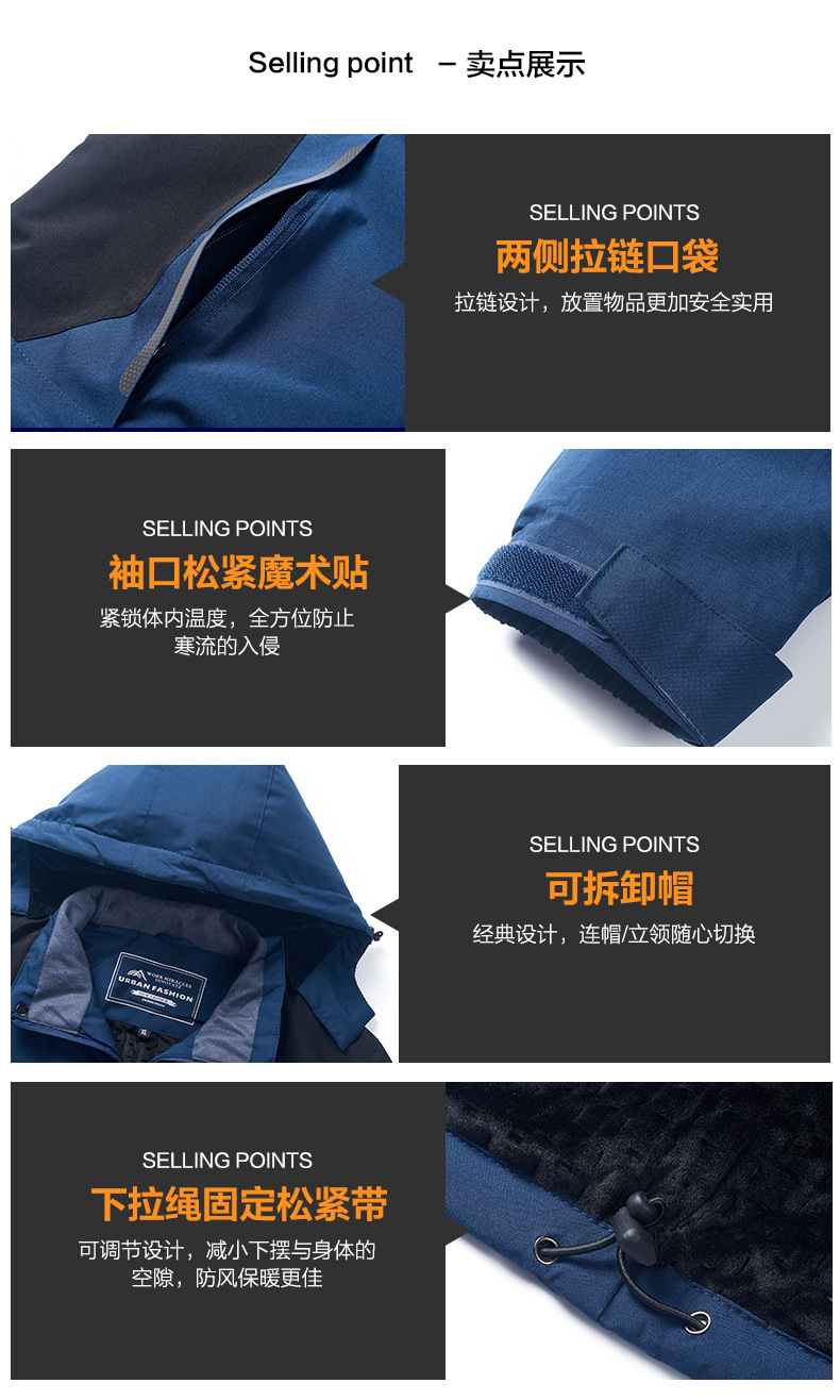 가을과 겨울 야외 스포츠 캐주얼 충전 의류 남성용 등산 의류 방풍 따뜻한 색상 차단 분리 가능한 후드 재킷 코트