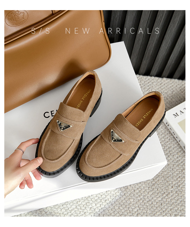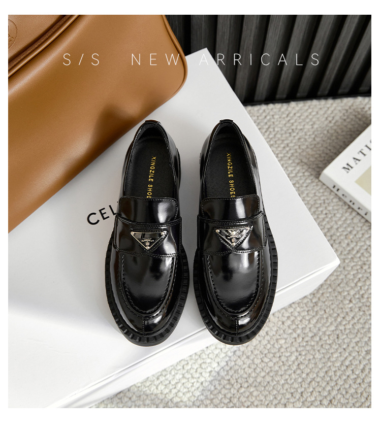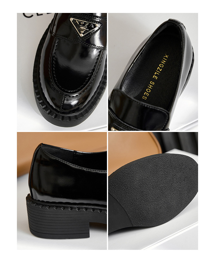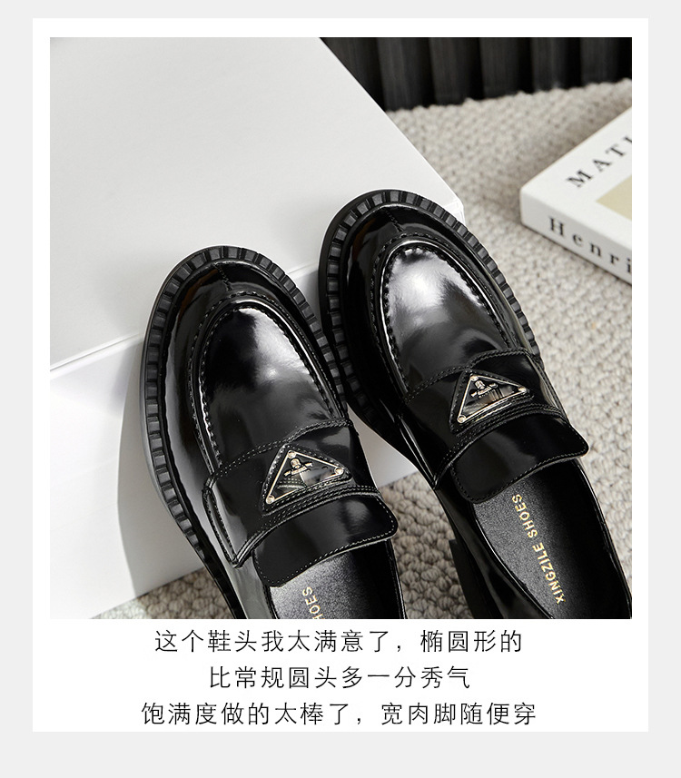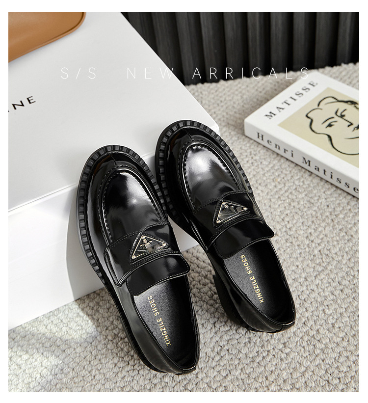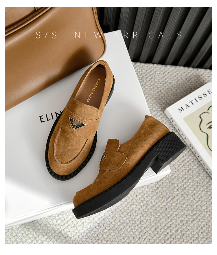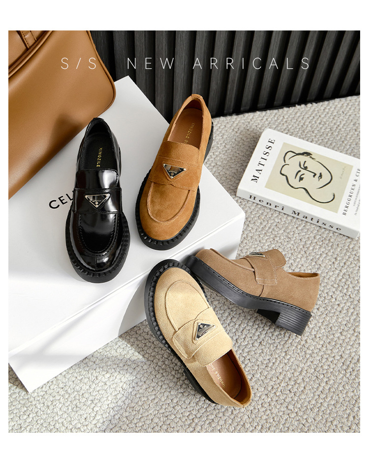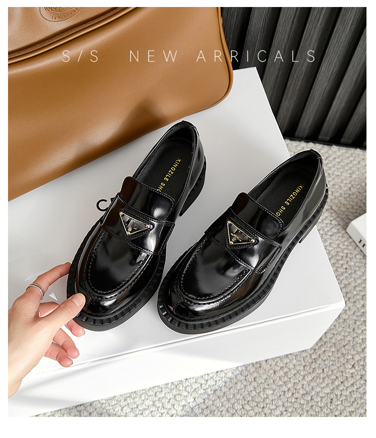Cowhide 가죽 로퍼 여성의 두꺼운 힐 두꺼운 바닥 삼각형 2024 새로운 스타일 슬립 온 레트로 영국 스타일 작은 가죽 신발스토어 가기