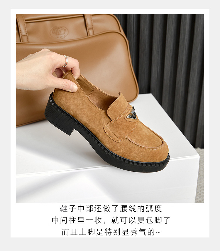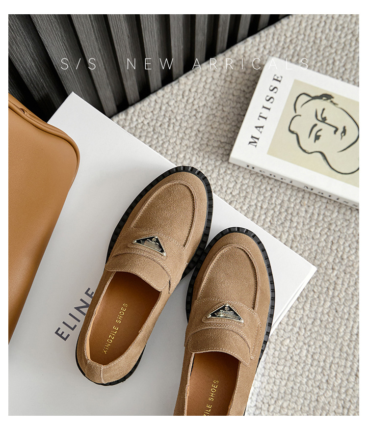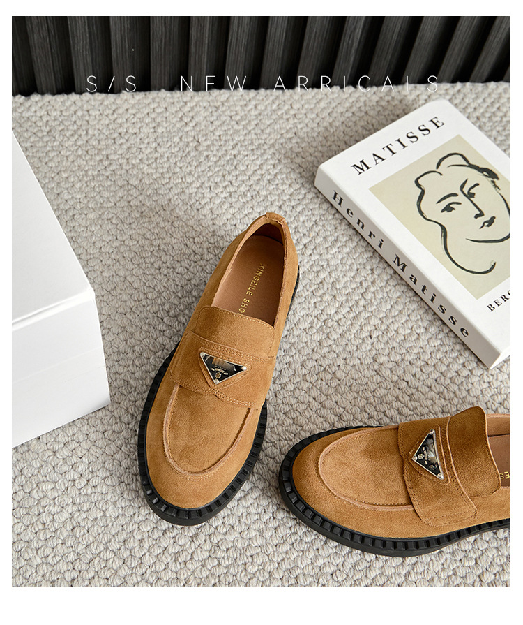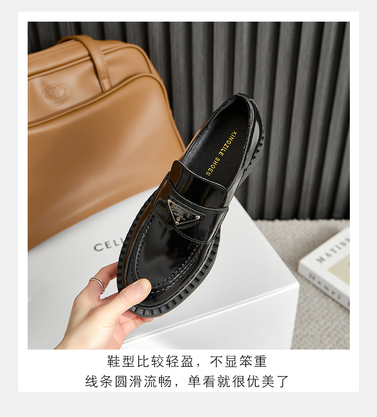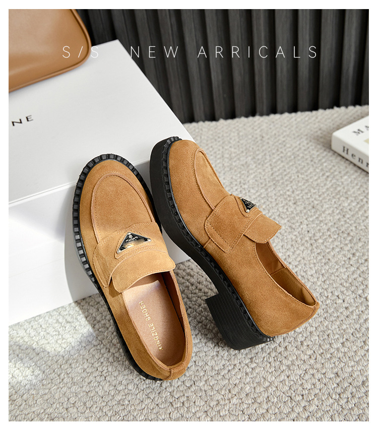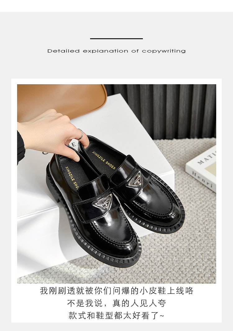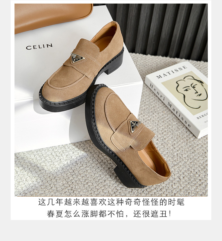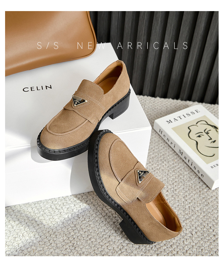 Cowhide 가죽 로퍼 여성의 두꺼운 힐 두꺼운 바닥 삼각형 2024 새로운 스타일 슬립 온 레트로 영국 스타일 작은 가죽 신발스토어 가기