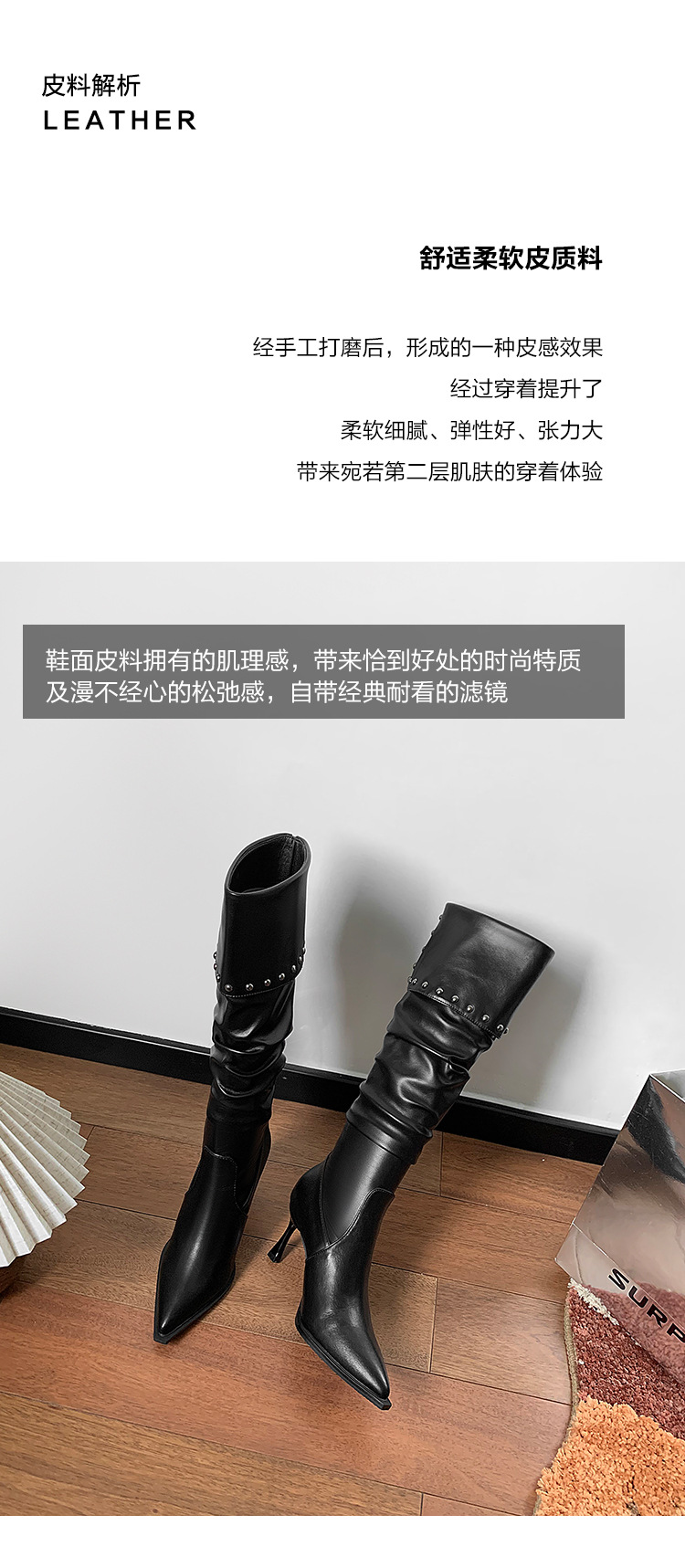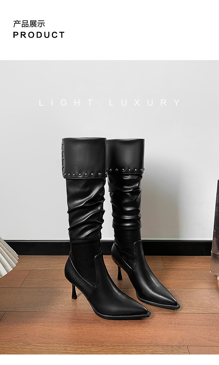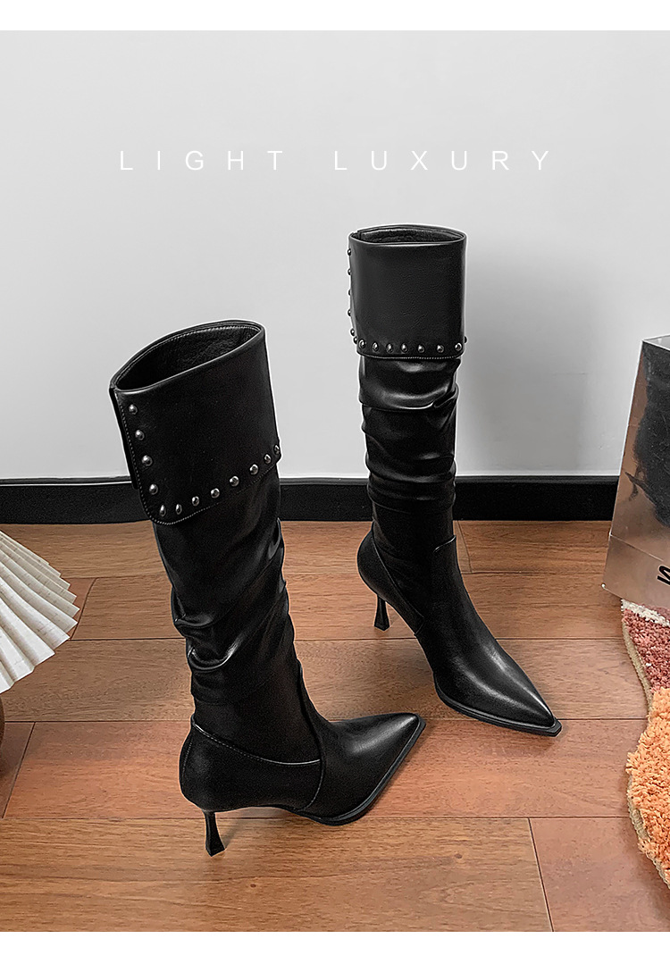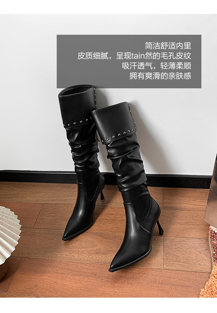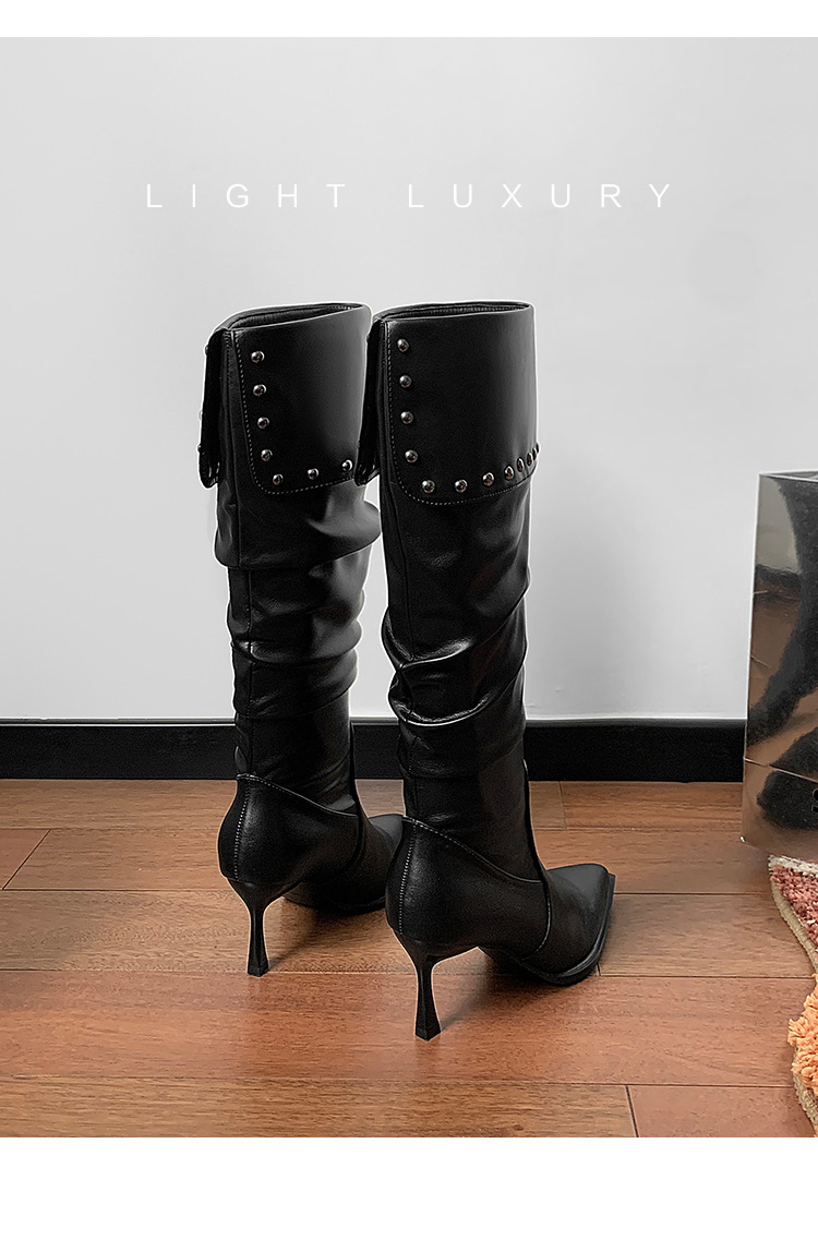 무릎 높이 주름 부츠 높은 배럴 레트로 부츠 여름과 가을 스택 부츠 뾰족한 스티치 힐 부츠 여성 2024 새로운스토어 가기