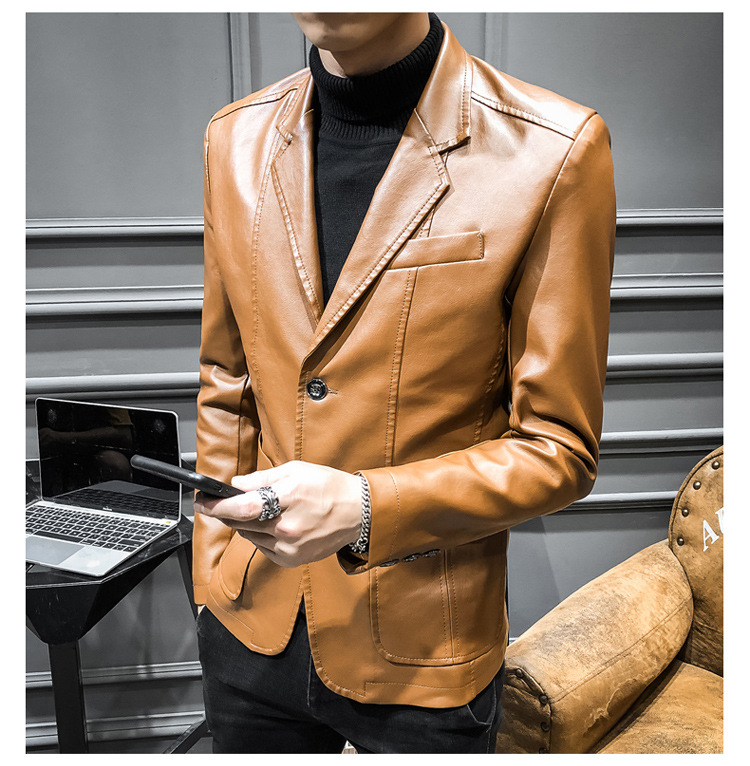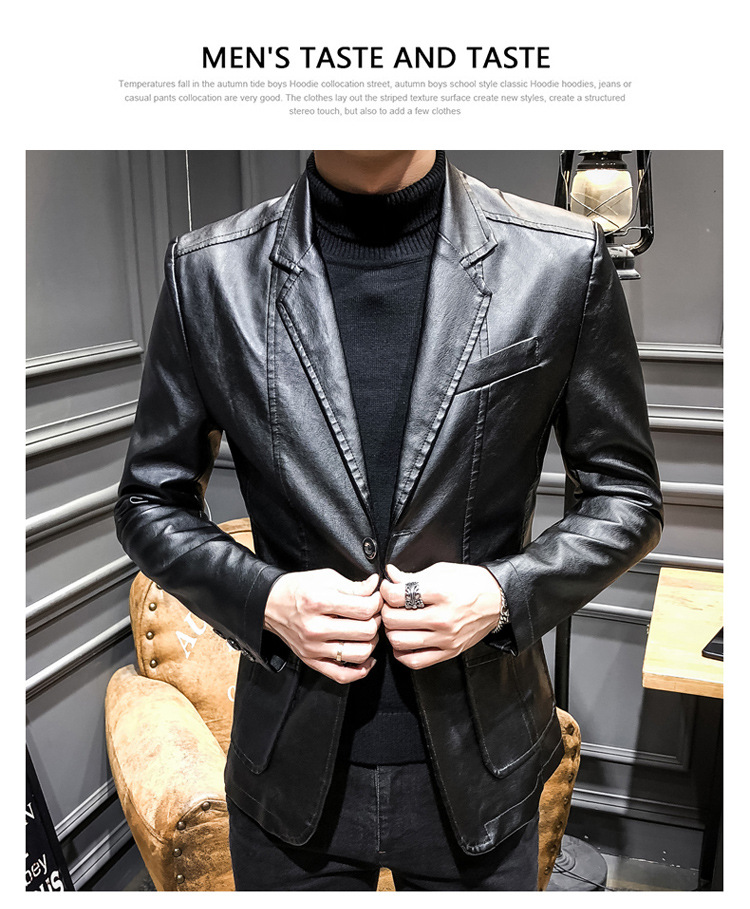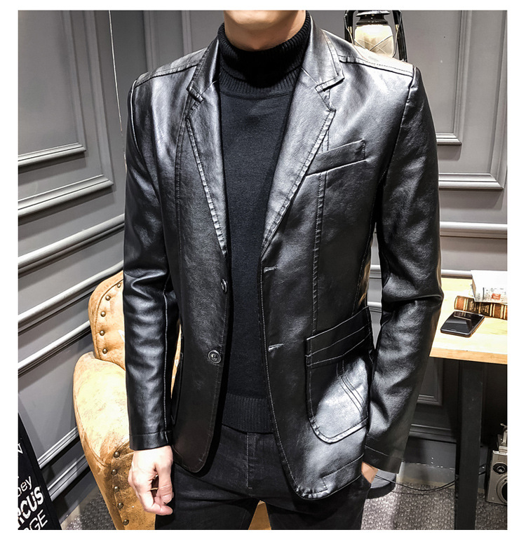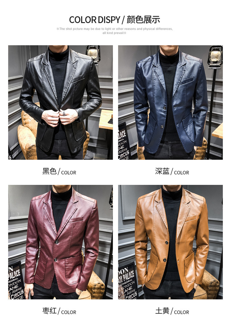 가을 2021 새로운 남성 가죽 세트 캐주얼 재킷 한국 스타일 슬림 핏 옷깃 가죽 세트 가죽 자켓 남성 패션스토어 가기