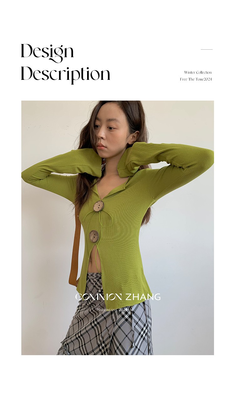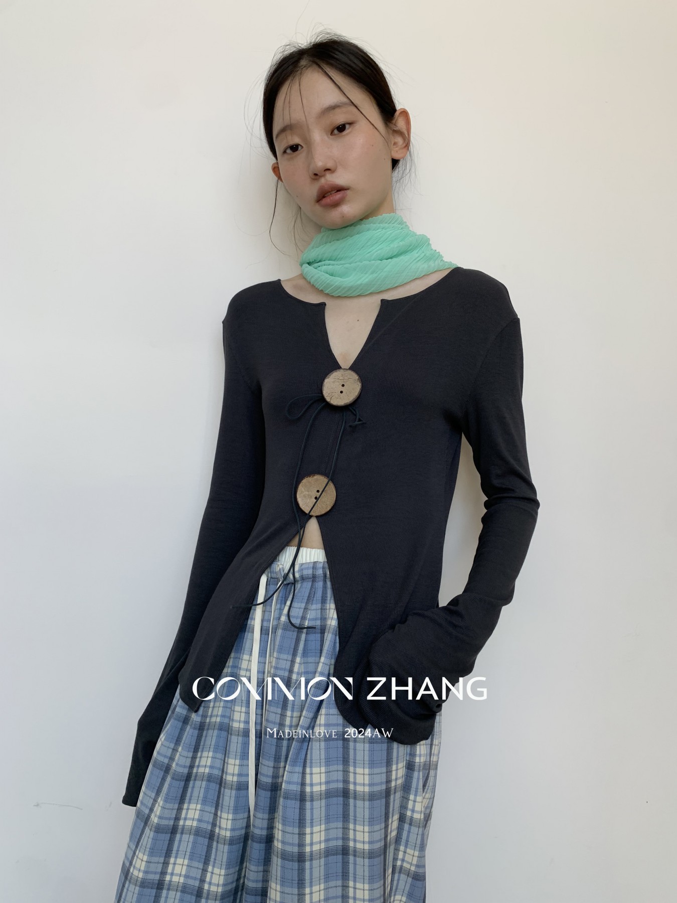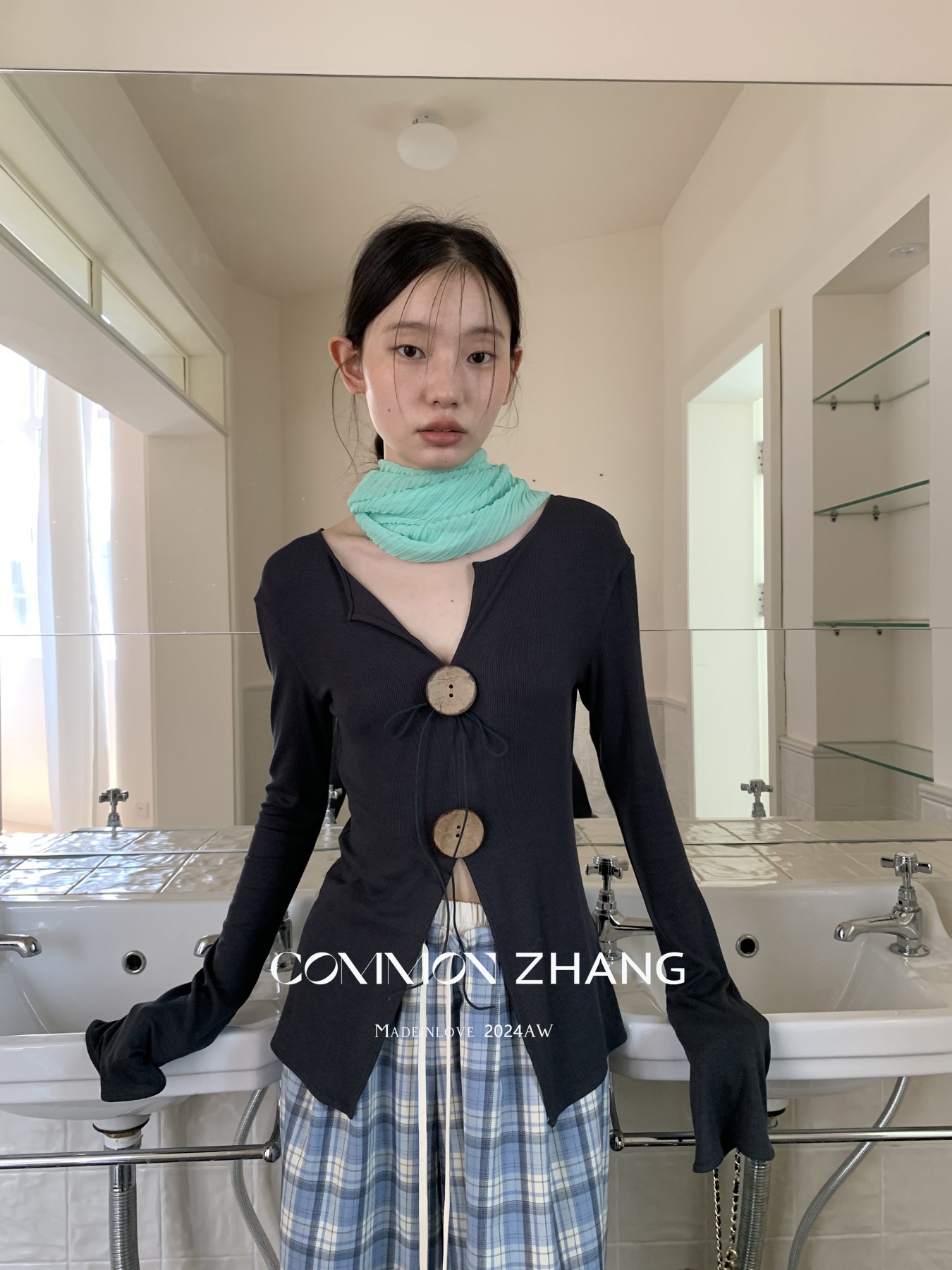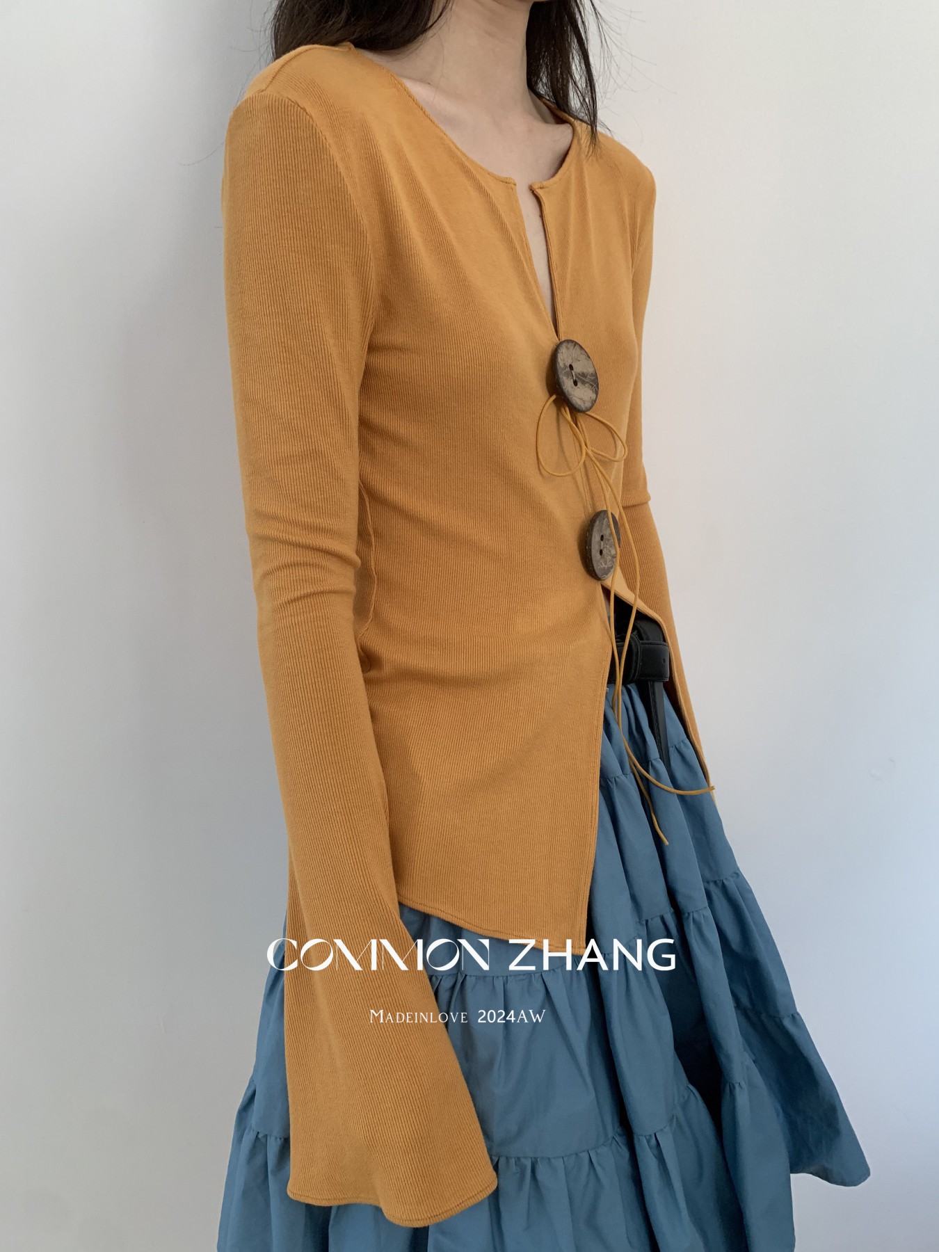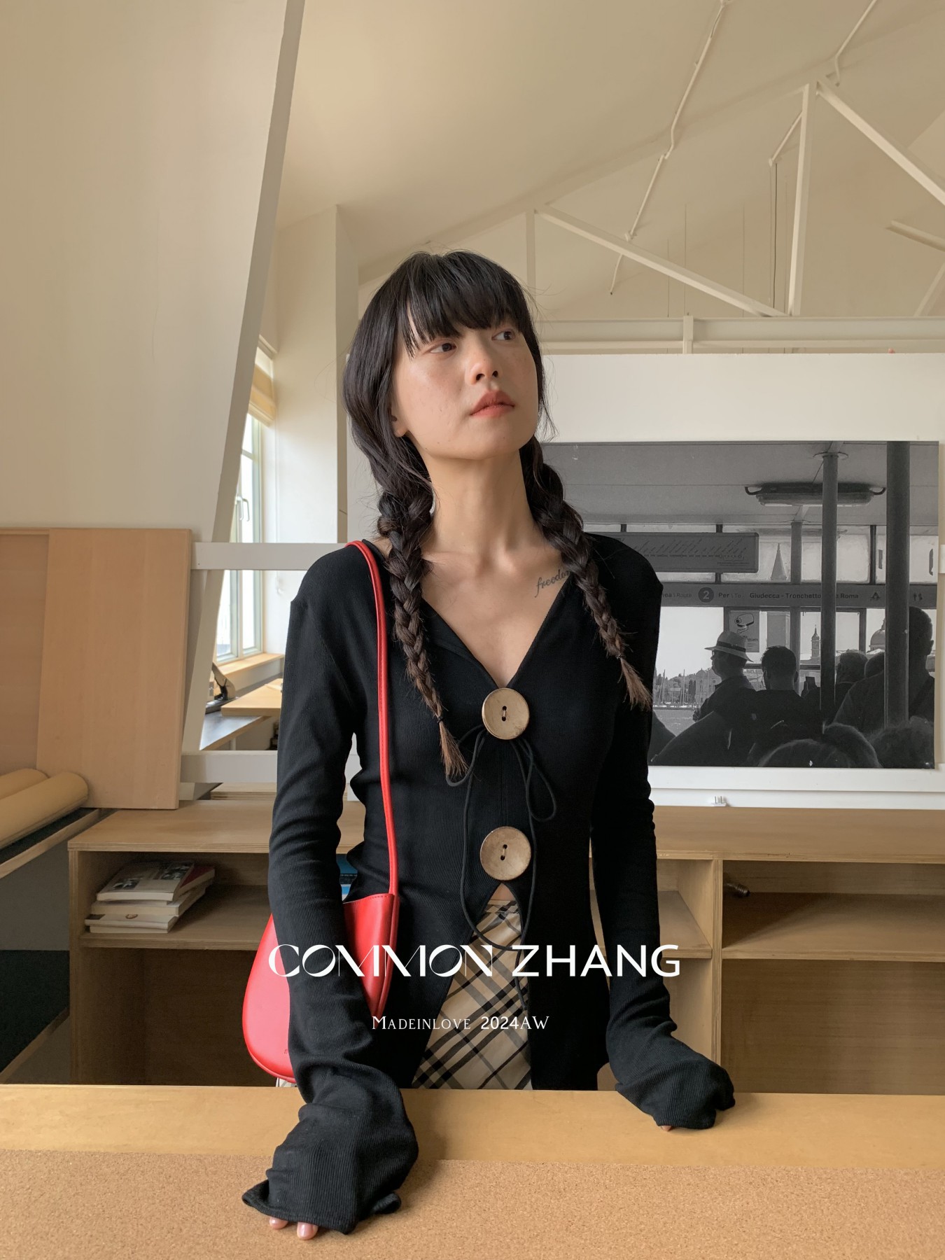 CZ ZHANG 가을 니치 섹시 프렌치 스타일 레이스업 레진 버튼 브이넥 섹시 니트 여성용 A33310