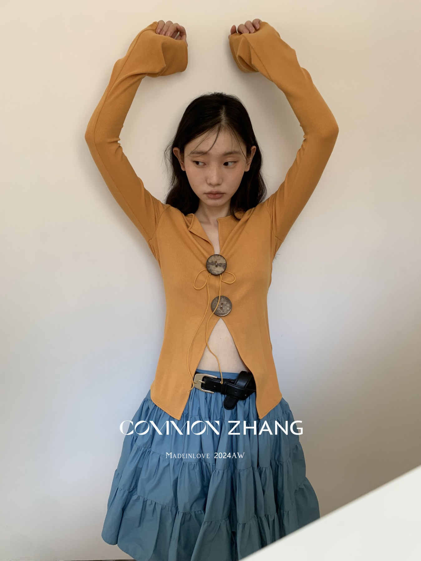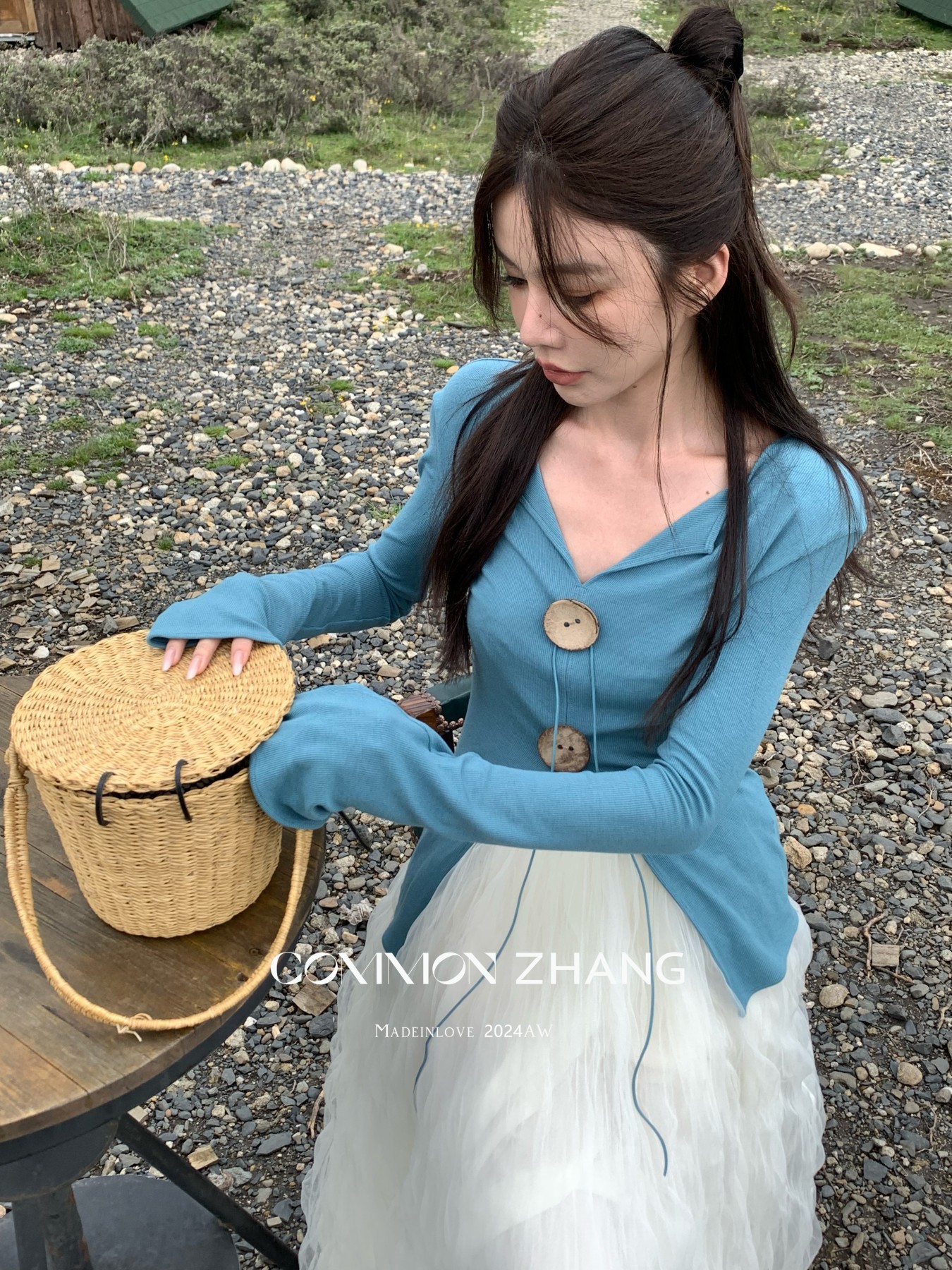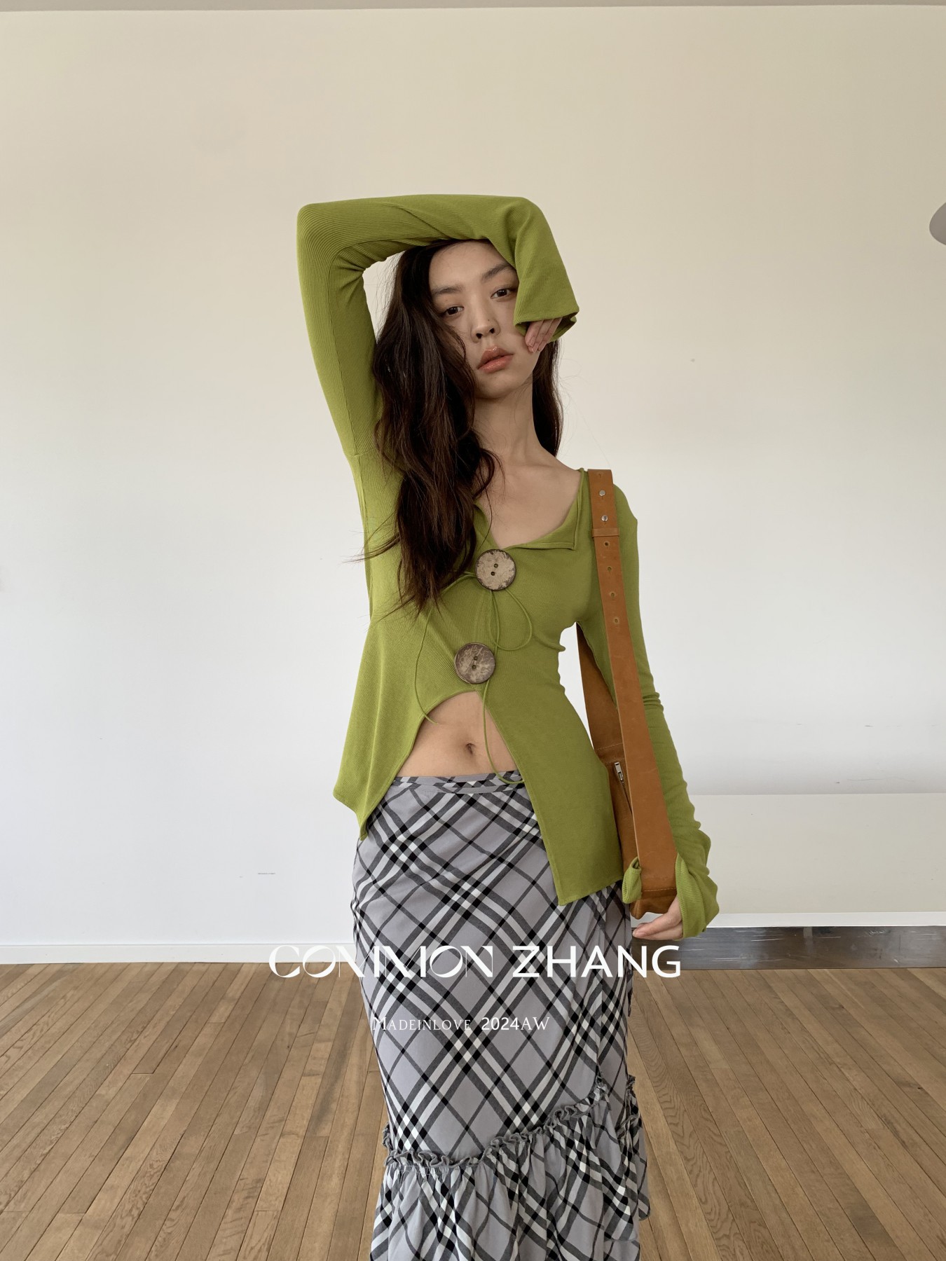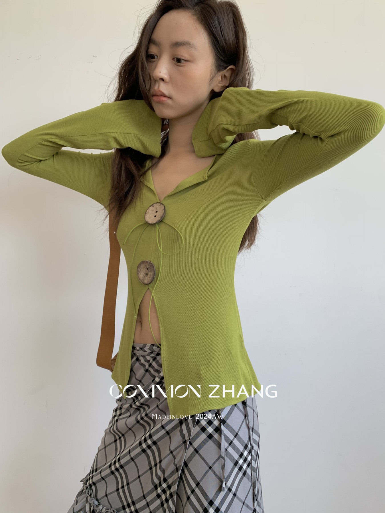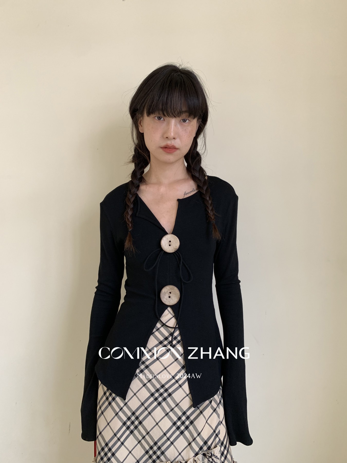 CZ ZHANG 가을 니치 섹시 프렌치 스타일 레이스업 레진 버튼 브이넥 섹시 니트 여성용 A33310