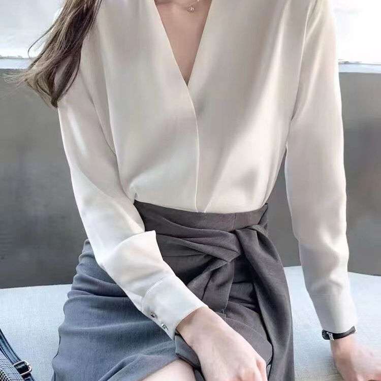 봄 가을 신상 무칼라 흰색 셔츠 주름 방지 상의 고급스러운 분위기의 쉬폰 브이넥 전문직 여성용 긴팔 셔츠스토어 가기