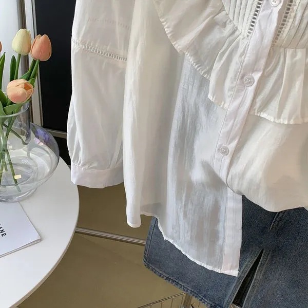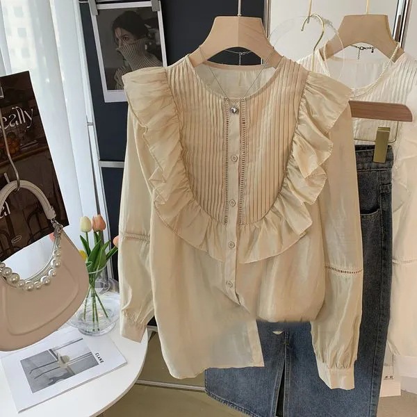 프렌치 러플 블랙 쉬폰 셔츠 여성용 봄과 여름 플러스 사이즈 통통녀 슬리밍 세련된 긴 소매 셔츠 탑 루즈스토어 가기