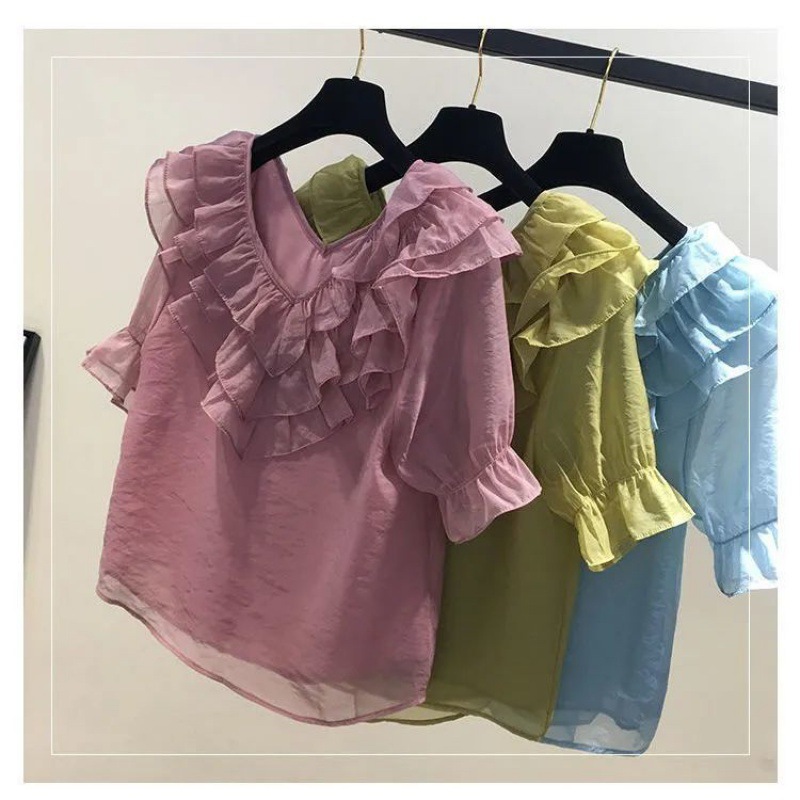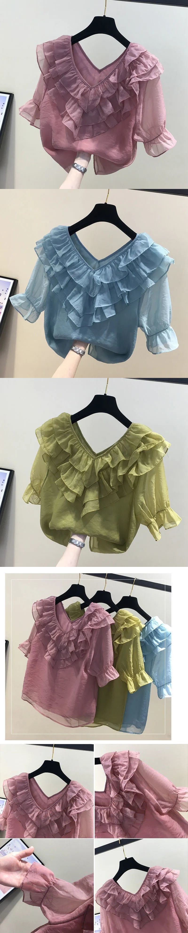 2023 년 여름 새로운 V 넥 러플 반팔 쉬폰 셔츠 여성용 유행 연령 감소 세련된 슬리밍 셔츠 트렌디 탑스토어 가기