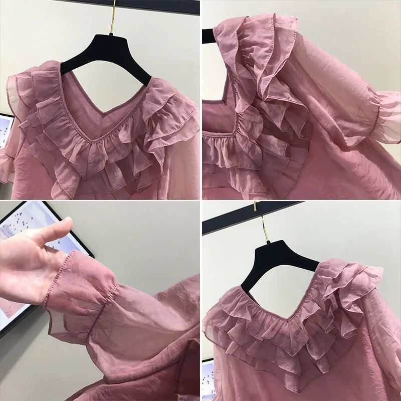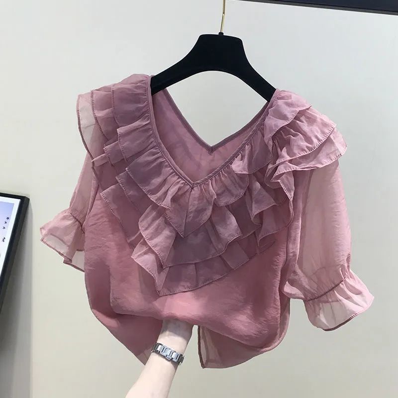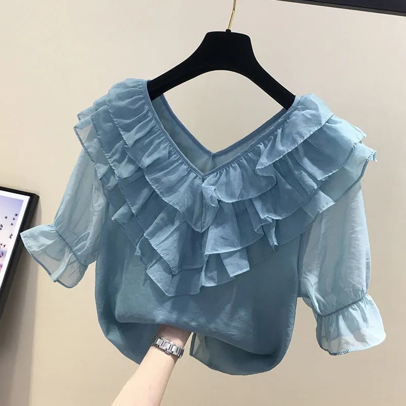 2023 년 여름 새로운 V 넥 러플 반팔 쉬폰 셔츠 여성용 유행 연령 감소 세련된 슬리밍 셔츠 트렌디 탑