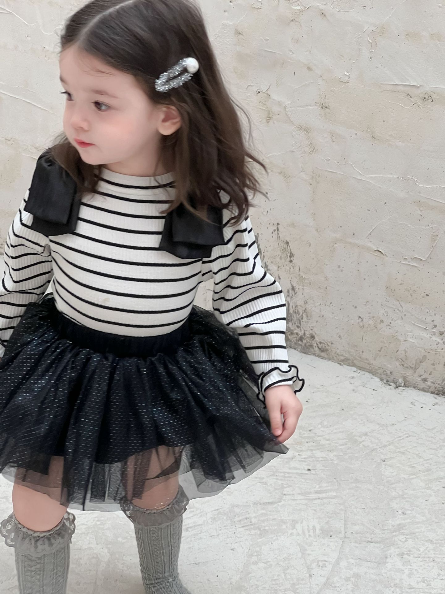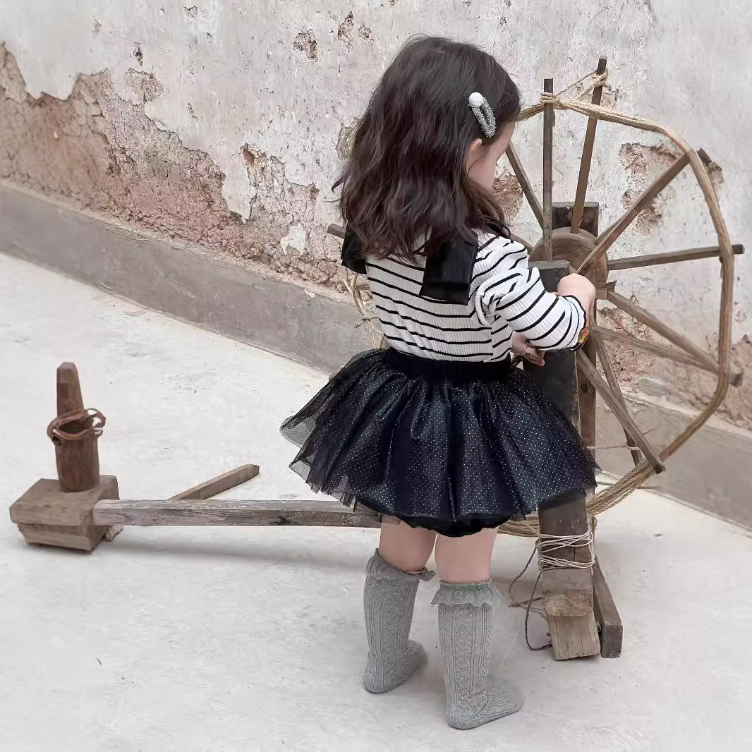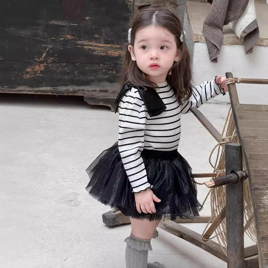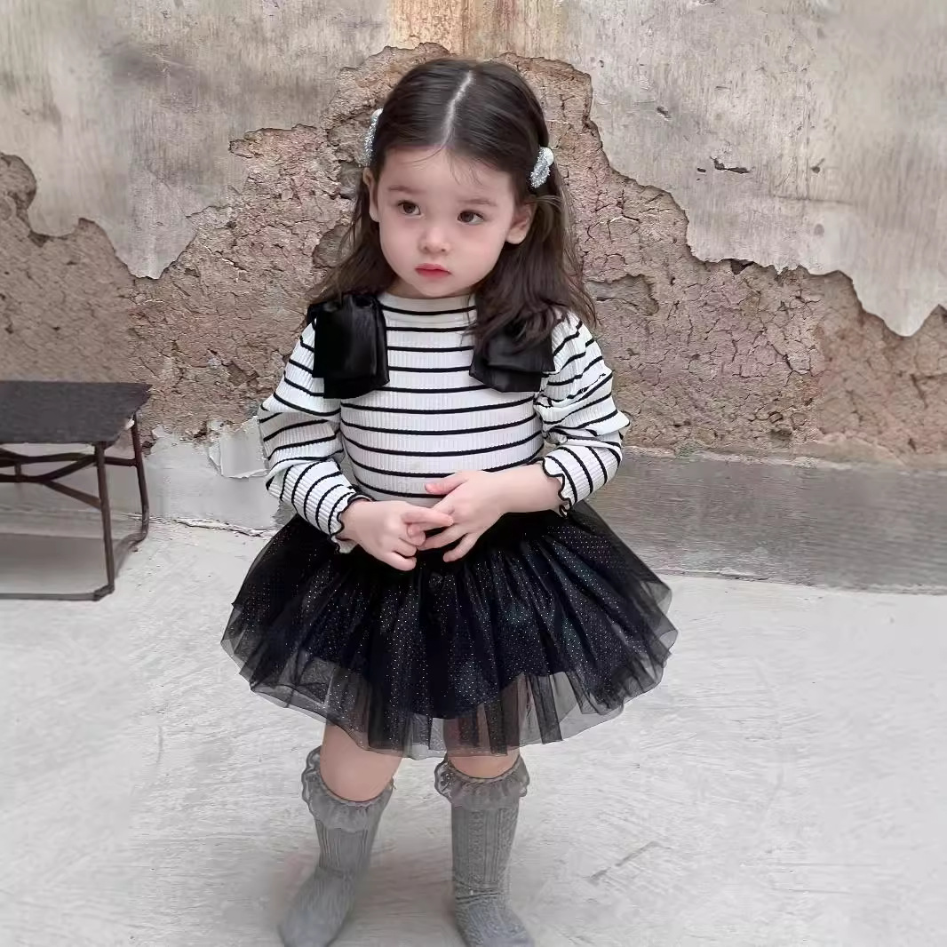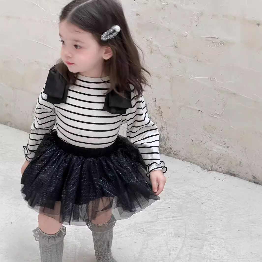 가을 아기 여아 니트 스트라이프 크리에이티브 빅 보우 거즈 스커트