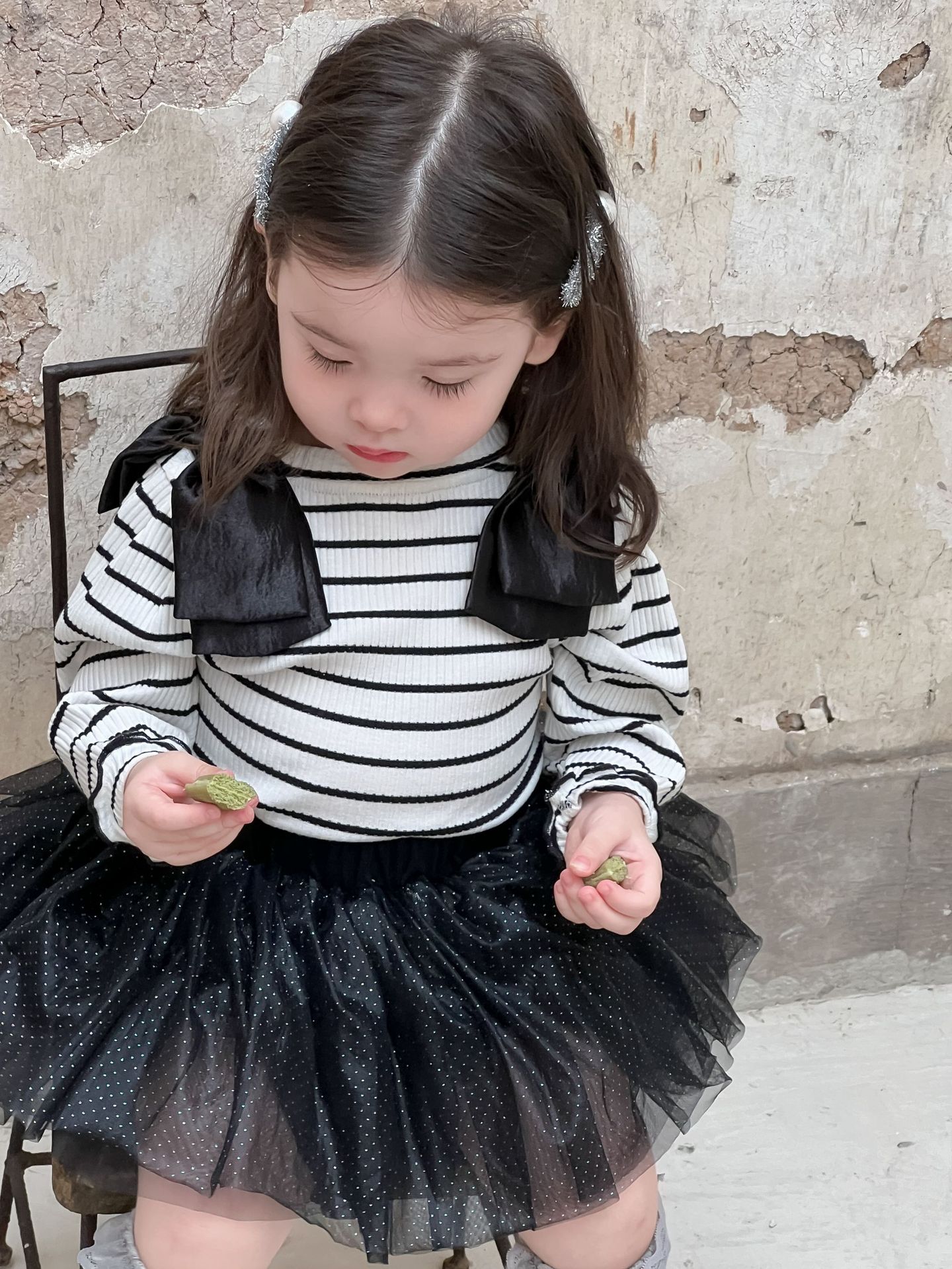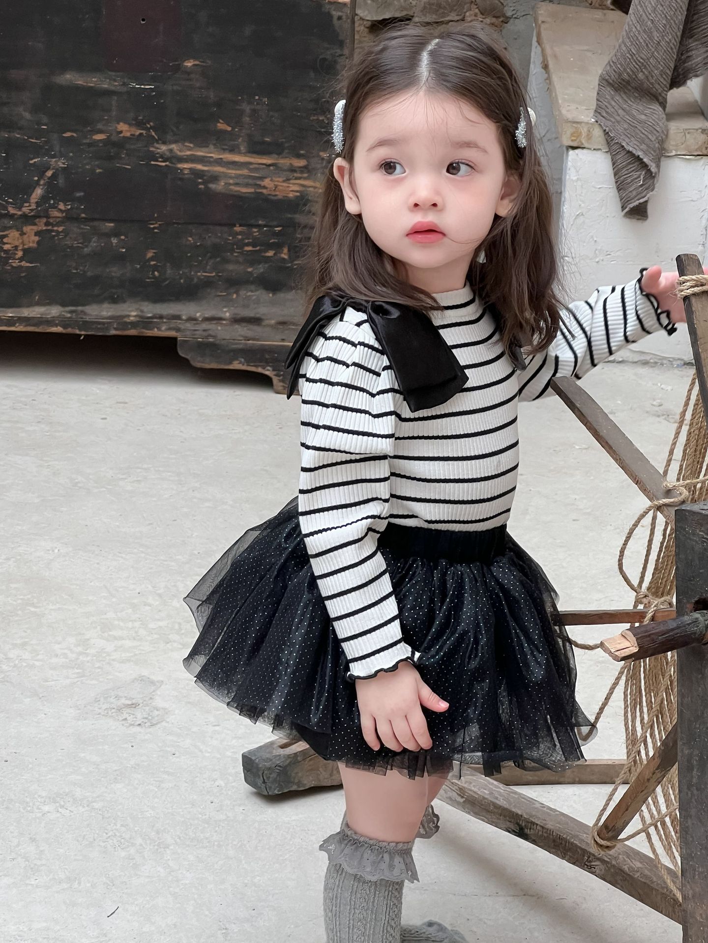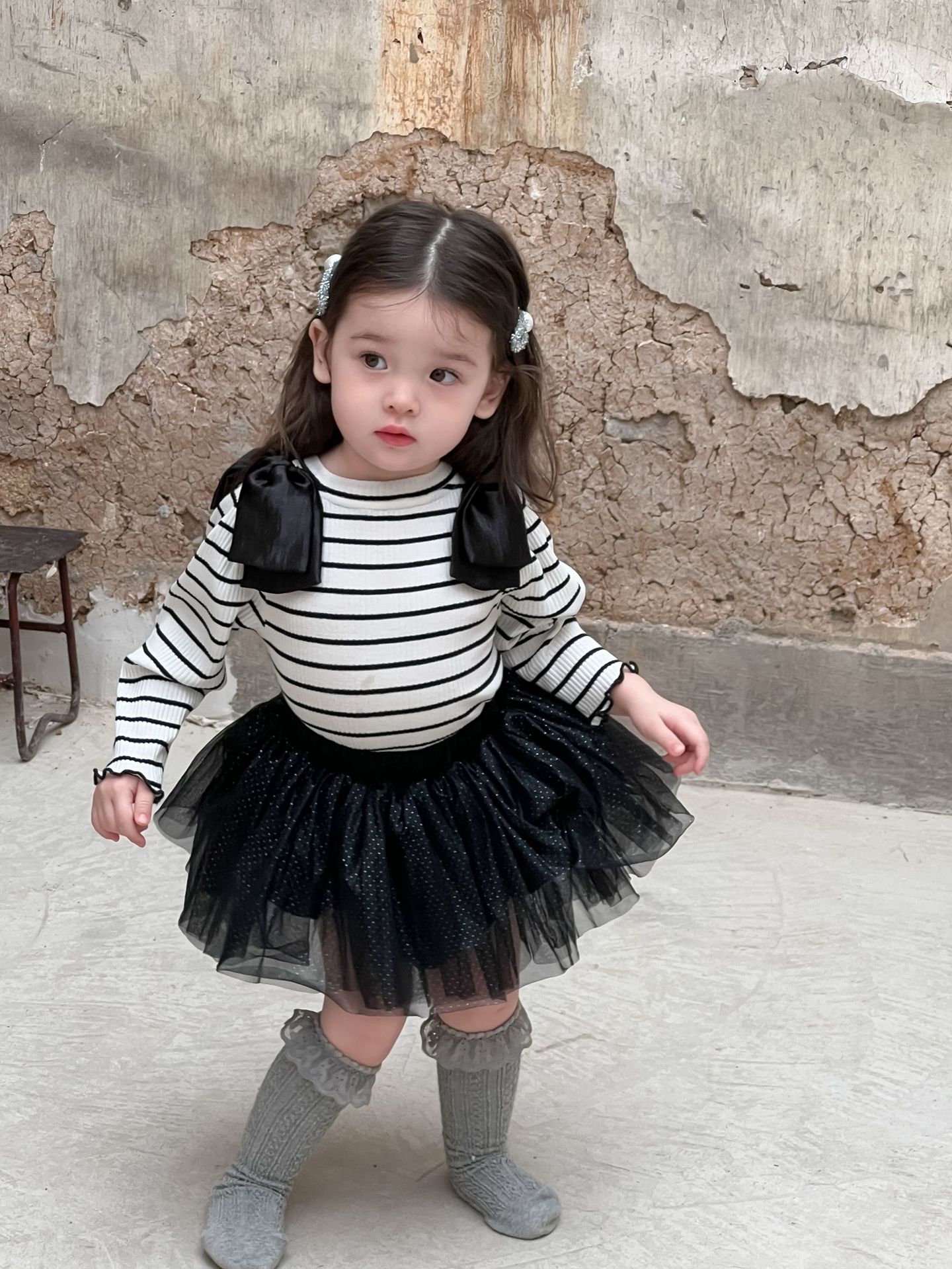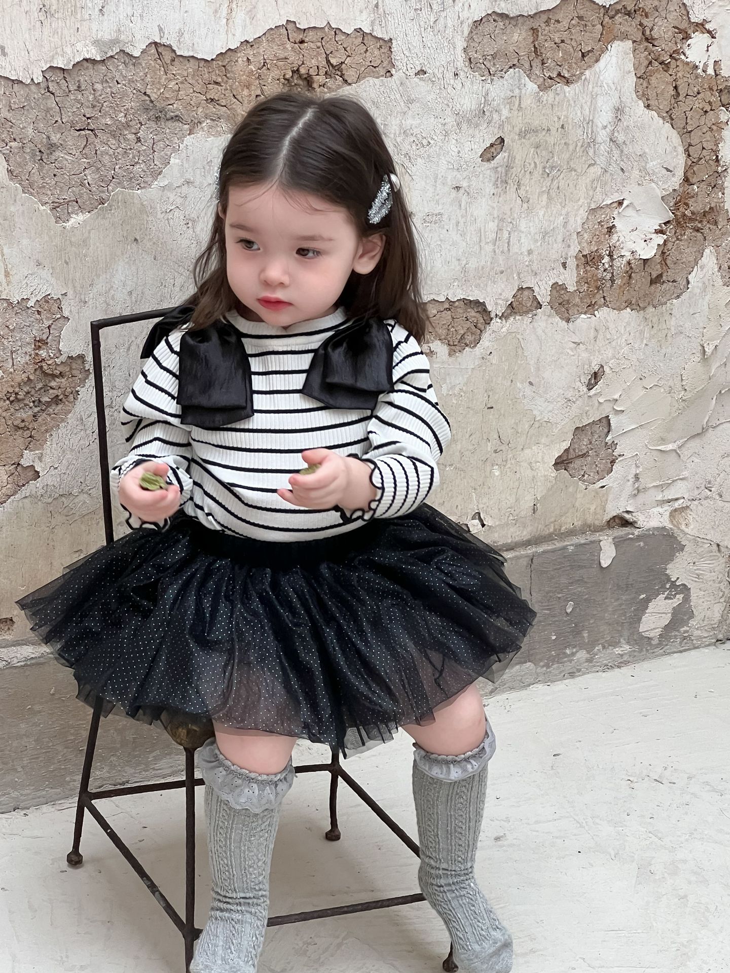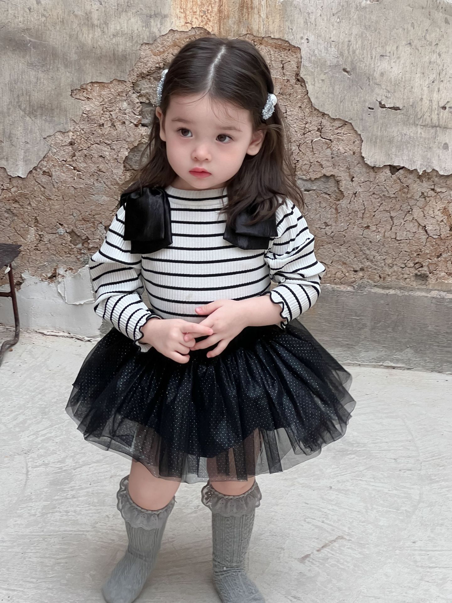 가을 아기 여아 니트 스트라이프 크리에이티브 빅 보우 거즈 스커트