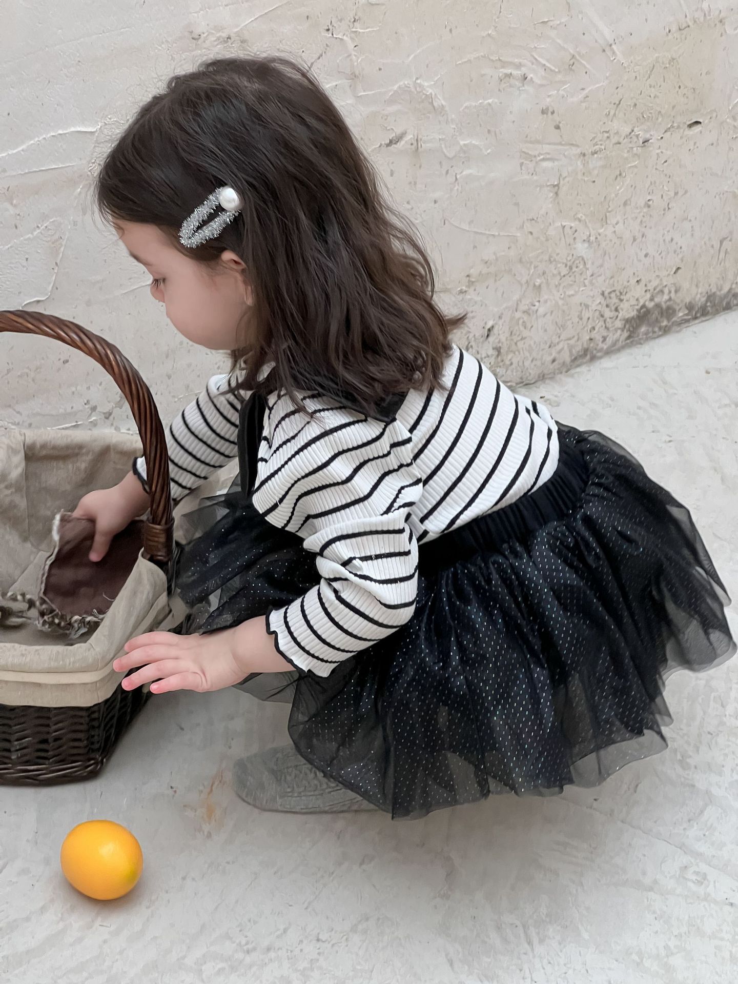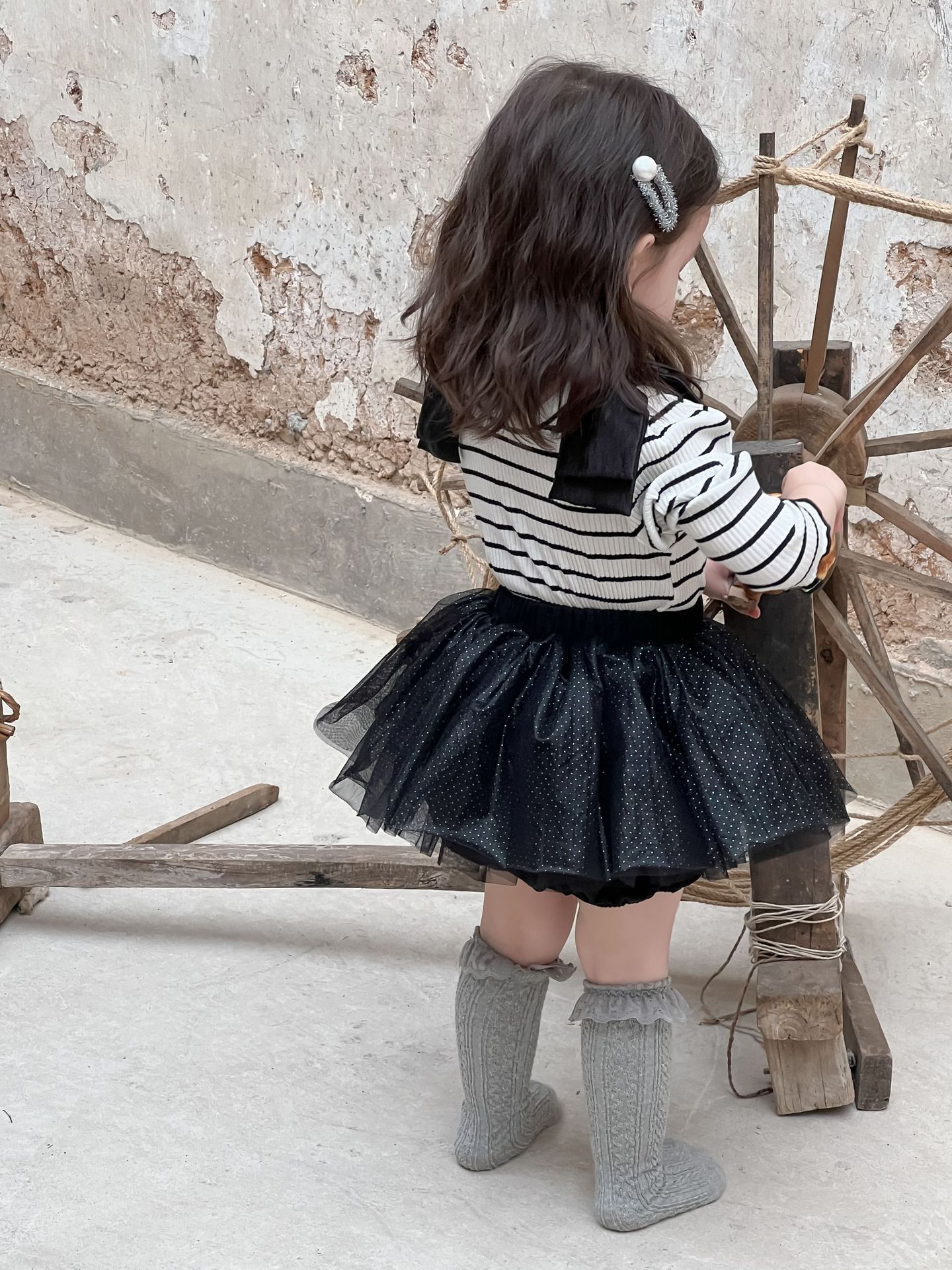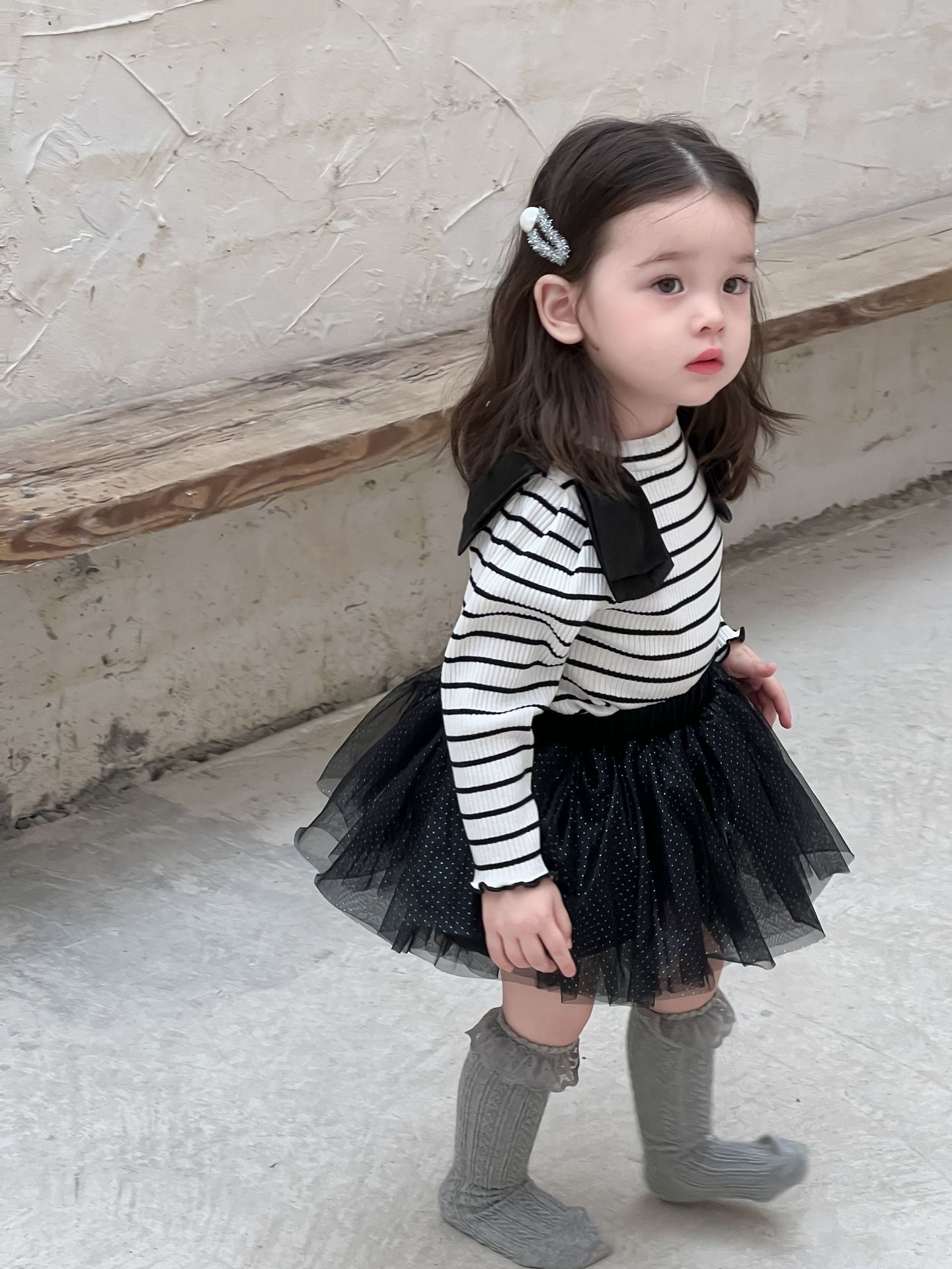 가을 아기 여아 니트 스트라이프 크리에이티브 빅 보우 거즈 스커트스토어 가기