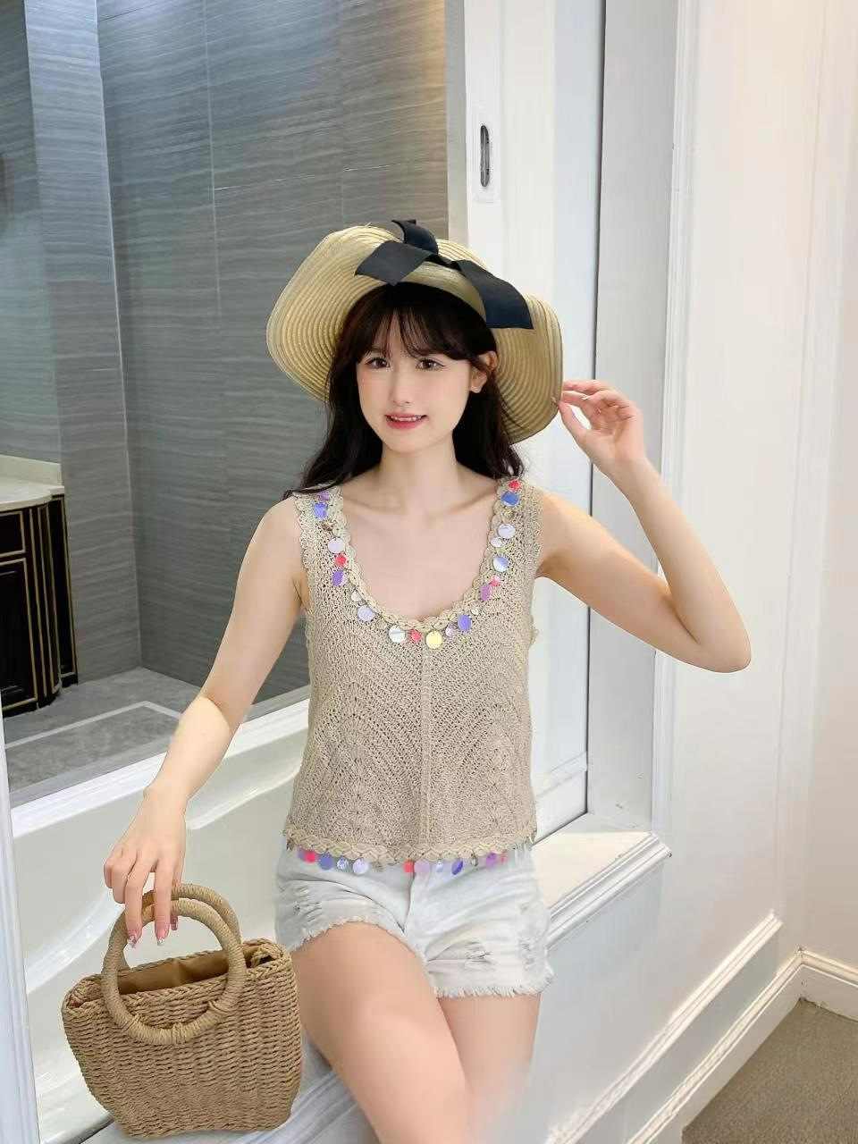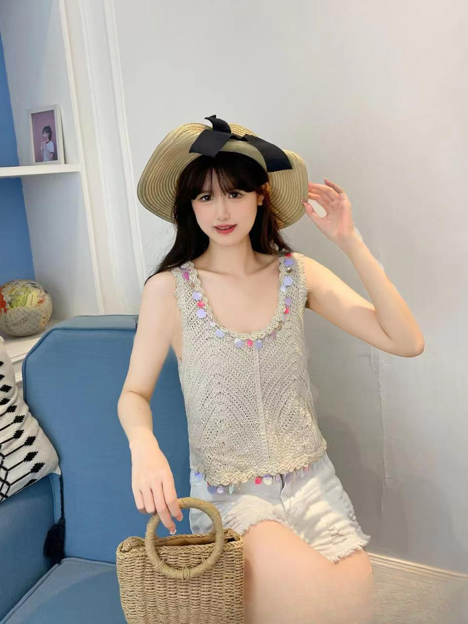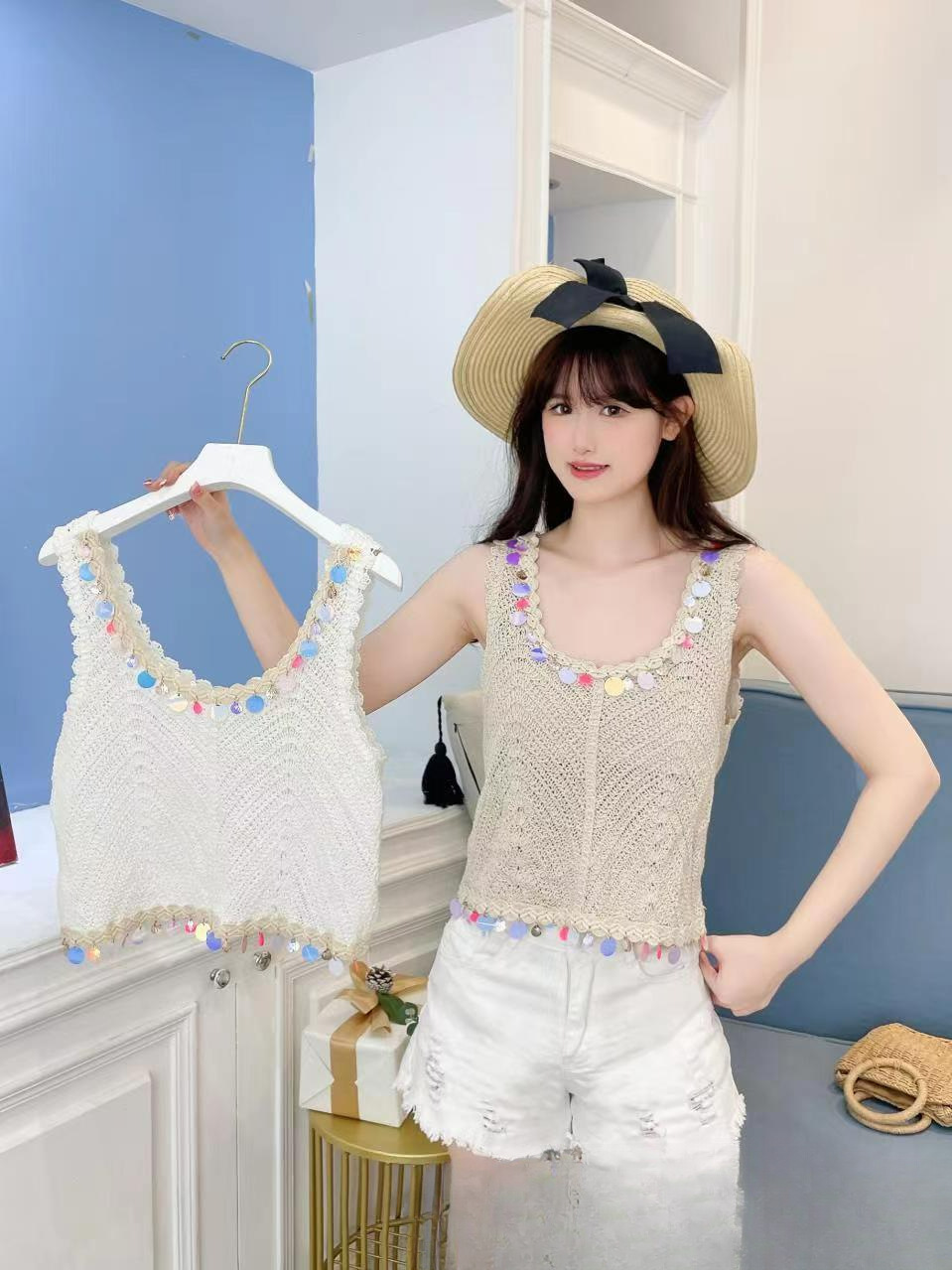민족 스타일의 세퀸 레트로 U-넥 조끼 여성 여름 디자인 센스 민소매 짧은 달콤한 니트 작은 슬링 탑스토어 가기