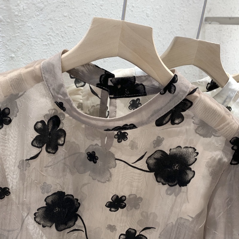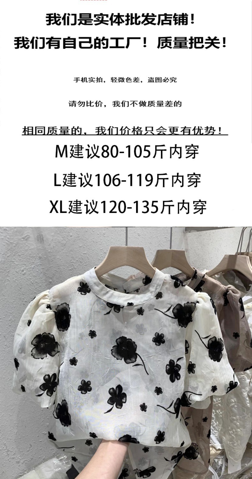 유럽 인쇄 버블 슬리브 쉬폰 셔츠 여성 여름 2023 새로운 스타일 배꼽 커버 외국 스타일 캐주얼 아름다운 탑