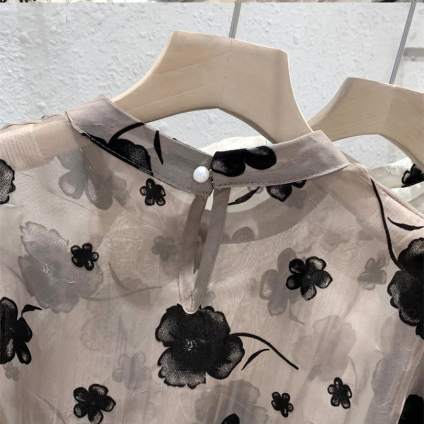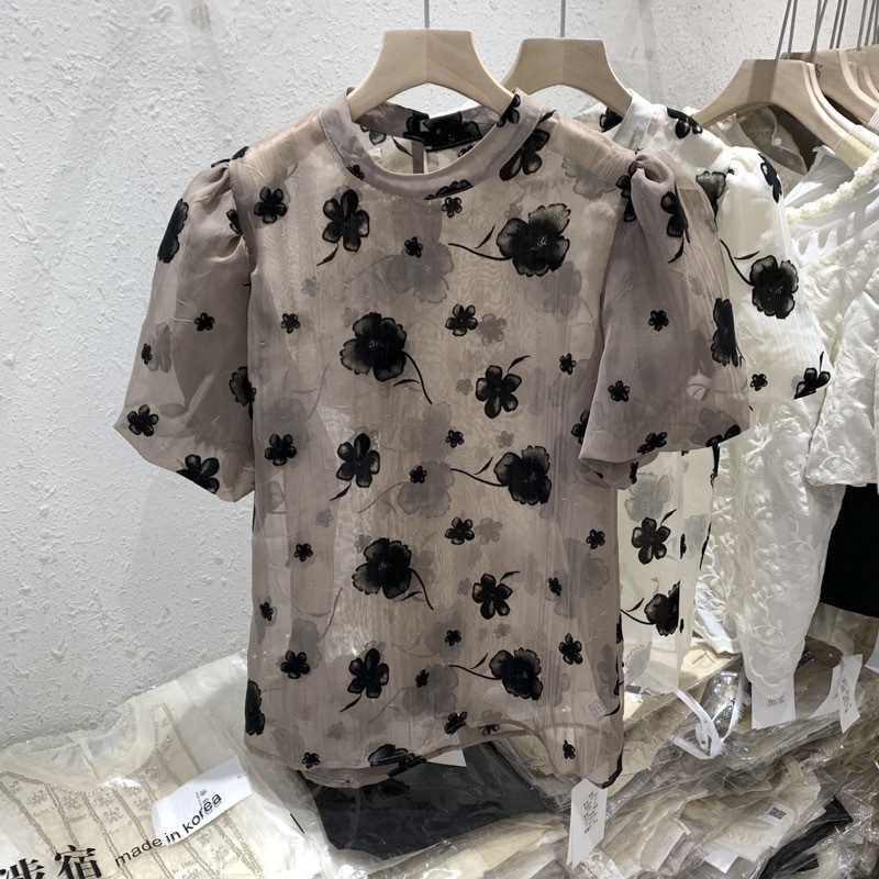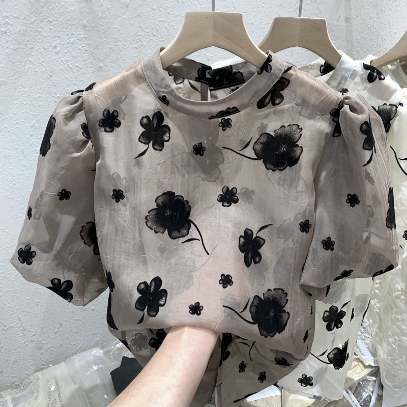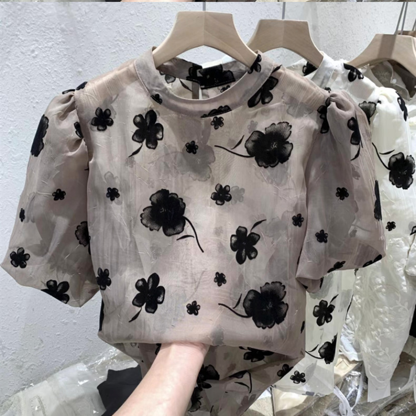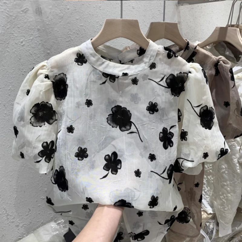 유럽 인쇄 버블 슬리브 쉬폰 셔츠 여성 여름 2023 새로운 스타일 배꼽 커버 외국 스타일 캐주얼 아름다운 탑스토어 가기