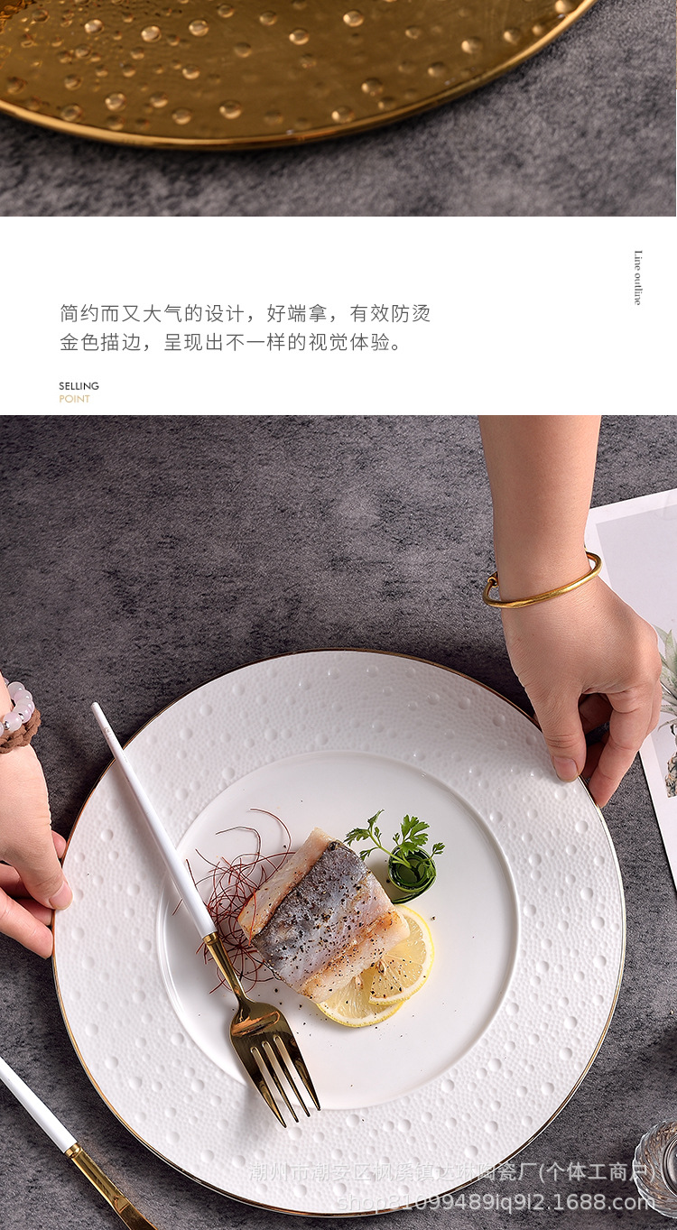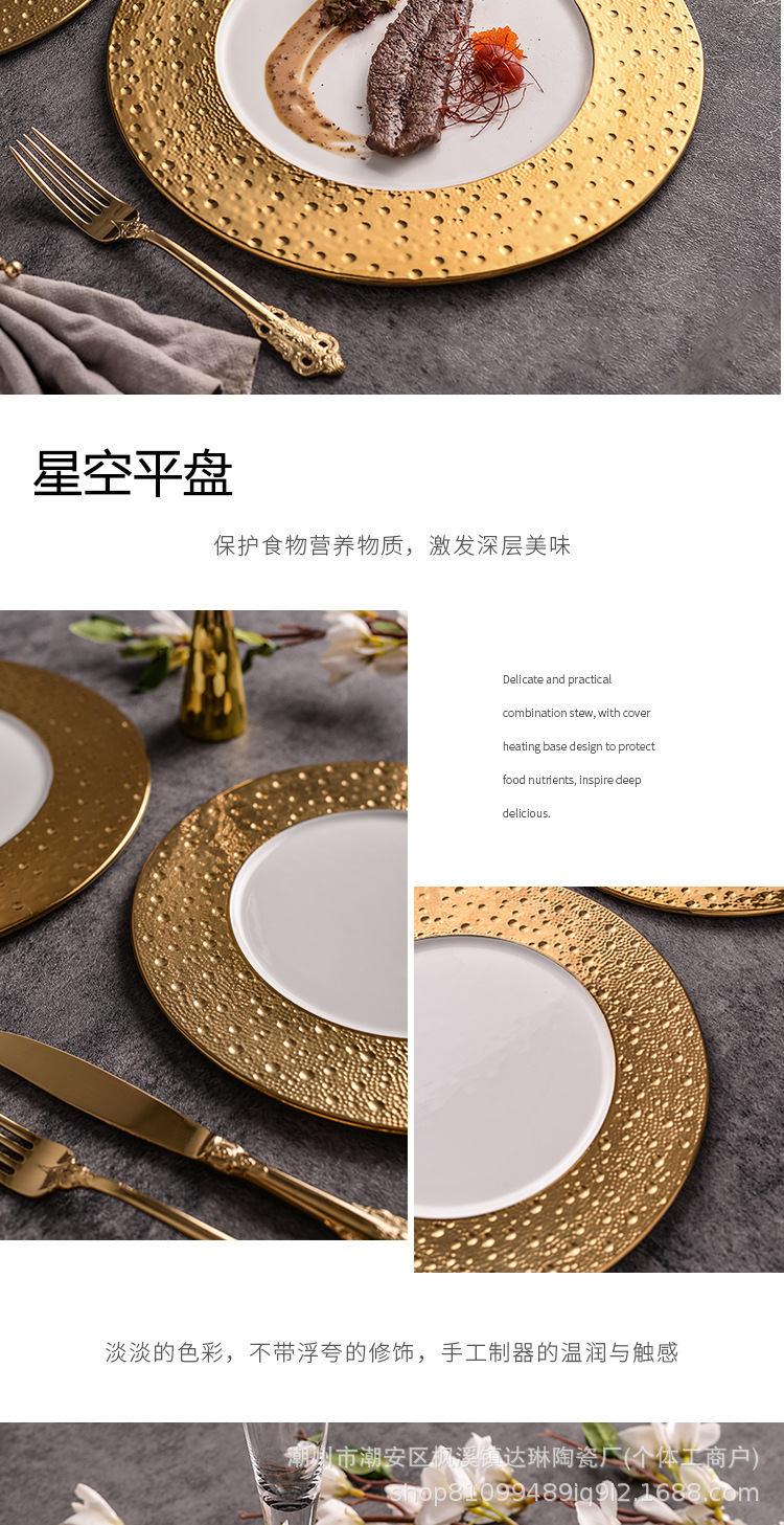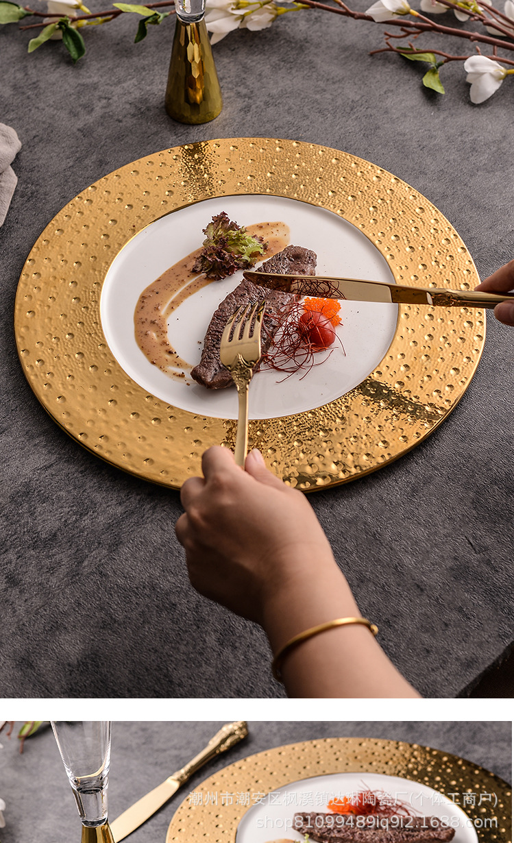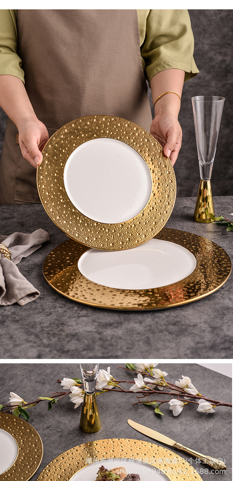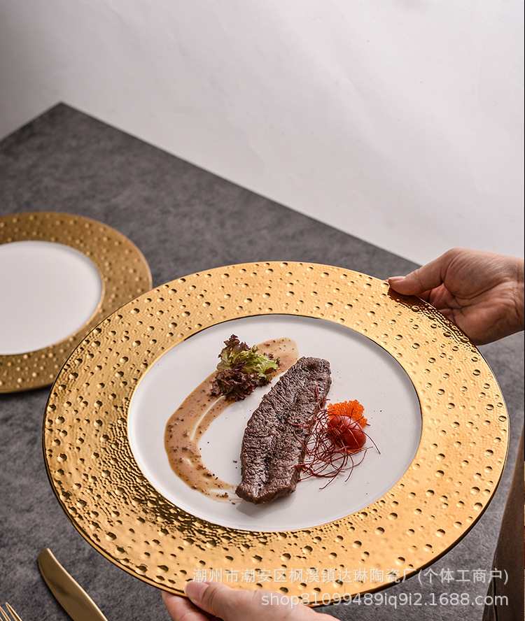 전기 도금 골드 세라믹 플랫 플레이트 스테이크 플레이트 크리에이티브 라이트 럭셔리 프놈펜 웨스턴 푸드 플레이트 호텔 하이 엔드 플레이트 수출 플레이트