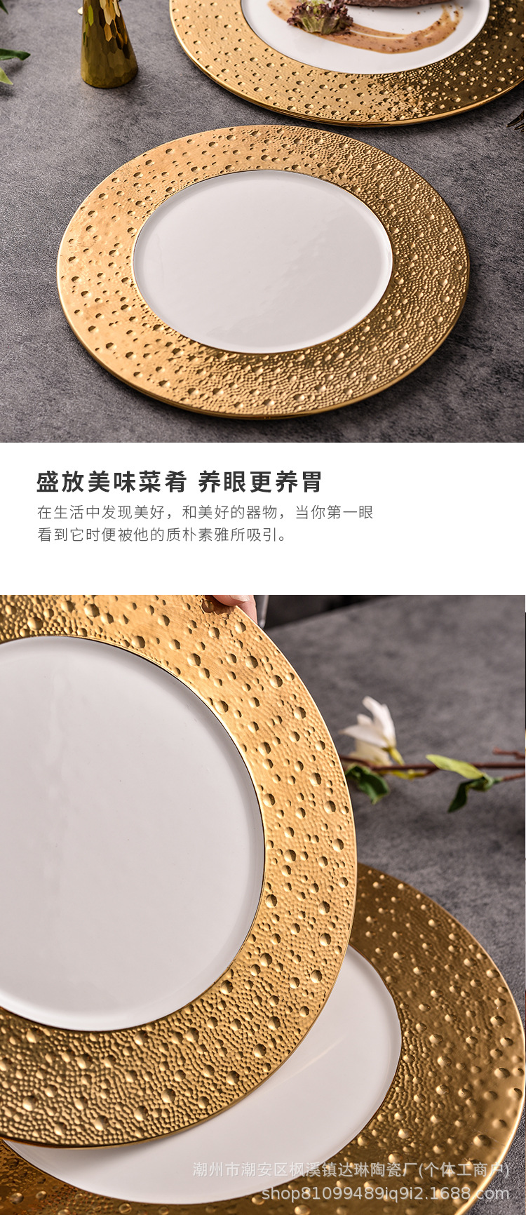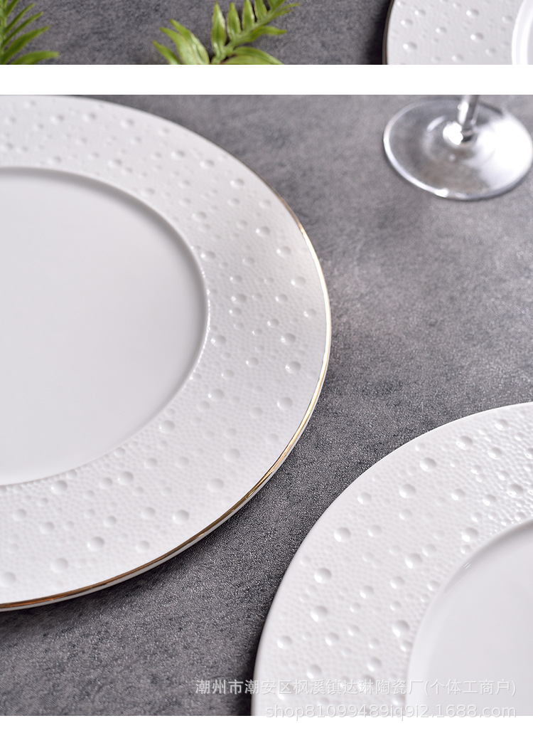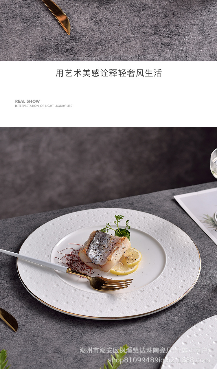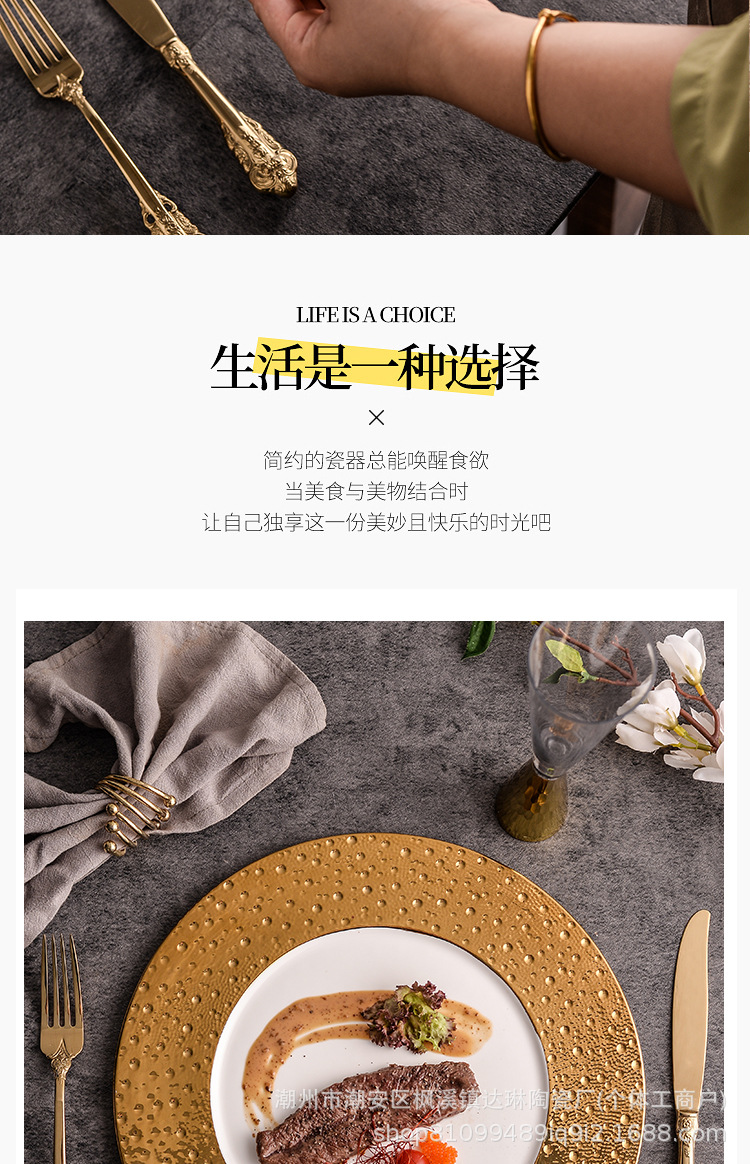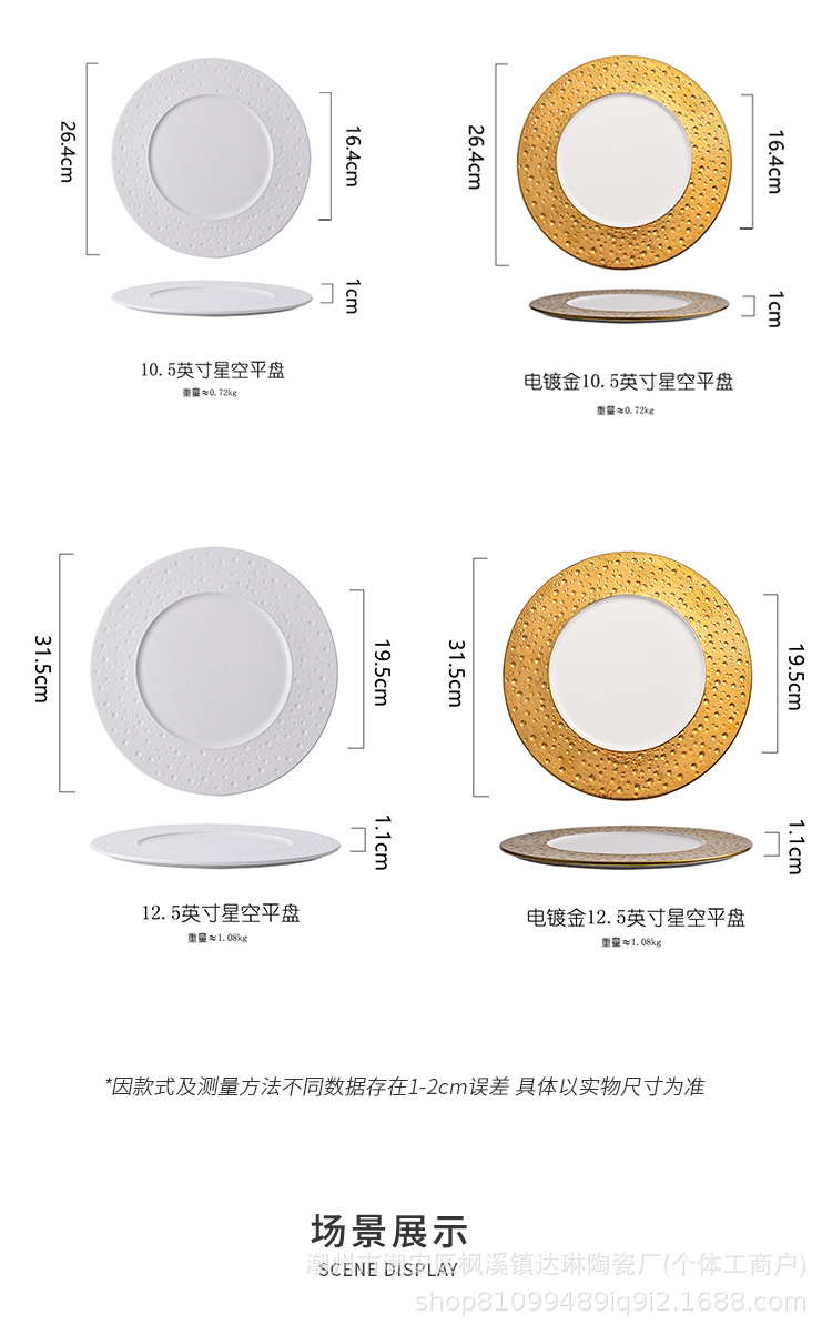 전기 도금 골드 세라믹 플랫 플레이트 스테이크 플레이트 크리에이티브 라이트 럭셔리 프놈펜 웨스턴 푸드 플레이트 호텔 하이 엔드 플레이트 수출 플레이트