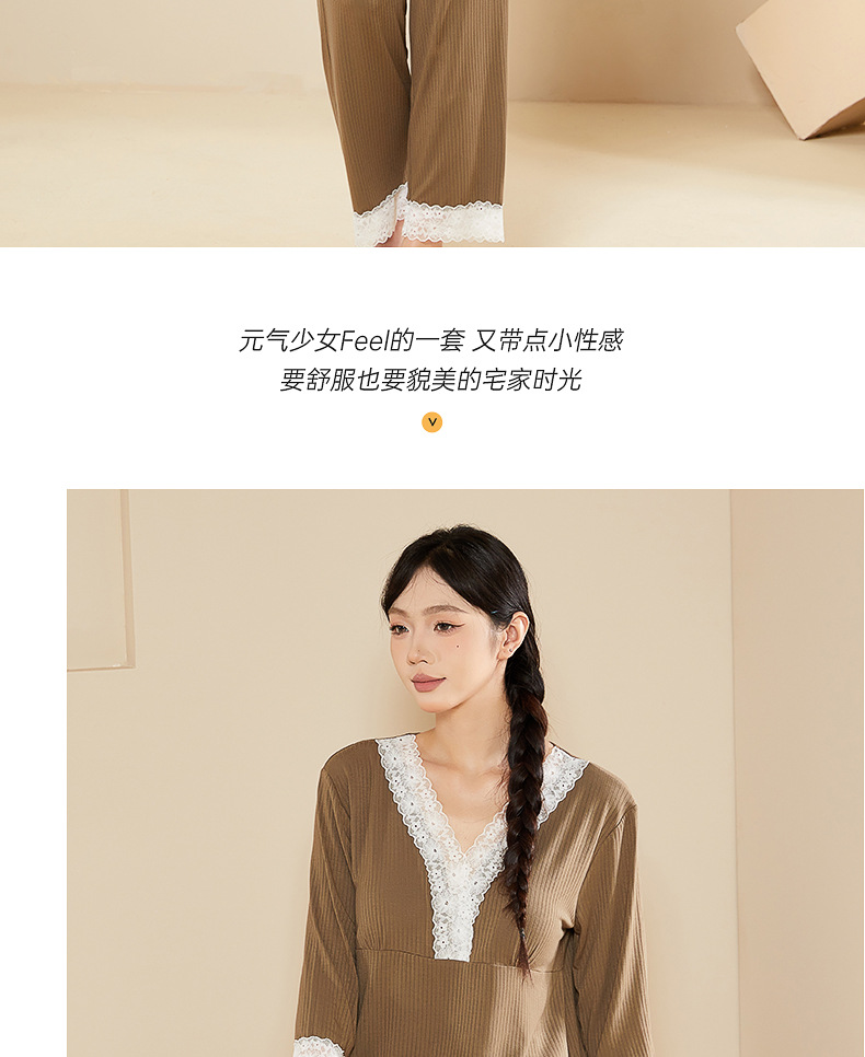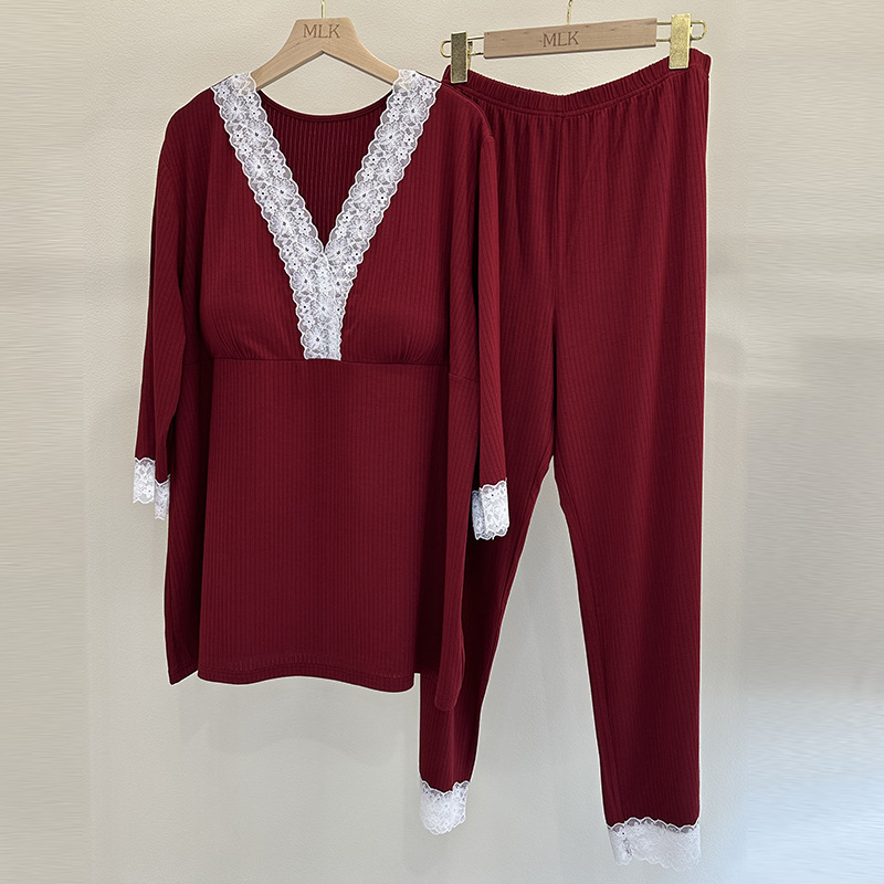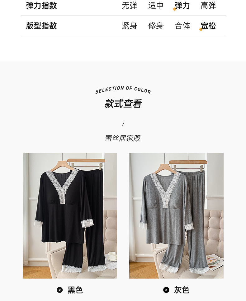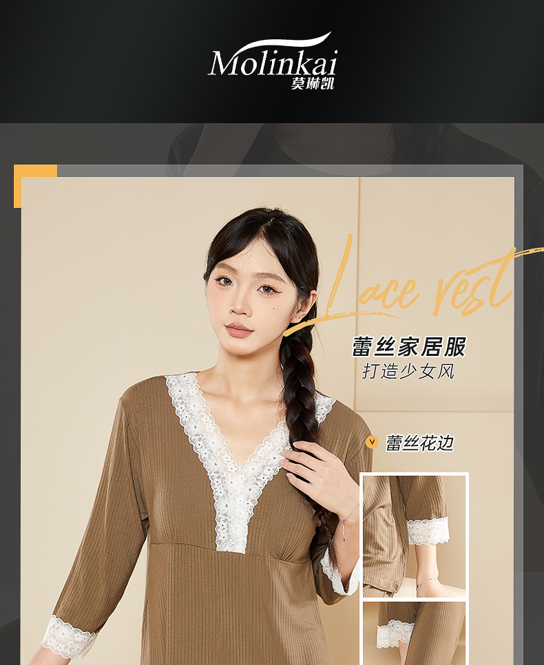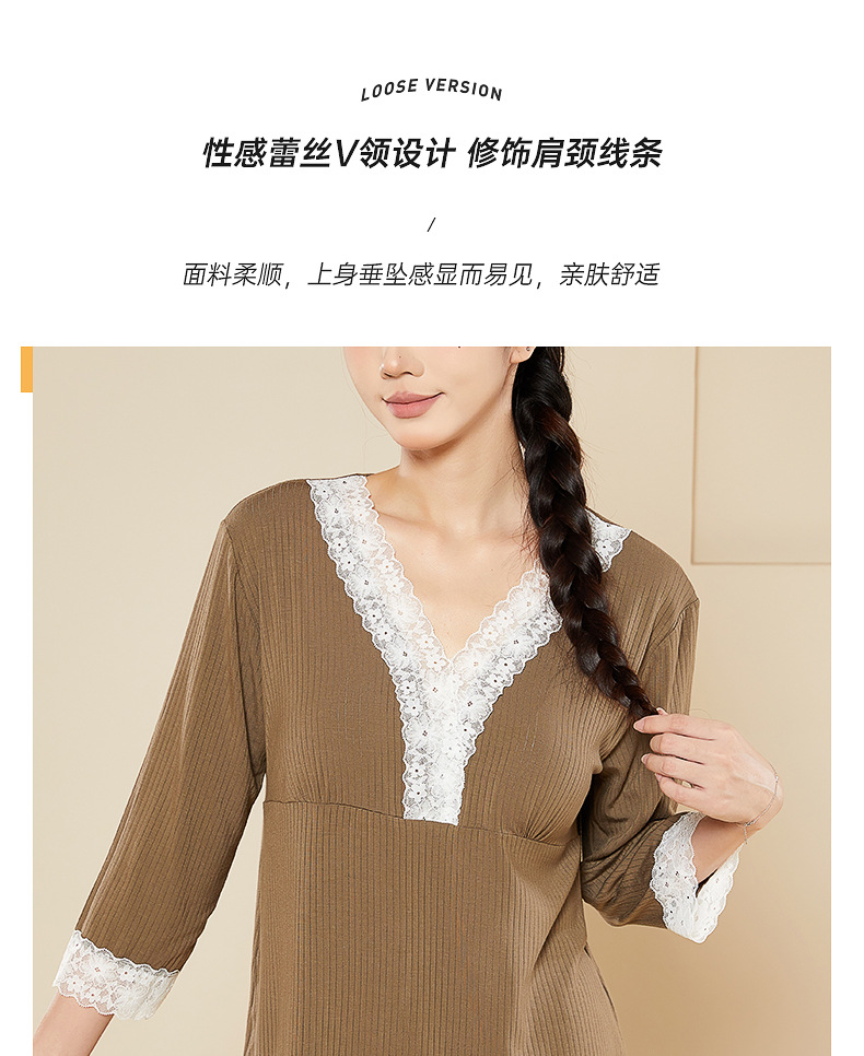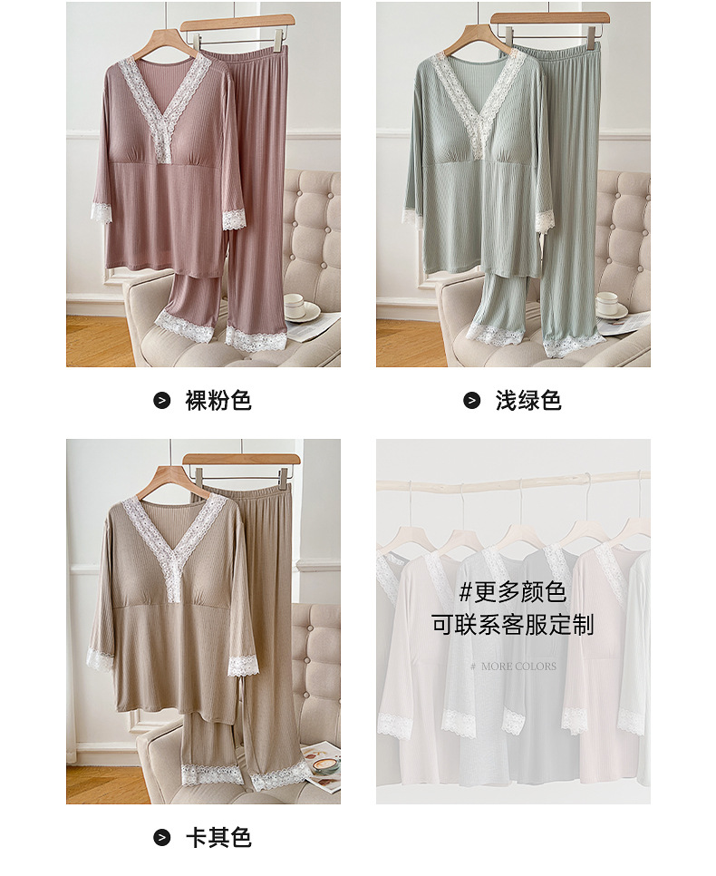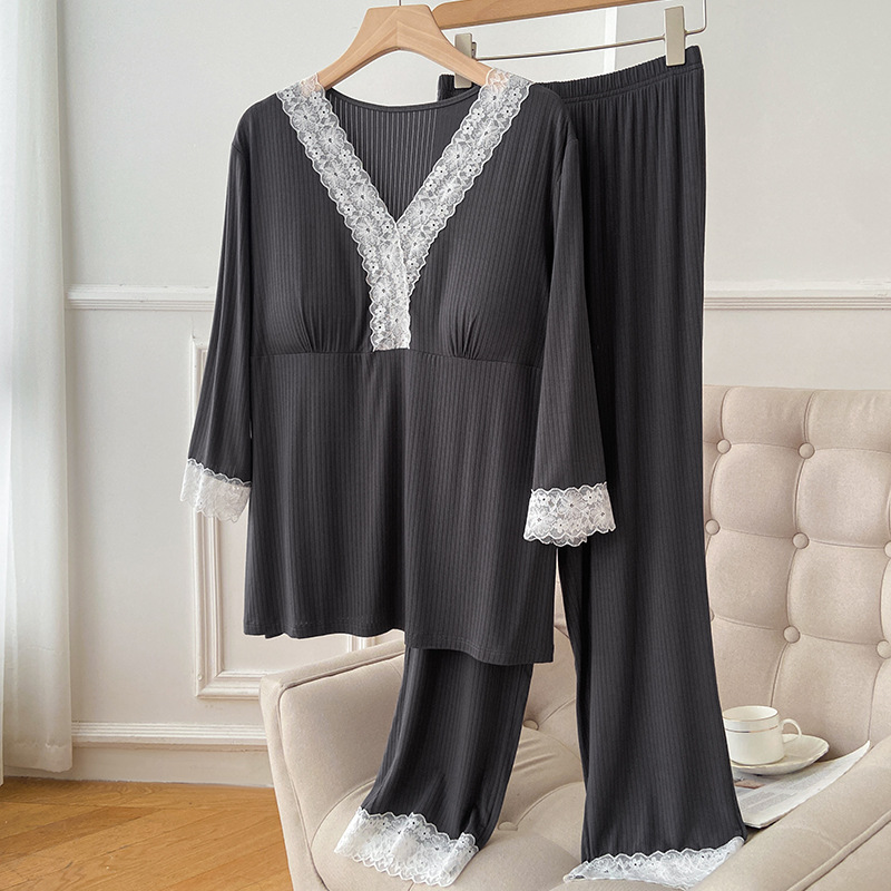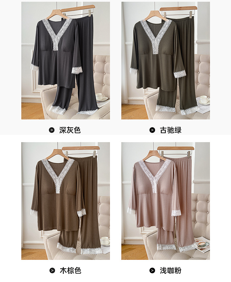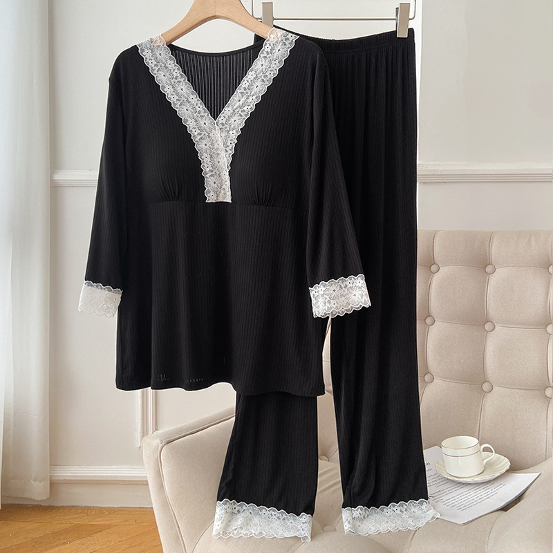 플러스 사이즈 여성 홈 의류 잠옷 세트 소녀 스타일 레이스 V-넥 잠옷 세븐 슬리브 가을 느슨한 잠옷