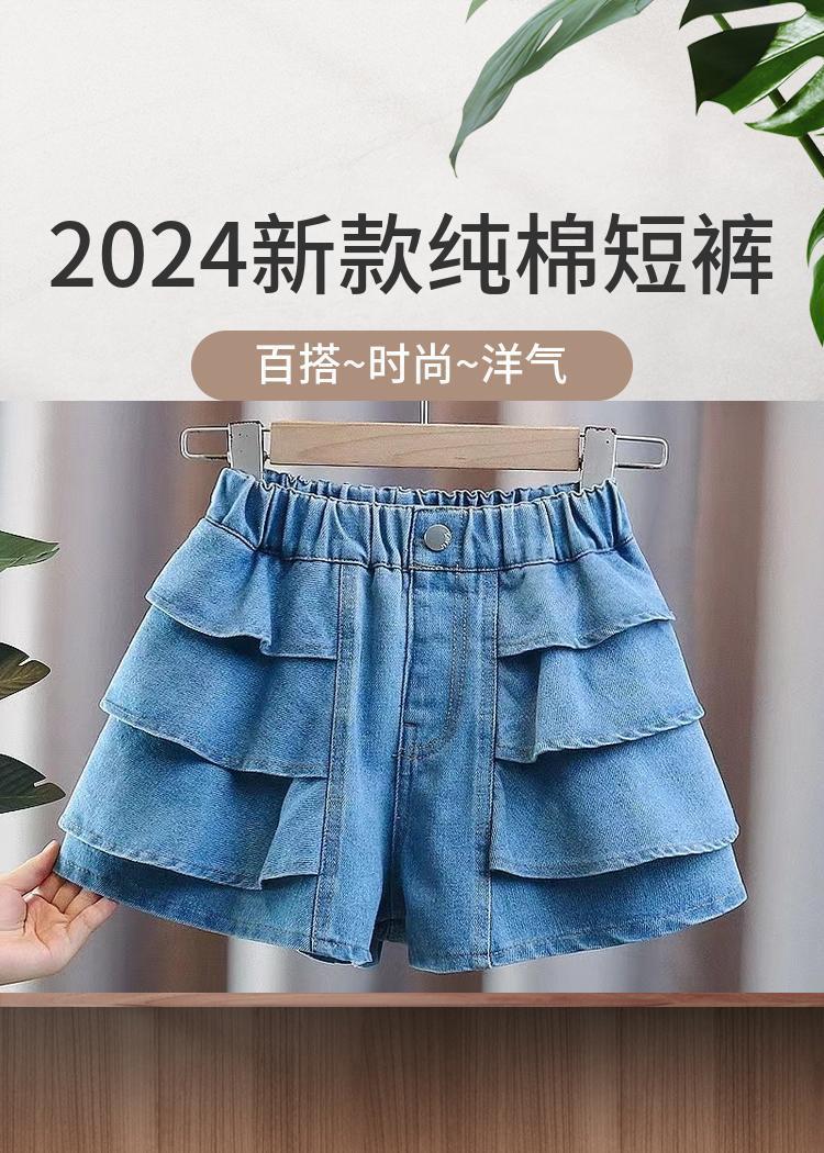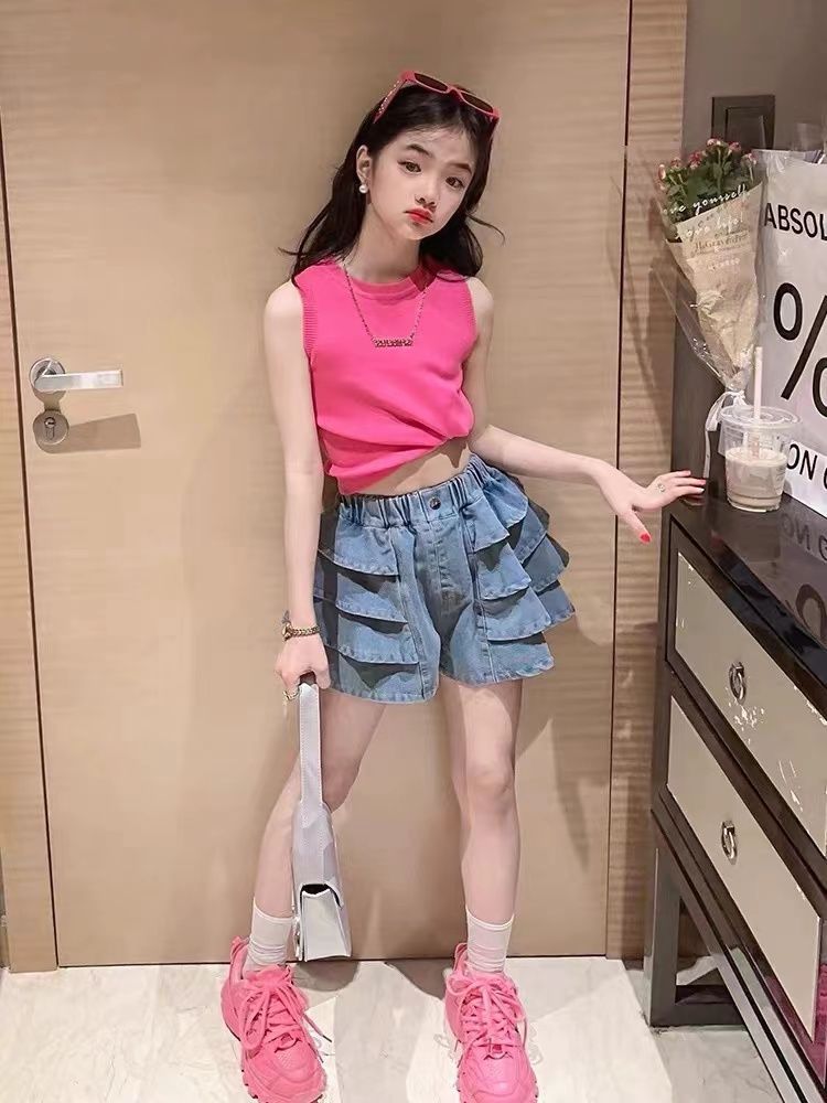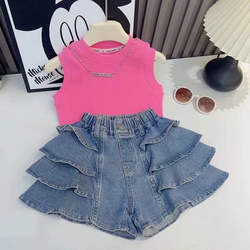 • 핑크색 면 조끼 + 얇은 데님 반바지 스커트